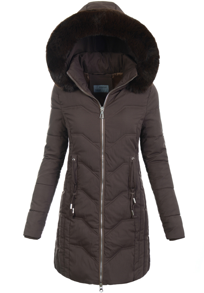 Nádherná dámska zimná bunda. Hnedá bunda. Bunda sa zapína na dvojitý zips. Má veľkú odopínateľnú kapucňu s krásnou, na dotyk príjemnou, odopínateľnou kožušinou. Dve veľké vrecká na zips sú ideálne na uloženie telefónu alebo kľúčov. Rukávy majú látkové manžety. Kvalita je zateplená syntetickým materiálom. Je vyrobená z najkvalitnejších materiálov. Bunda je zakončená podšívkou. Ideálne pre elegantný aj športový zimný štýl.