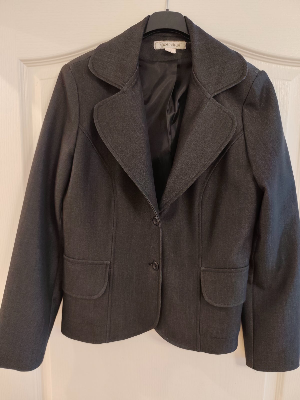 Predám dámske vintage sako tmavo sivej farby. Sako je pevného materiálu. Veľkosť písaná 36, ale sadí aj na 38.