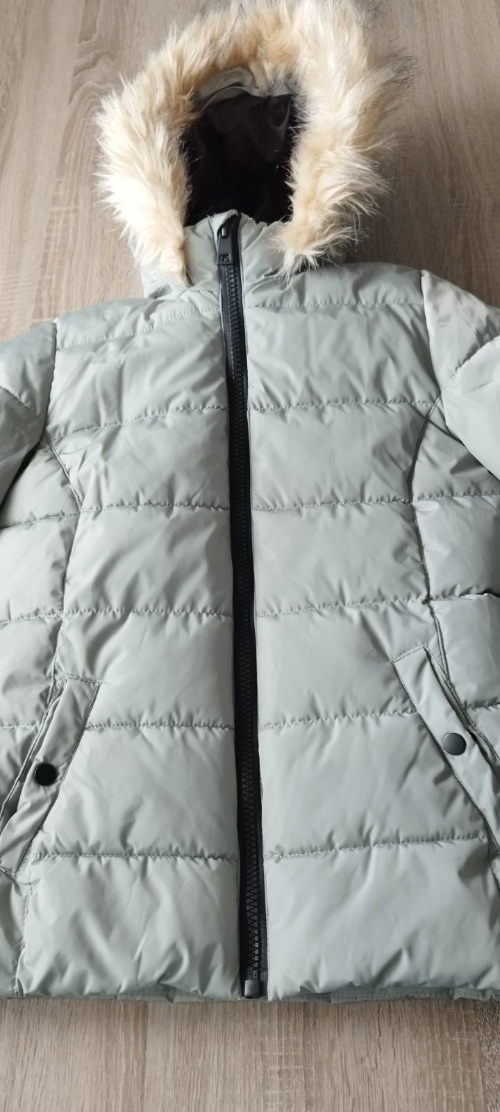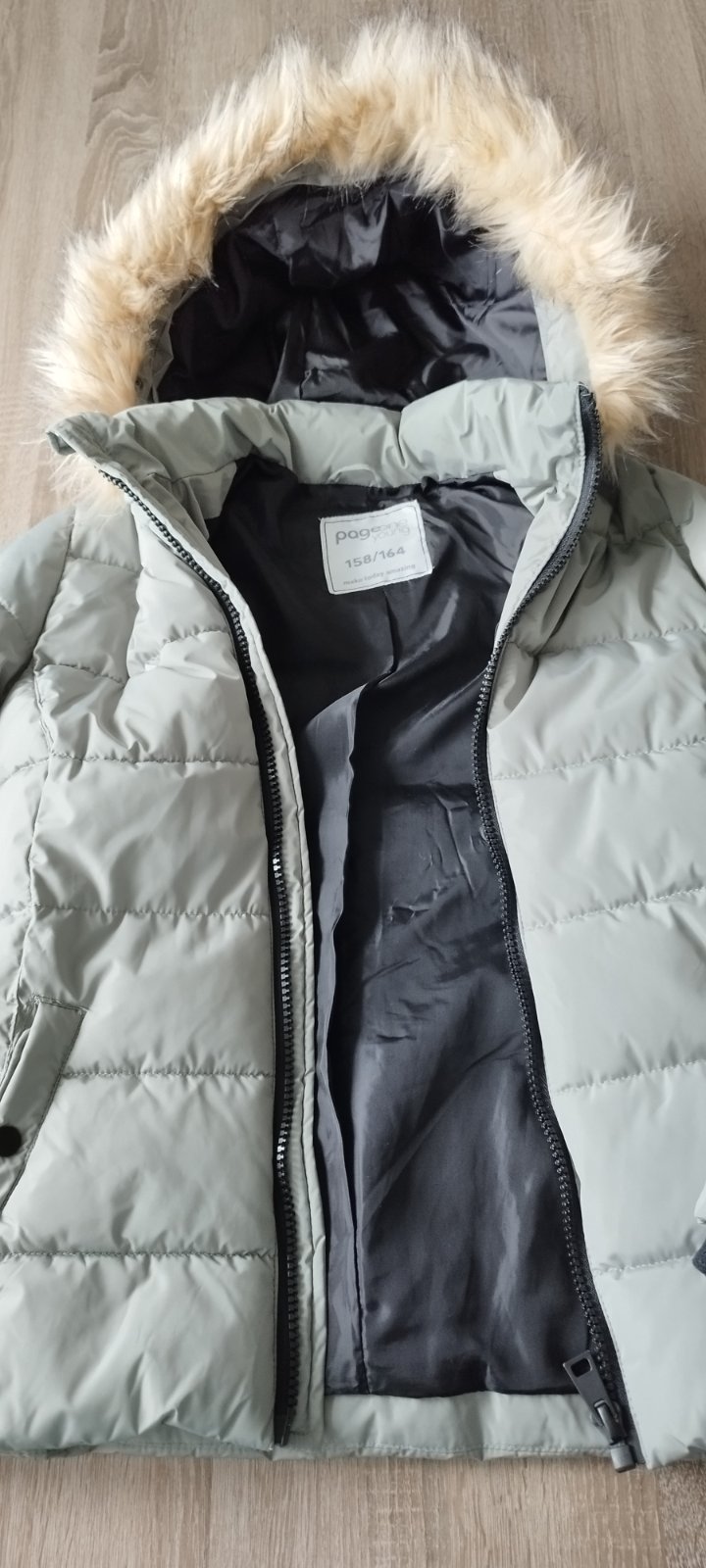 Zimná bunda 158/164 page young z Takka. Farba jemne pastelová zelenkavá. Celková dĺžka predný diel 63cm, celková dĺžka zadný diel 60cm. Rukáv od krku 71cm+patent 1cm. Spodný rukáv 46cm, šírka pod pazuchami 2x45cm. Kapucňa napevno , kožušinu viete odopnúť. Top stav, bez poškodenia.