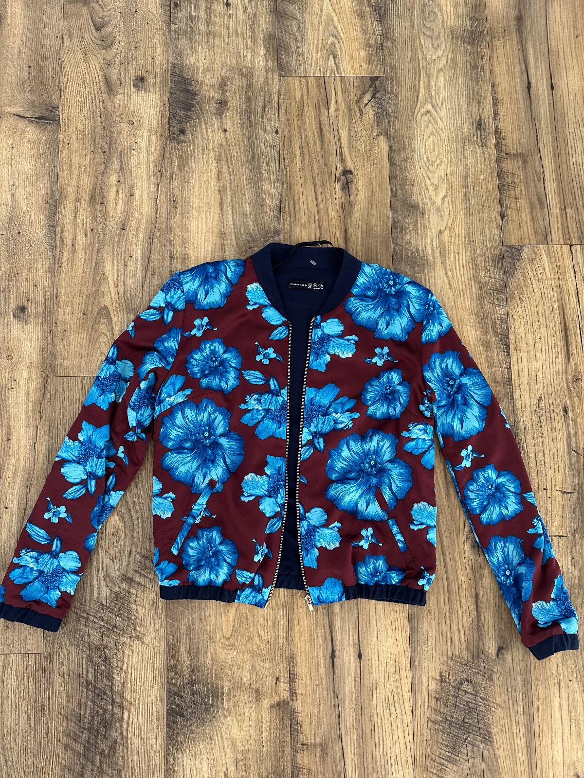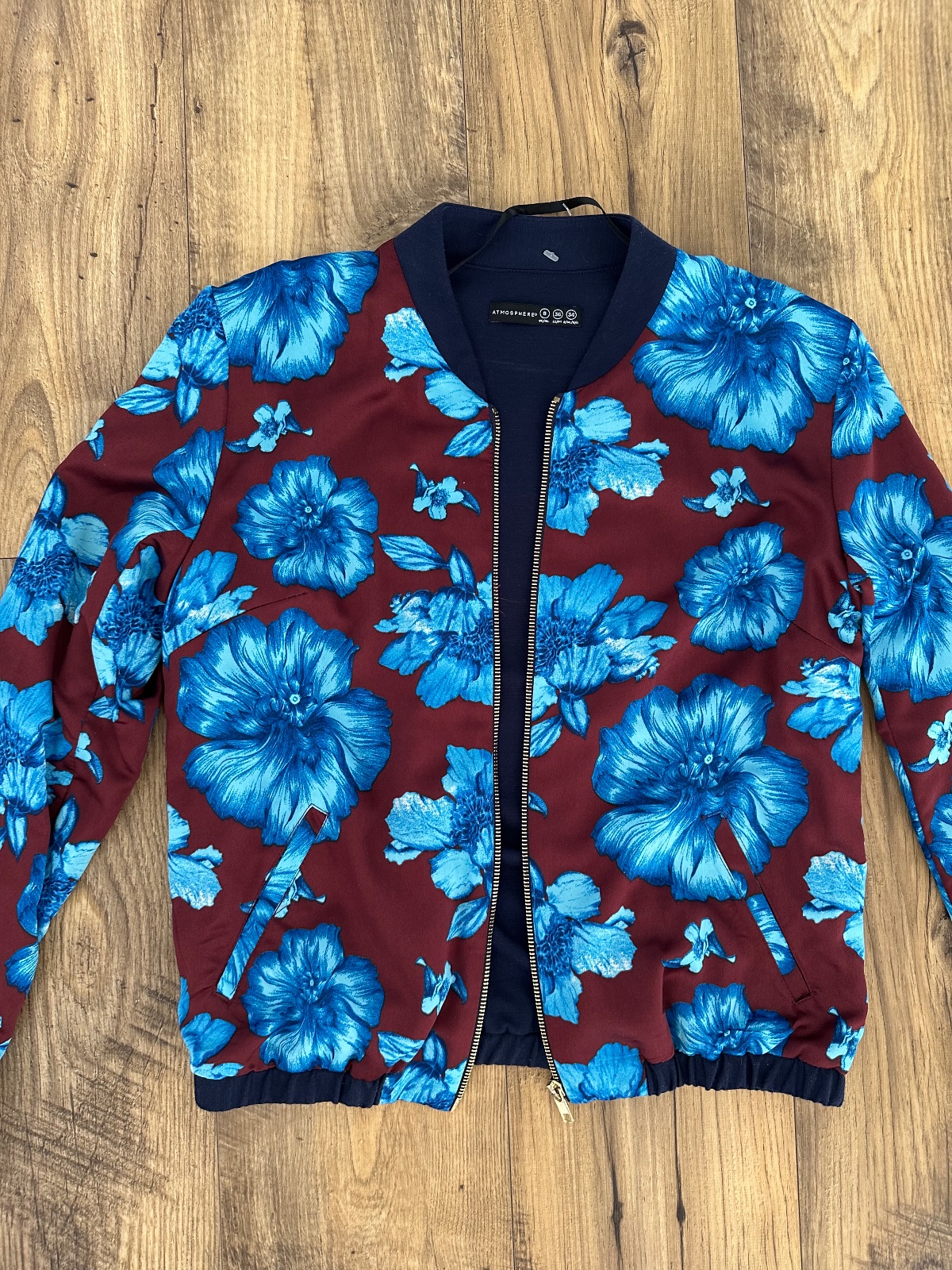ATMOSPHERE 100% kožená bunda hnedej farby, veľkosť označená 10/38 ale je menšia 36, vzorové futro s leopardími škvrnami, na ľavom rukáve malá škvrna, rozmery: d.-51cm, š.-2*46cm, dl.rukáva od ramen...