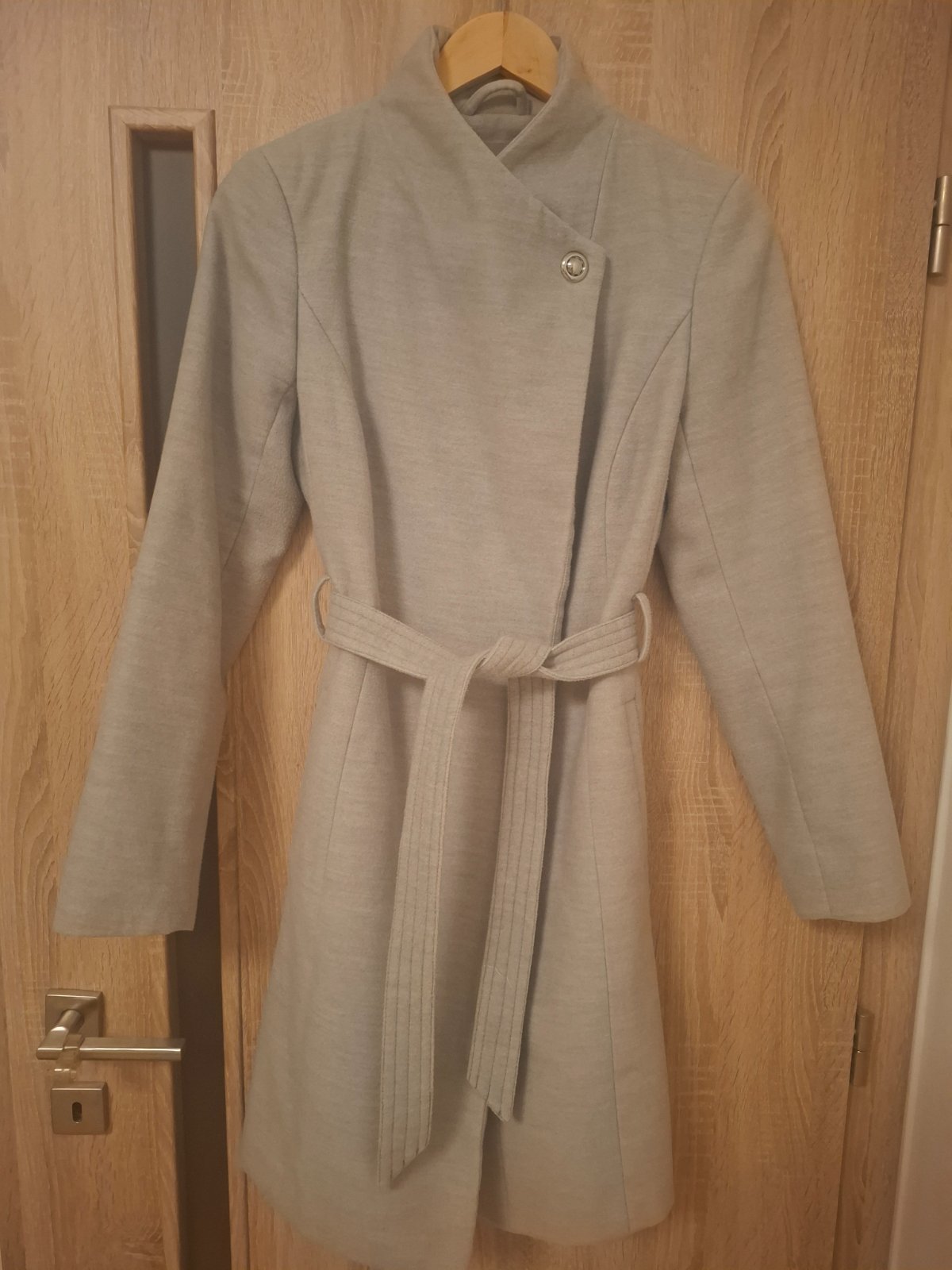 Svetlo šedý kabát Orsay, veľ.36, má minižmolky, inak bez poškodenia, stále pekný. Zapínanie na vnútorný zips a opasok. Rozmery: dĺžka 90, cez prsia 92,rukáv 61