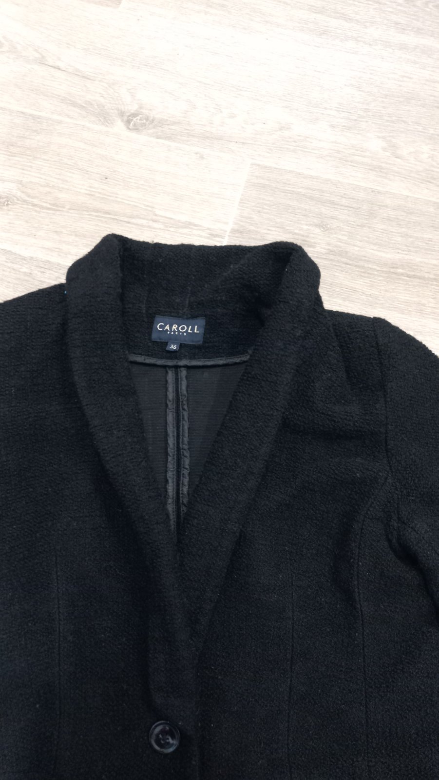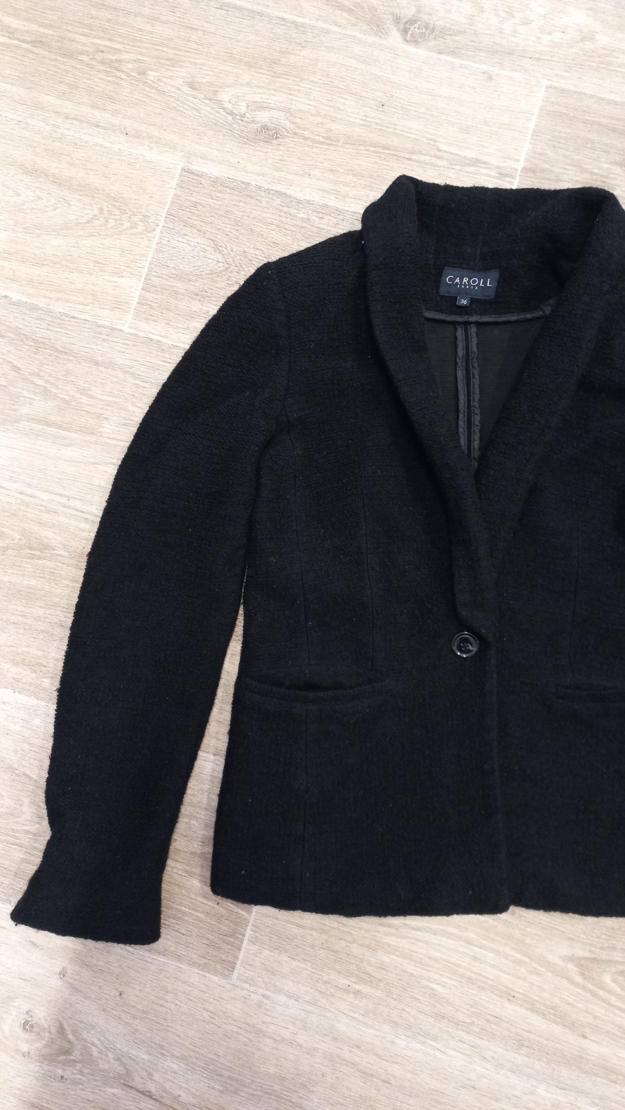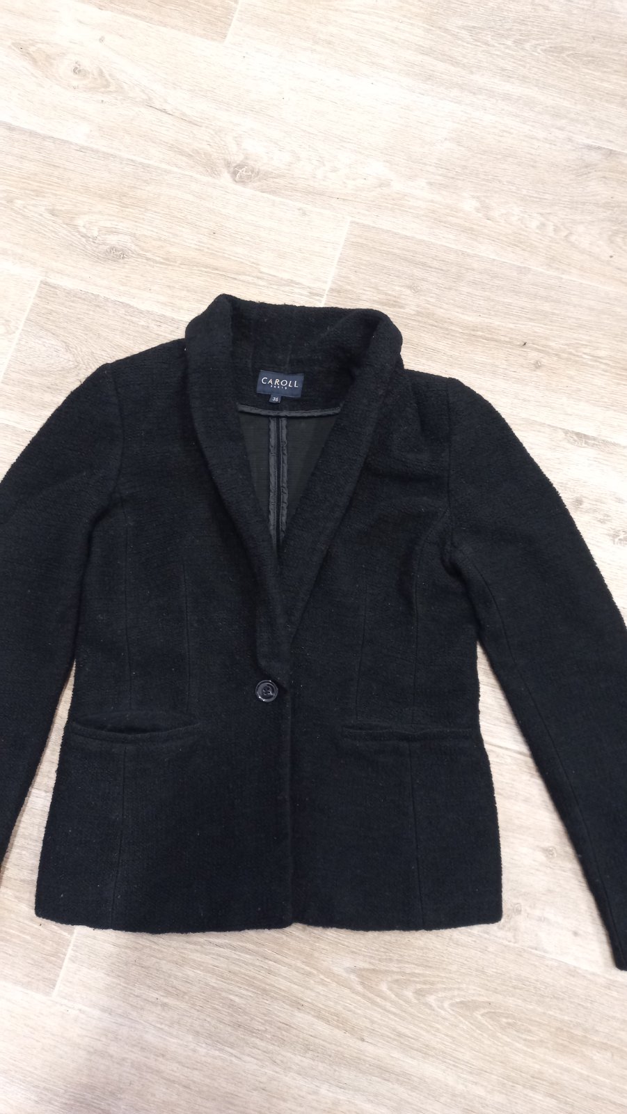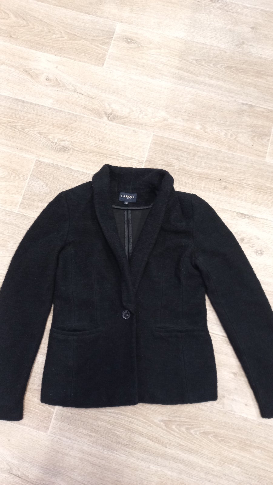 Čierne sako, uzlíčkový materiál. Šírka 47 cm, vhodné S/M veľkosť. Šálový golier. Zapínaniena jeden gombík: CAROLL