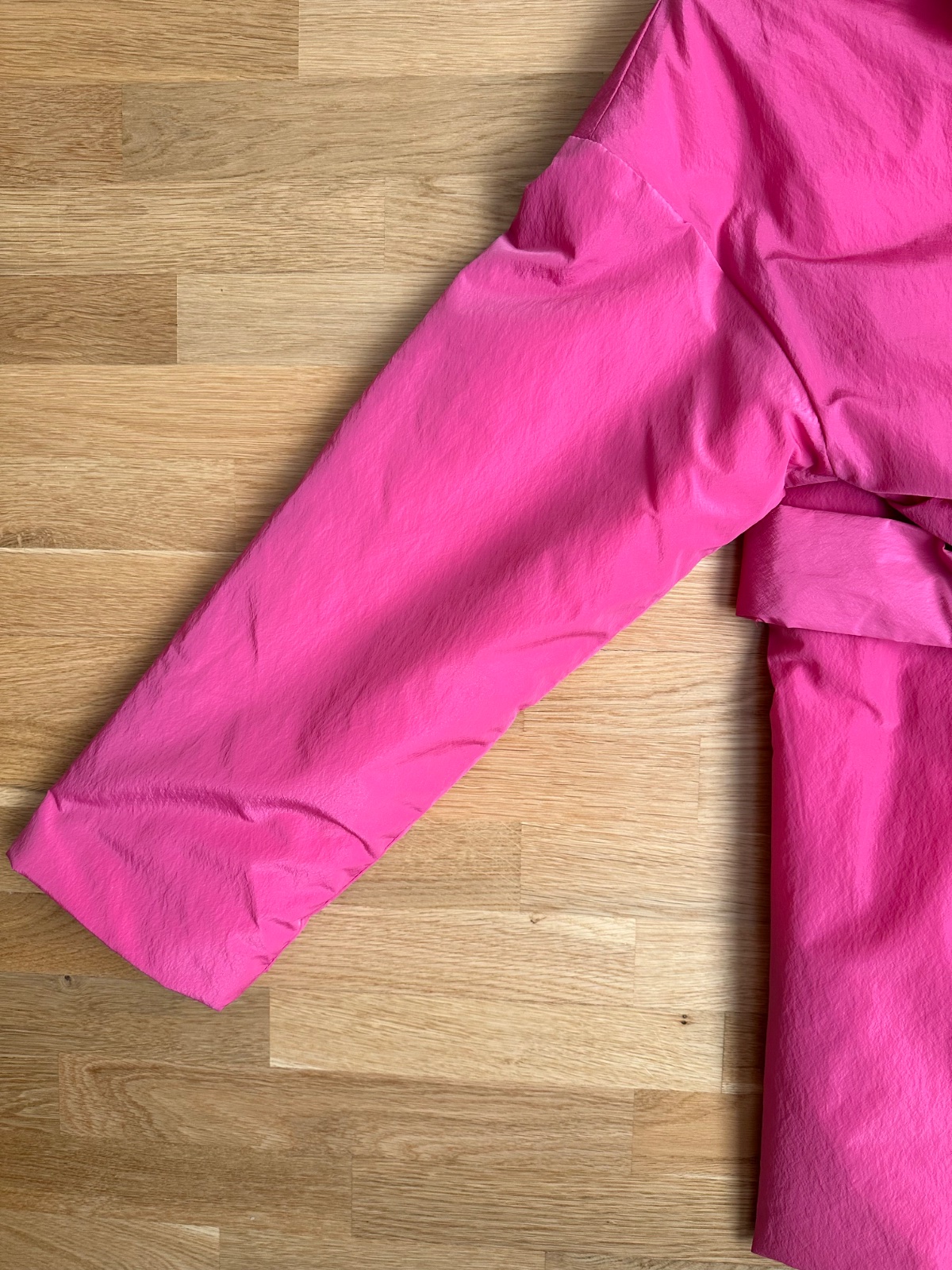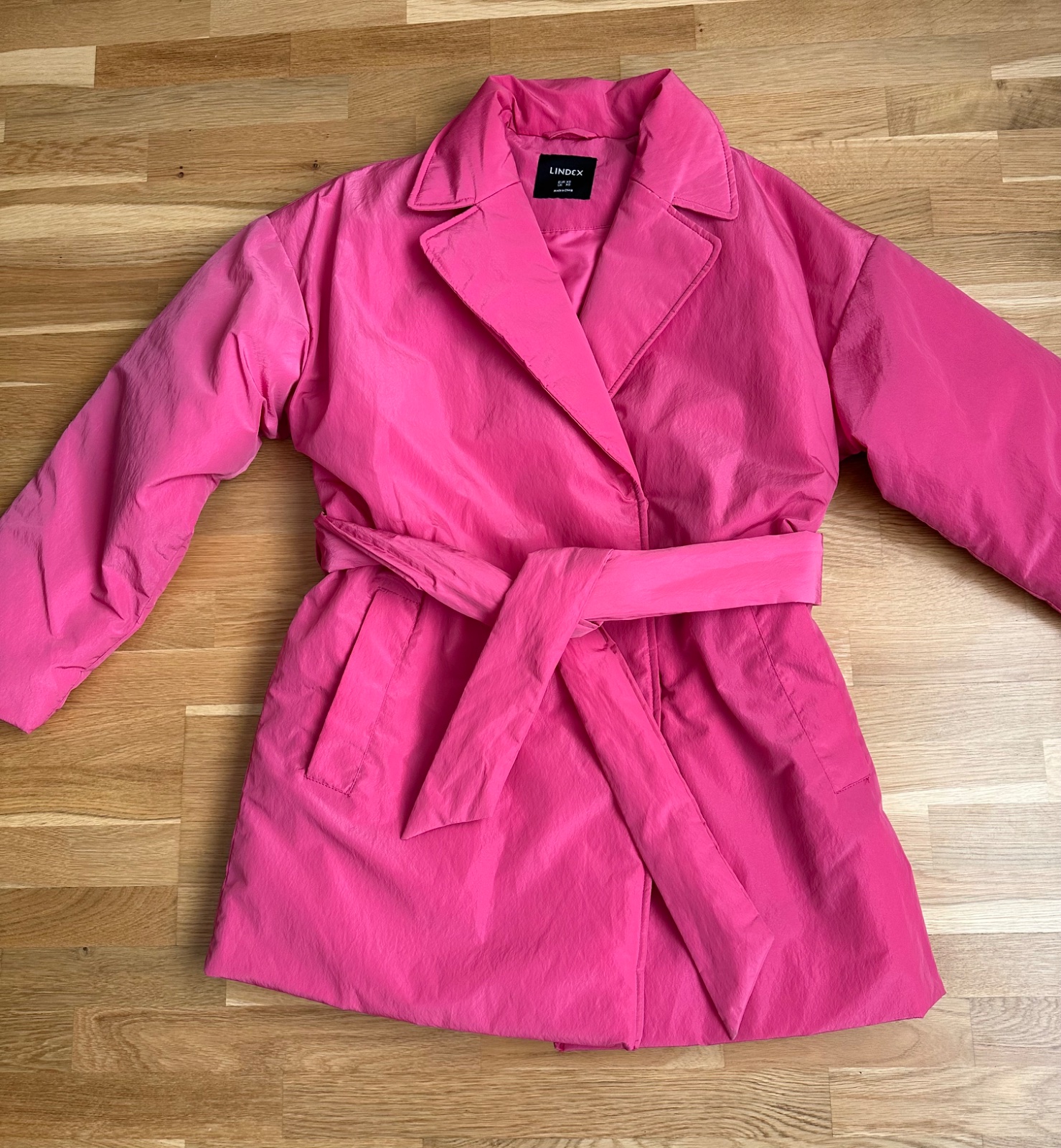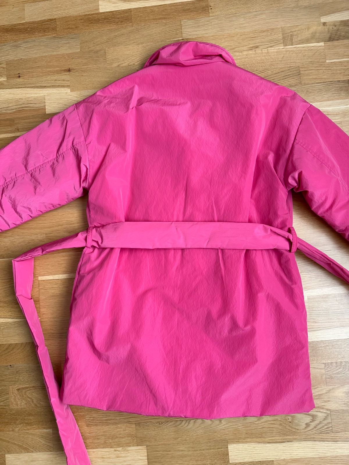 Kvalitný prechodný kabátik výraznej ružovej farby. Ľahký, príjemný na nosenie, pekne ukáže na postave. Materiál polyester, šušťáková úprava. Klasický strih s fazónkou, dvojradové zapínanie, dve bočné vrecká, opasok na zaviazanie v páse, jedno vnútorné vrecko. Mierne futrovaný, aj na slabú zimu, do vetra, dažďa. Dĺžka 84 cm, rukáv od krku 74 cm, šírka hrudník 2 x 59 cm. Top stav. K športovému aj elegantnému outfitu.