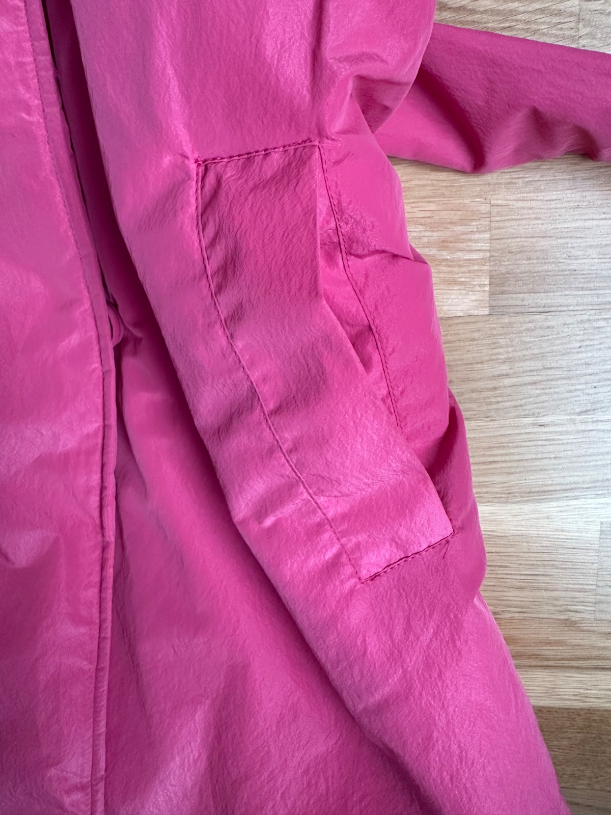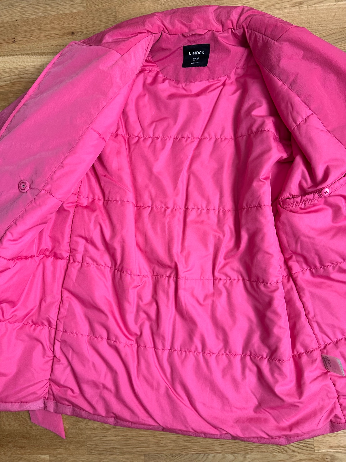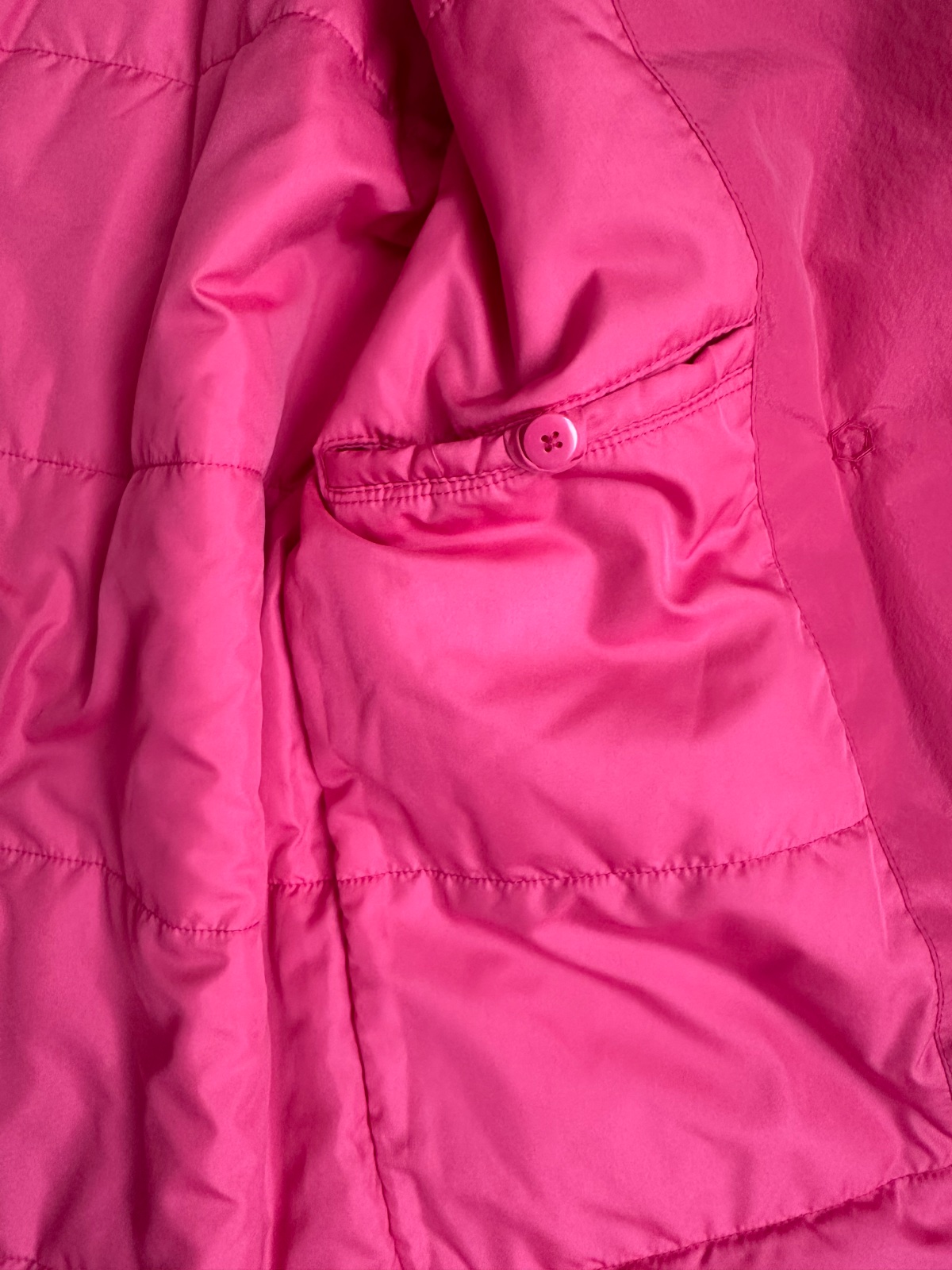 Kvalitný prechodný kabátik výraznej ružovej farby. Ľahký, príjemný na nosenie, pekne ukáže na postave. Materiál polyester, šušťáková úprava. Klasický strih s fazónkou, dvojradové zapínanie, dve bočné vrecká, opasok na zaviazanie v páse, jedno vnútorné vrecko. Mierne futrovaný, aj na slabú zimu, do vetra, dažďa. Dĺžka 84 cm, rukáv od krku 74 cm, šírka hrudník 2 x 59 cm. Top stav. K športovému aj elegantnému outfitu.