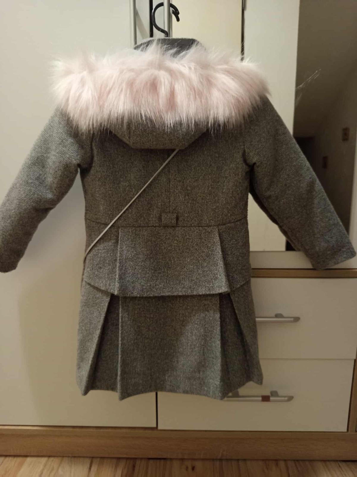 Pekný kabátik pre cca 6ročné dievčatko. Dole chýbal gombík, tak som prišla zhora. Iné chybičky nemá. Farba pekná tmavo fialová, len sa mi nedalo odfotiť.