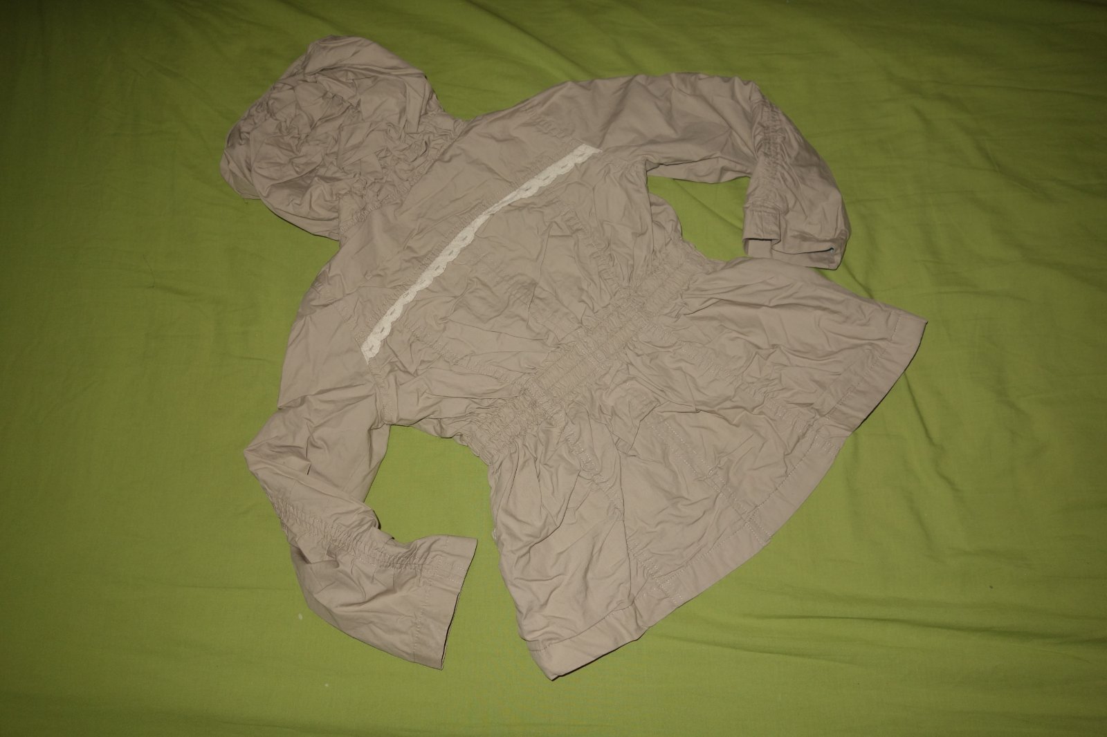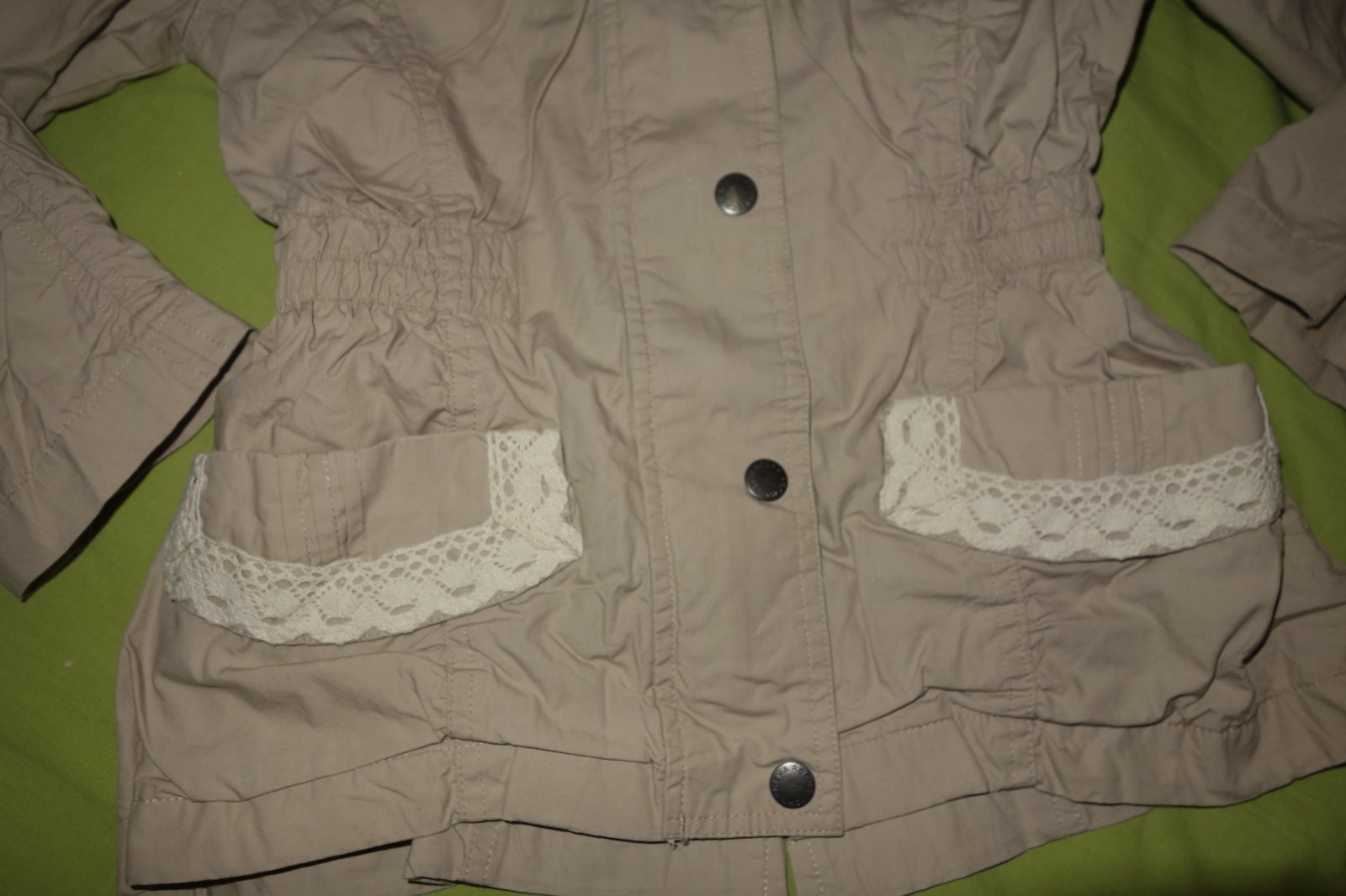 Krasna bundicka vo velmi dobrom stave- nasla som par slabych fliacikov na rukave. Je tenka, len podsita. Rukavy su roll up.