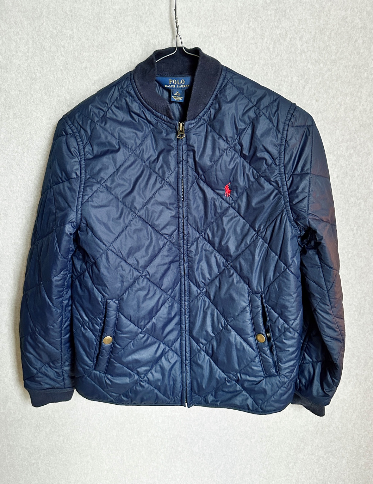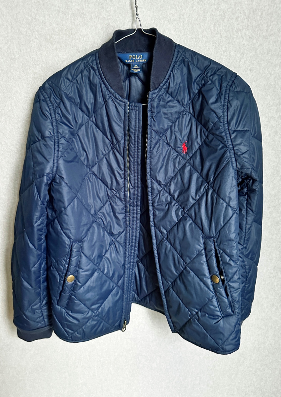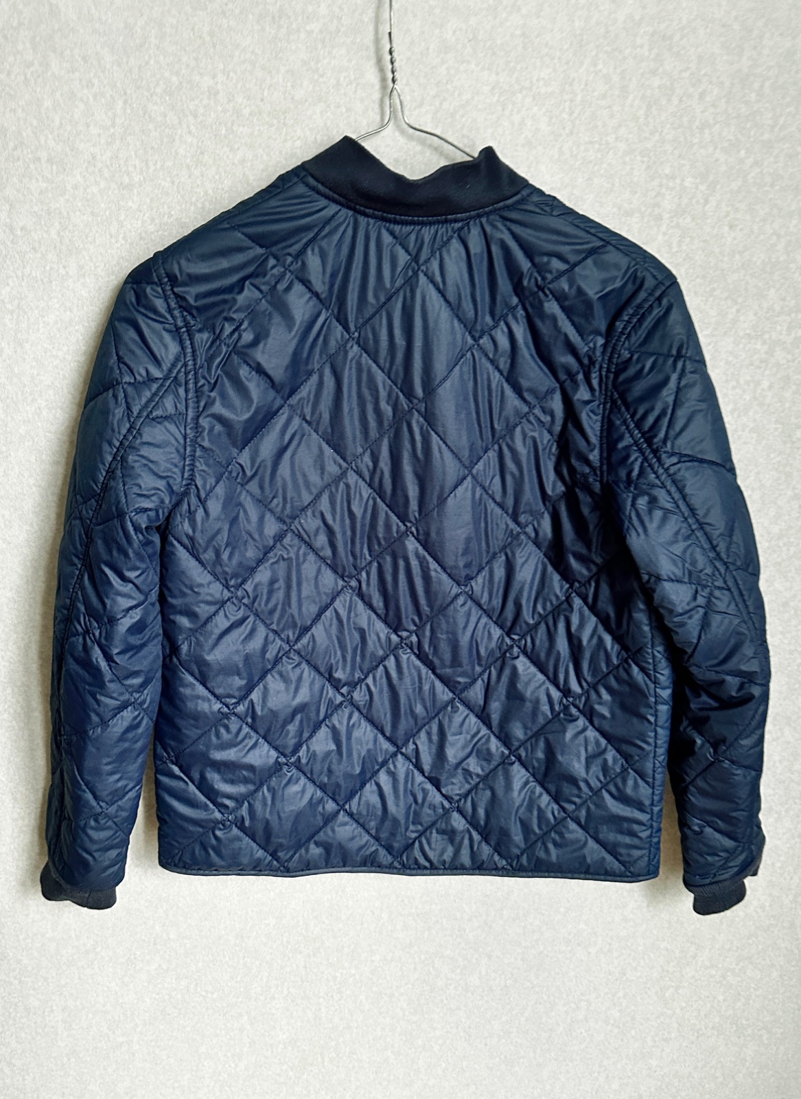 Zateplená prešívaná bundička z príjemného hebkého materiálu. Je skôr na slabšiu zimu alebo prechodné obdobie. Vpredu sú vrecká so zapínaním na cvokový gombík. Zapínanie bundy je na zips. Uvedená veľkosť M 10/12 rokov. Rukávy majú úpletové patenty z bavlny. V super stave, bez poškodení.