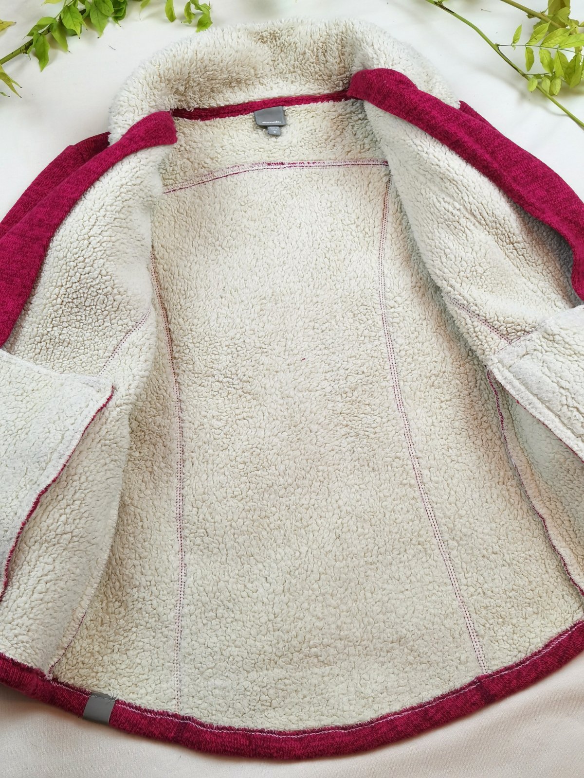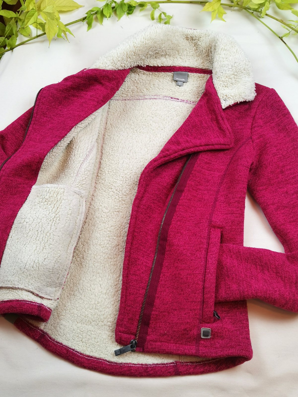 Ponúkam teplučkú cool bundičku s asimetrickoým zapínaním na zips v sýto ružovej farbe. Je podšívaná do imitácie ovčieho rúna a preto hreje! Rukávy sú predĺžené s otvorom na palec. Bundička má po stranách vrecká na zips. Vysoký golier zo zapínaním na gravírované cvoky. Má anatomicky tvarovaný strih.