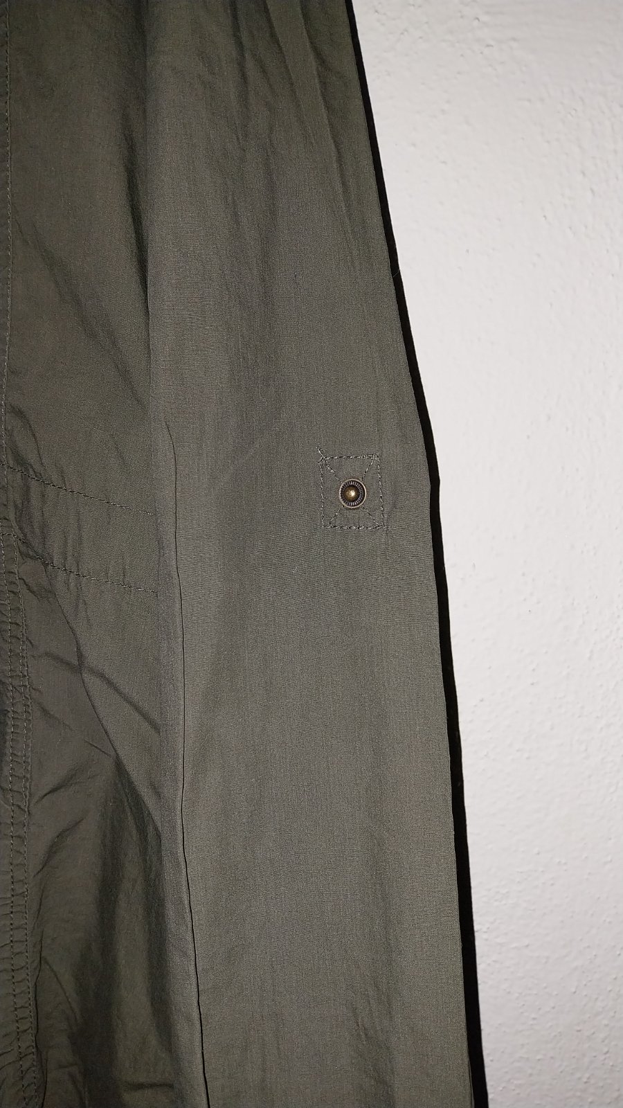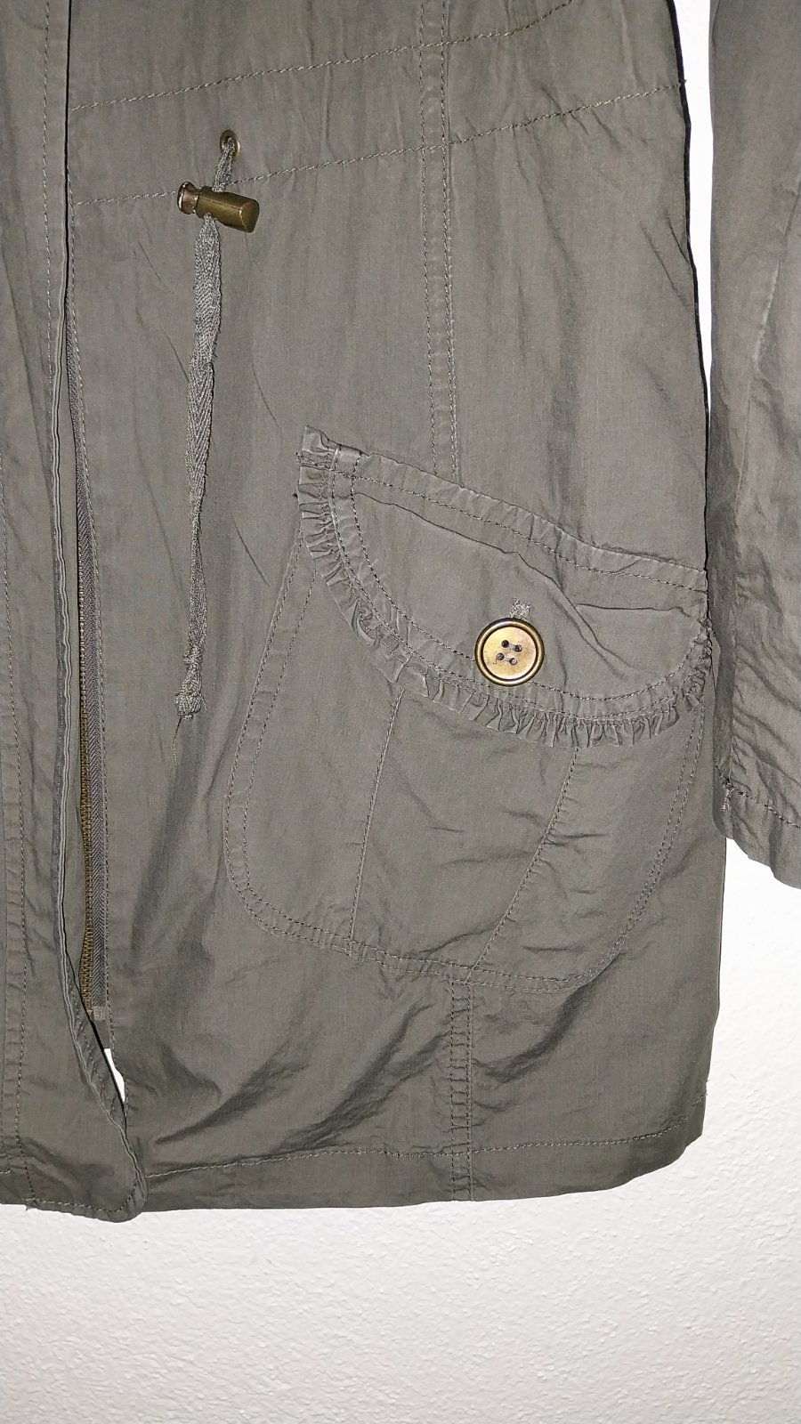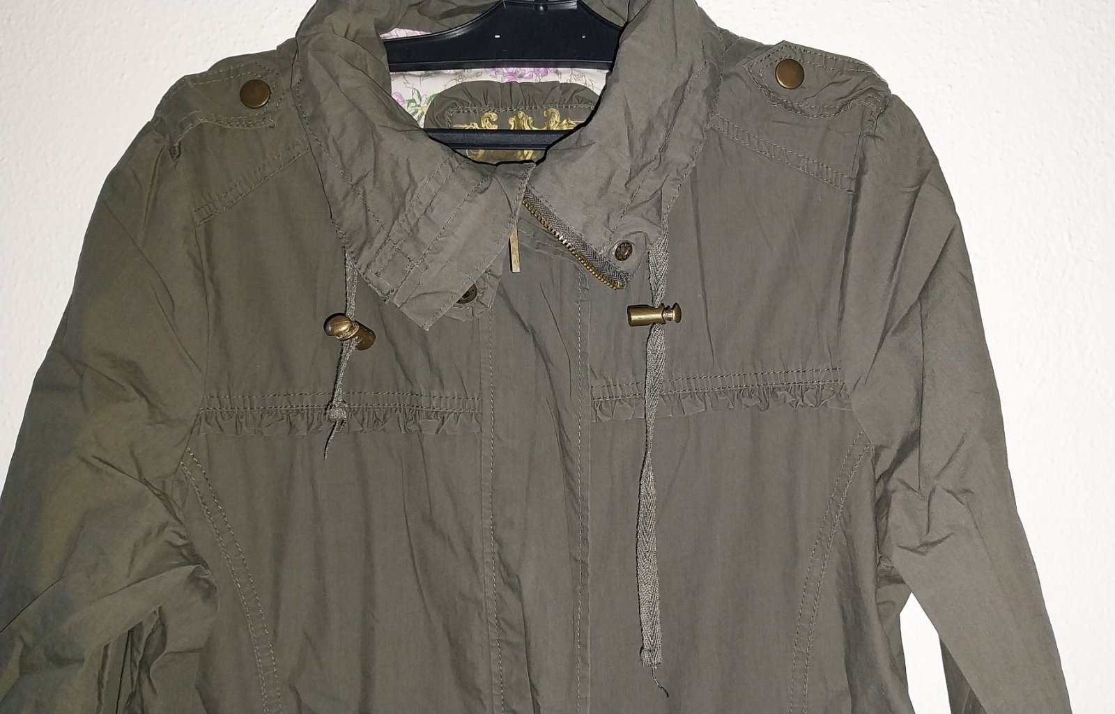 Olivová bunda - párka zn. Denim Co na jar/jeseň, ale v pohode aj chladné dni v lete. Nie je podšitá. rukávy sa dajú zrolovať a zapnúť. Sťahovanie šnúrkou v páse. Veľkosť UK14, zodpovedá veľ. M/L.