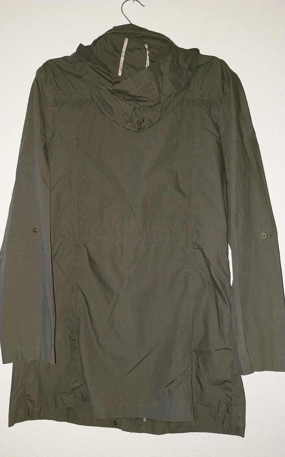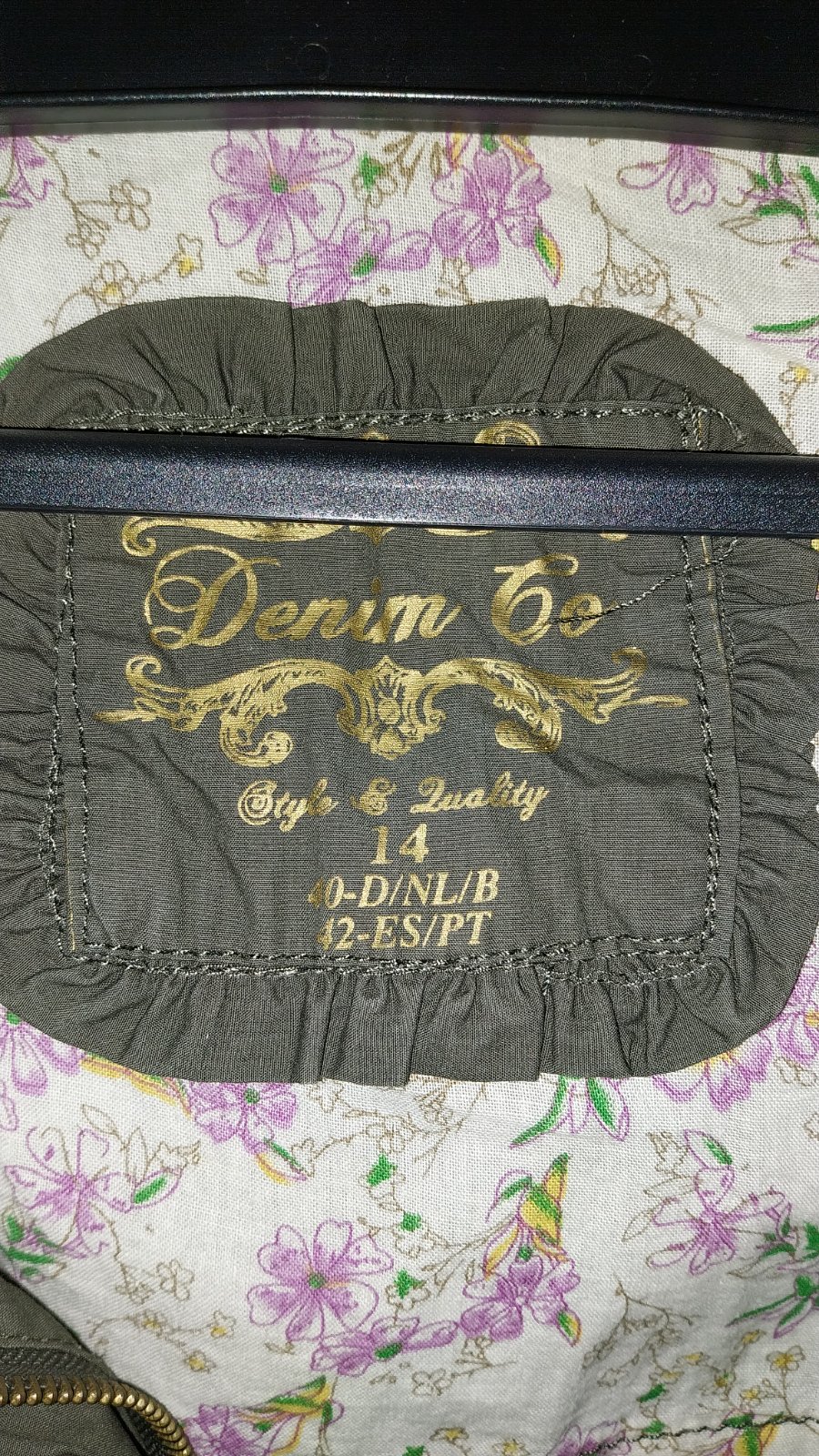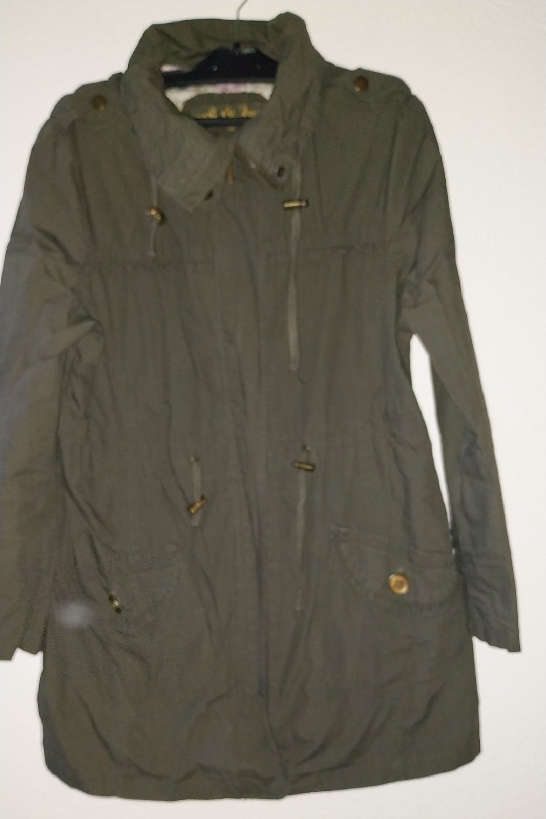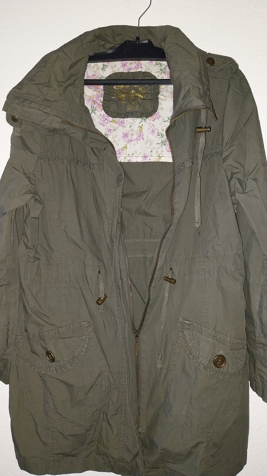 Olivová bunda - párka zn. Denim Co na jar/jeseň, ale v pohode aj chladné dni v lete. Nie je podšitá. rukávy sa dajú zrolovať a zapnúť. Sťahovanie šnúrkou v páse. Veľkosť UK14, zodpovedá veľ. M/L.