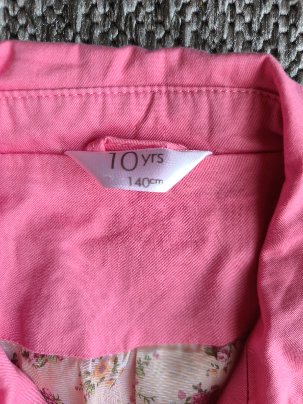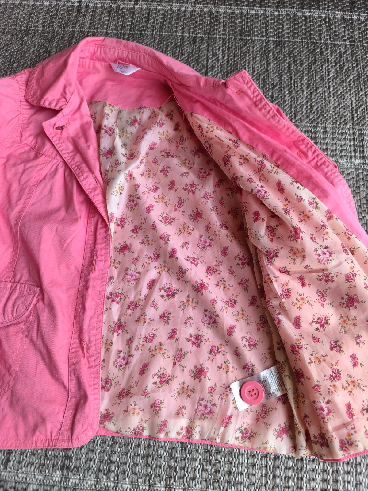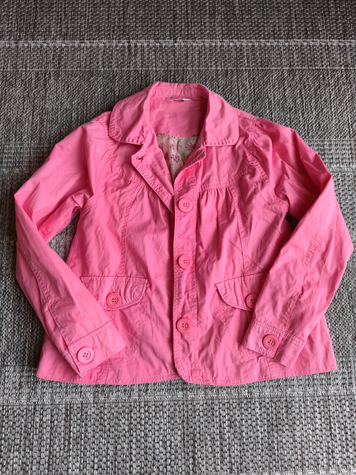 Tenké bavlnené sačko s kvetovanou podšívkou z polyesteru. Vhodné aj na príležitosť. Veľkosť 140. V super stave. Dĺžka 51cm, šírka cez hrudník 41cm, rukáv od ramena 52cm.