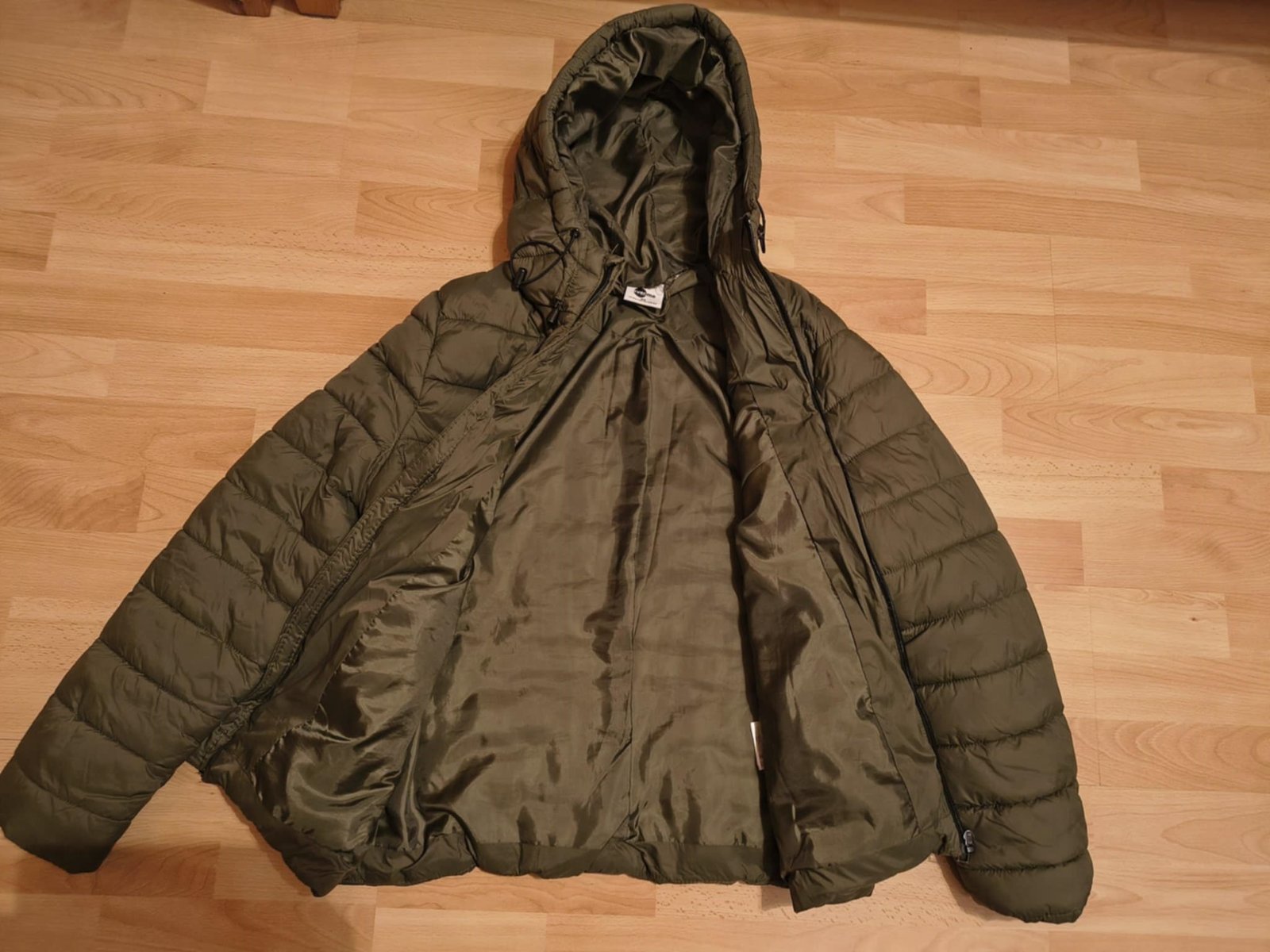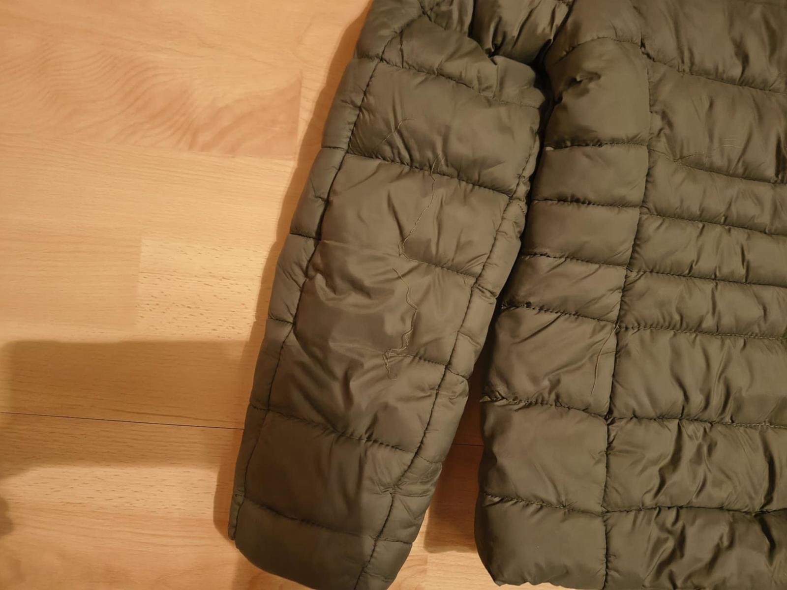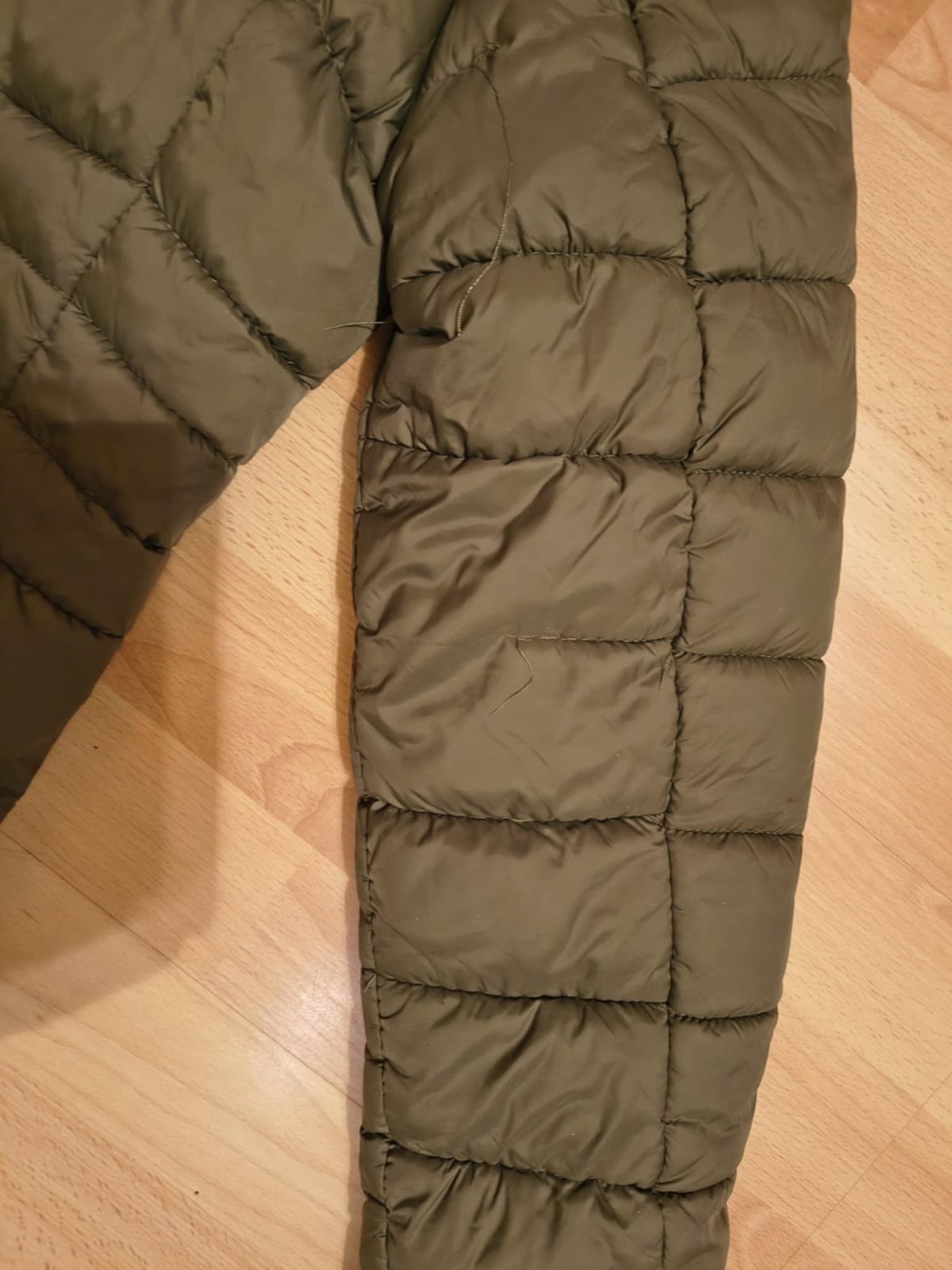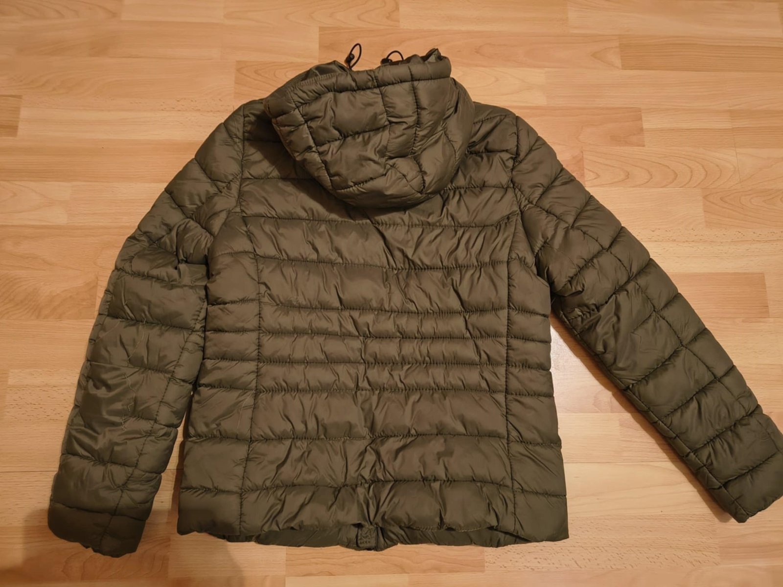 Kratšia bunda. Teplá. Vrecká na zips. Bez poškodení, len v oblasti lakťov uvoľnené prešívanie.
