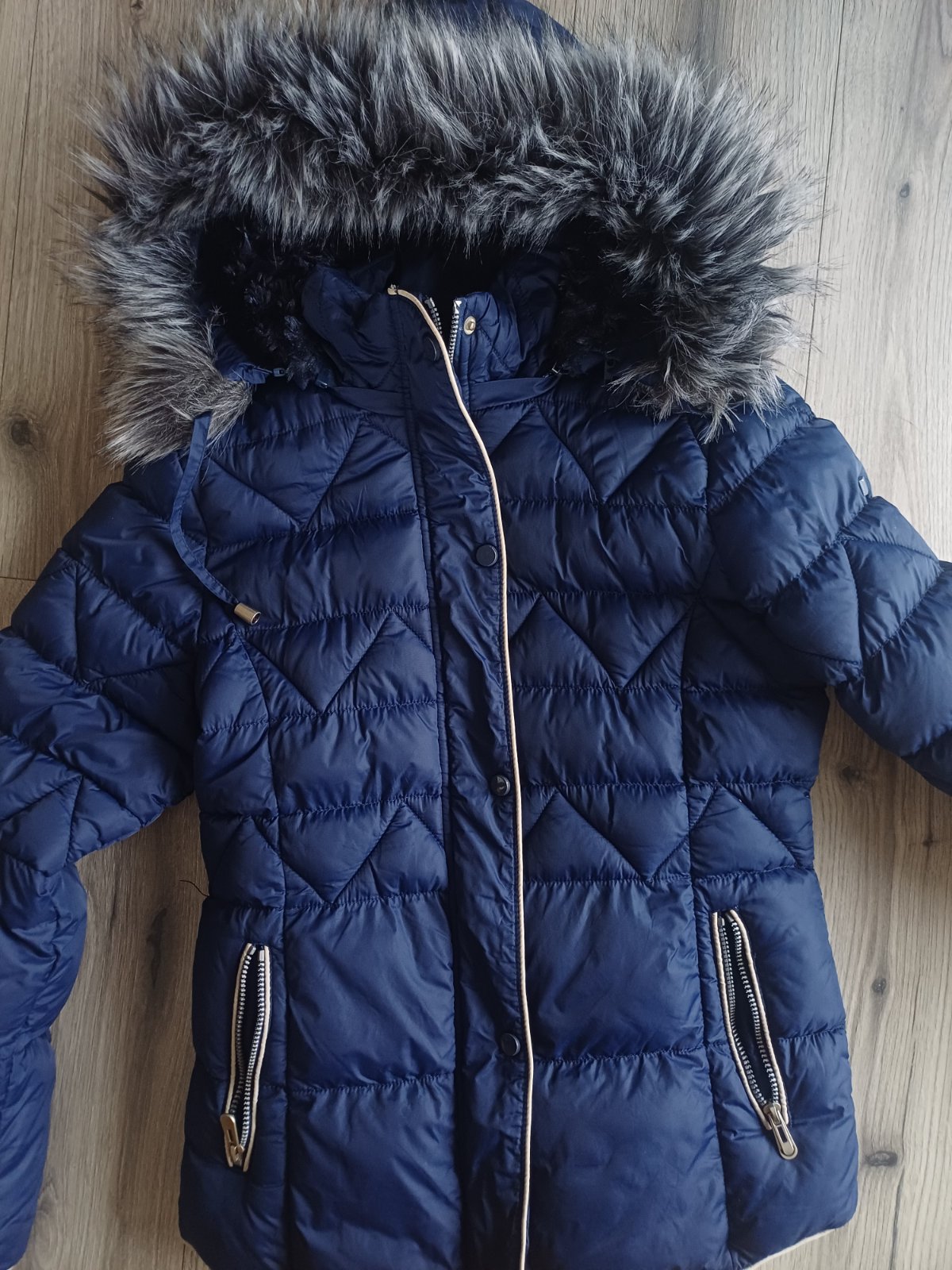 Krásny nosený stav, bundu treba dať do čistiarne, aby naspäť nabrala objem a bude ako nová. Je nezničená, kapucňu si viete odopnúť a tiež kožušinu. Kožušina je jediná vec, na kt. Vidno použitie. So...