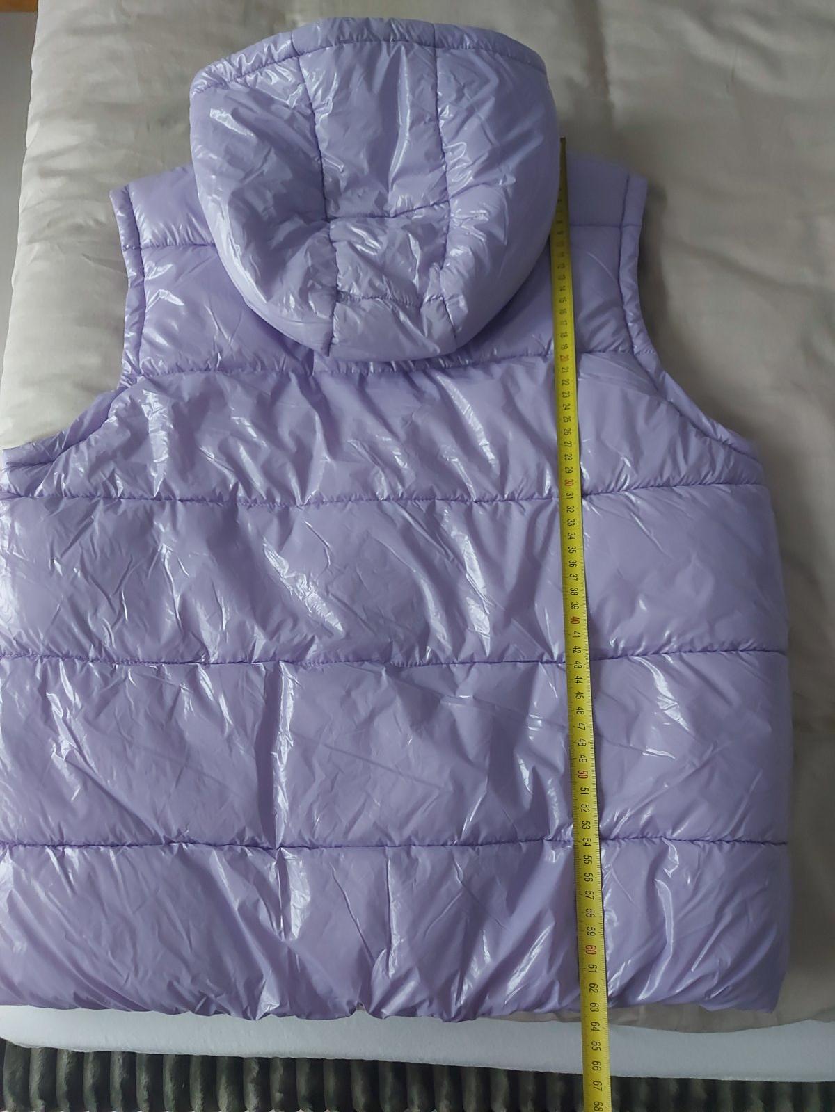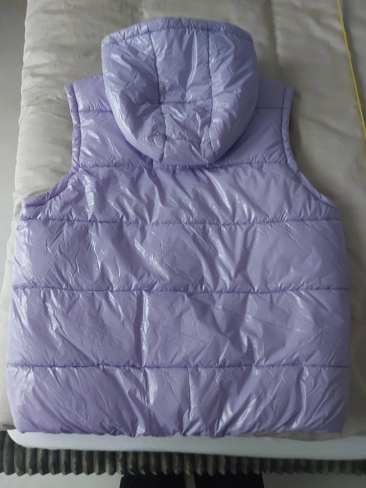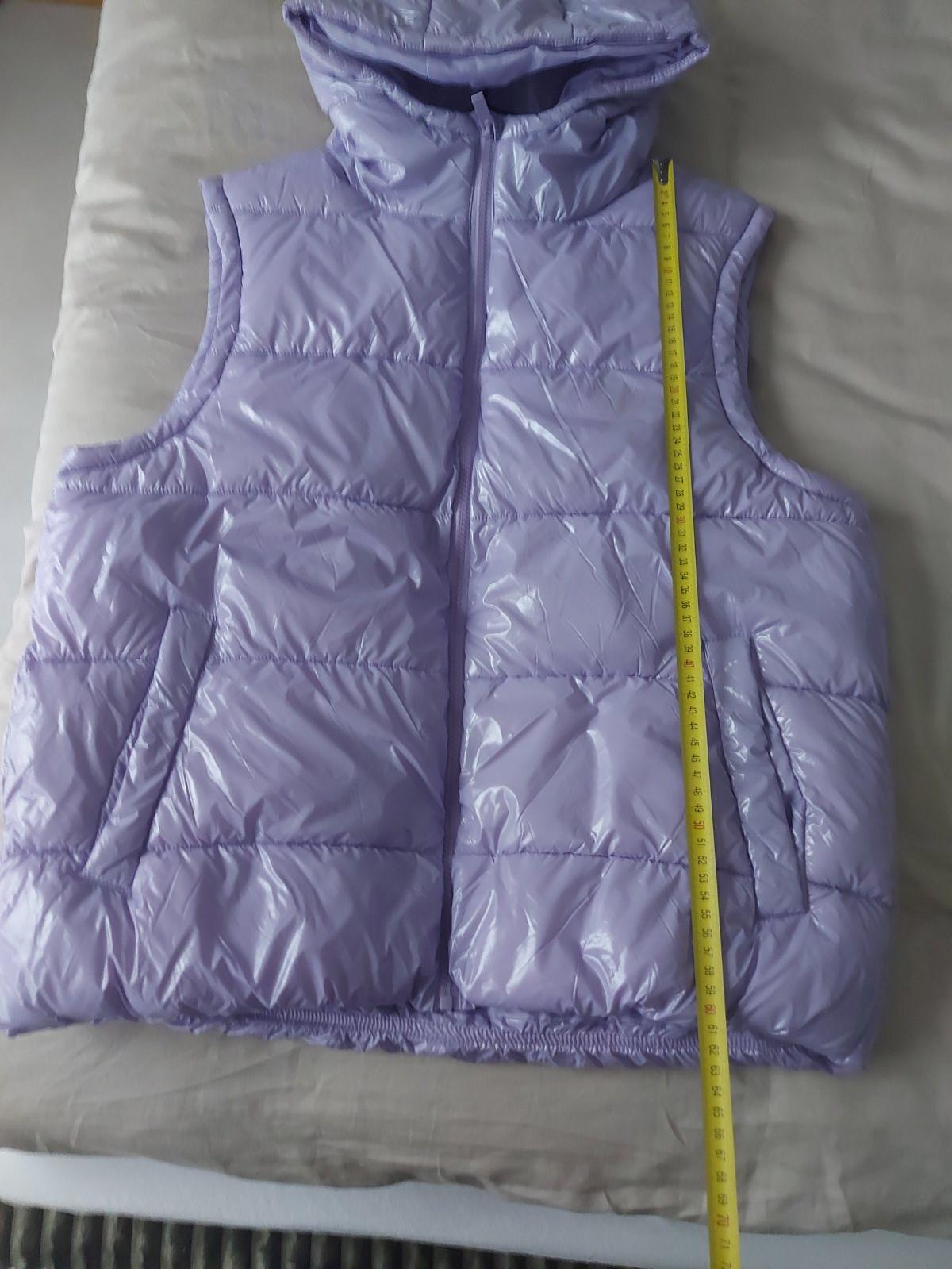svetlo fialová hrubá lesklá vesta ako nová top stav bez chybičky zapínanie na zips vpredu dve vrecká, vo vnútri je skryté vrecko veľkosť 158 na 13 rokov dlžka 63 cm šírka 2x 56 cm
