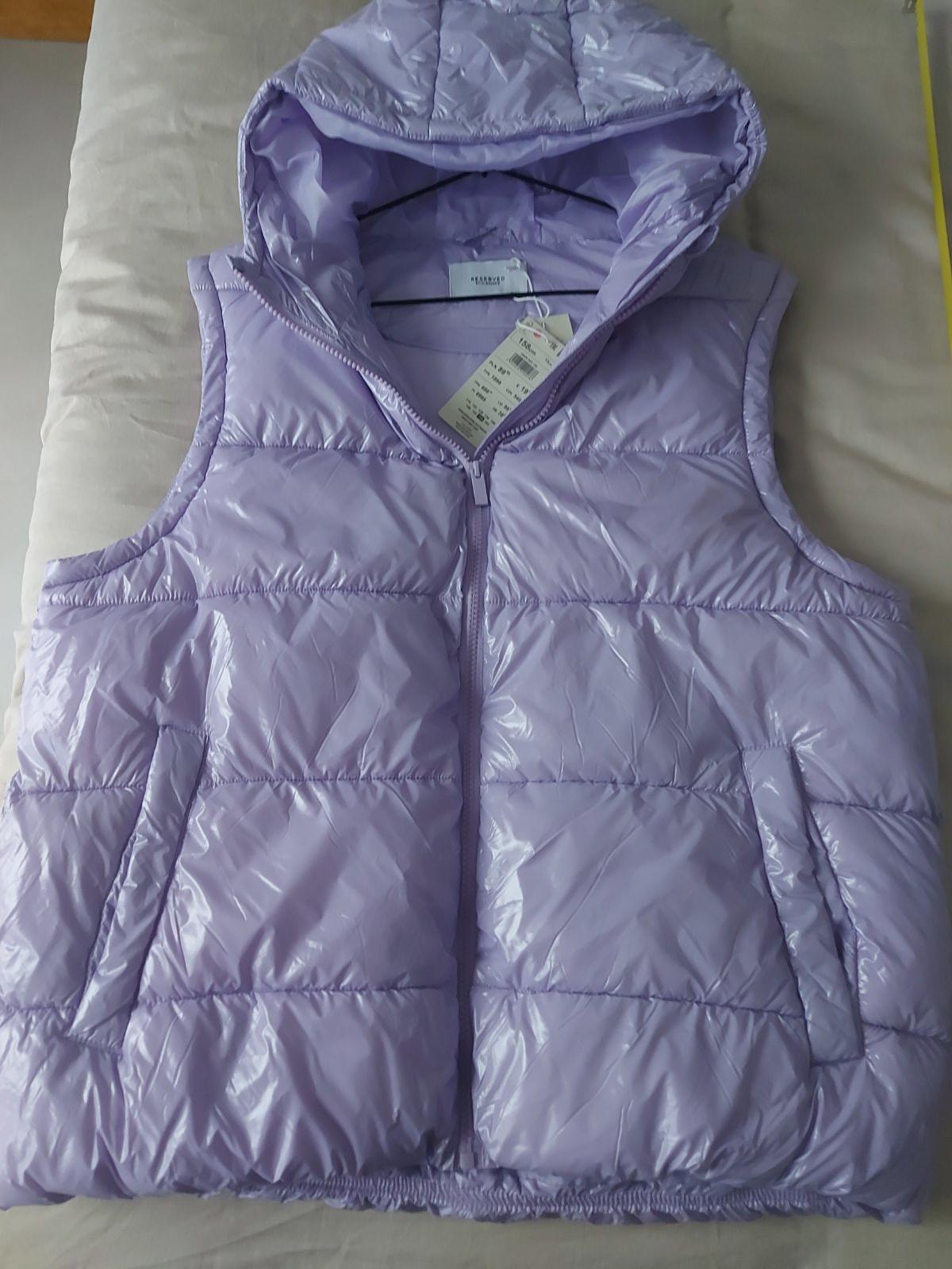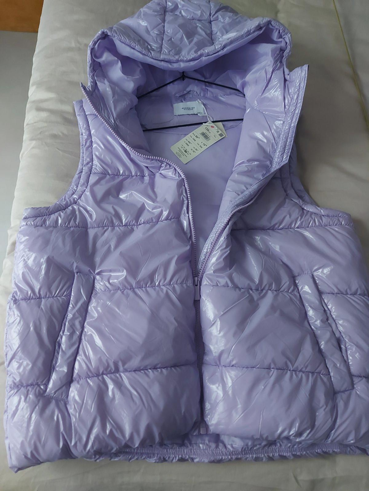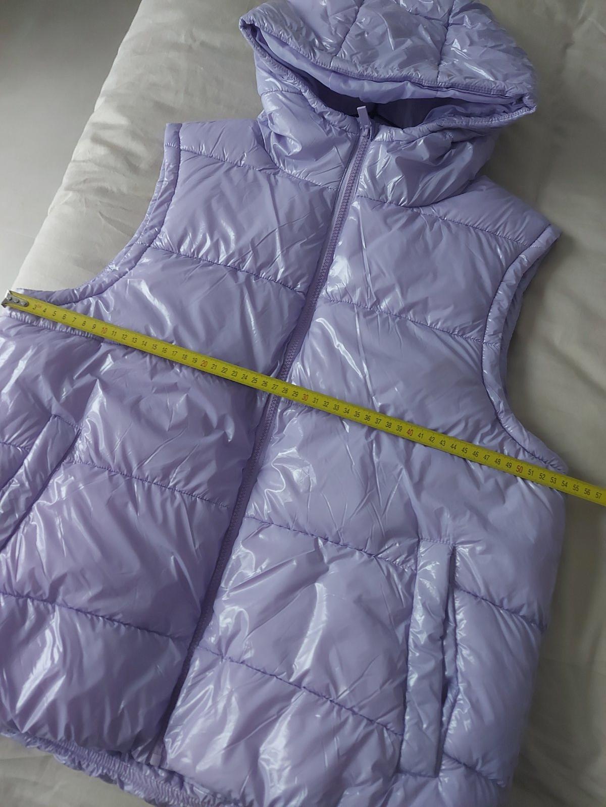 svetlo fialová hrubá lesklá vesta ako nová top stav bez chybičky zapínanie na zips vpredu dve vrecká, vo vnútri je skryté vrecko veľkosť 158 na 13 rokov dlžka 63 cm šírka 2x 56 cm