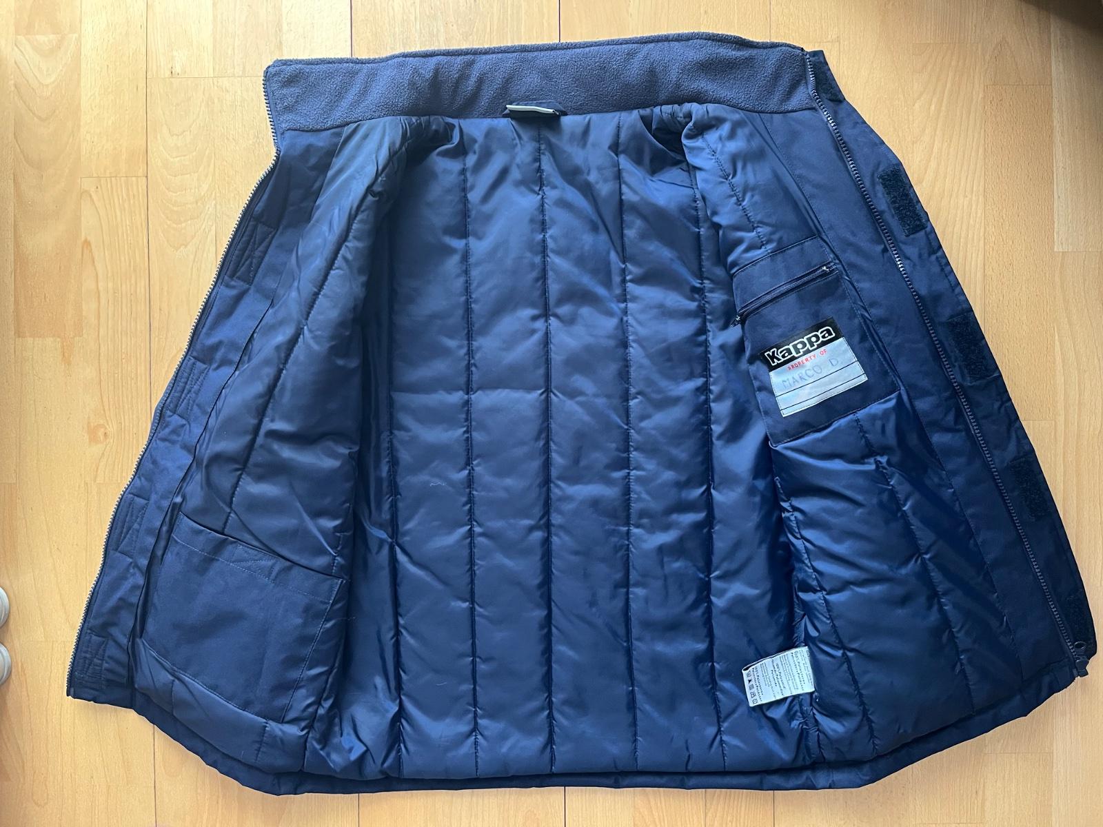 Predam velmi peknu športovú zateplenu bundu Kappa, pevný material proti vetru a dazdu, zateplena, určená skor na sportove nosenie. Znacka Kappa (kúpená v predajni Kappa), velkost na 11-12 rokov (v. 152), 2 predne vrecka a 2 vnútorne vrecka (jedno je na zips). Schovatelna jednoduchá kapucna bez zateplenia, da sa zrolovať pod limec. Super stav, bola par krat oblecena. Zadna dlzka od krku 64 cm + stojacik vyska 6,5 cm, sirka pod pazuchami 52 cm, dlzka rukava od krku 66 cm. PC 109 eur. BA - Ruzinov.