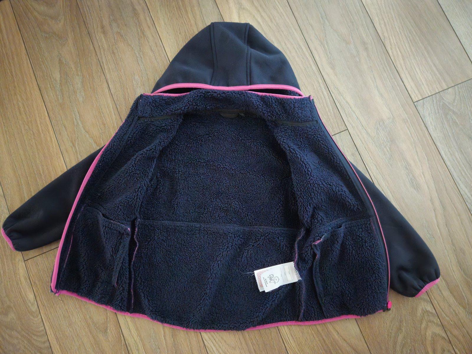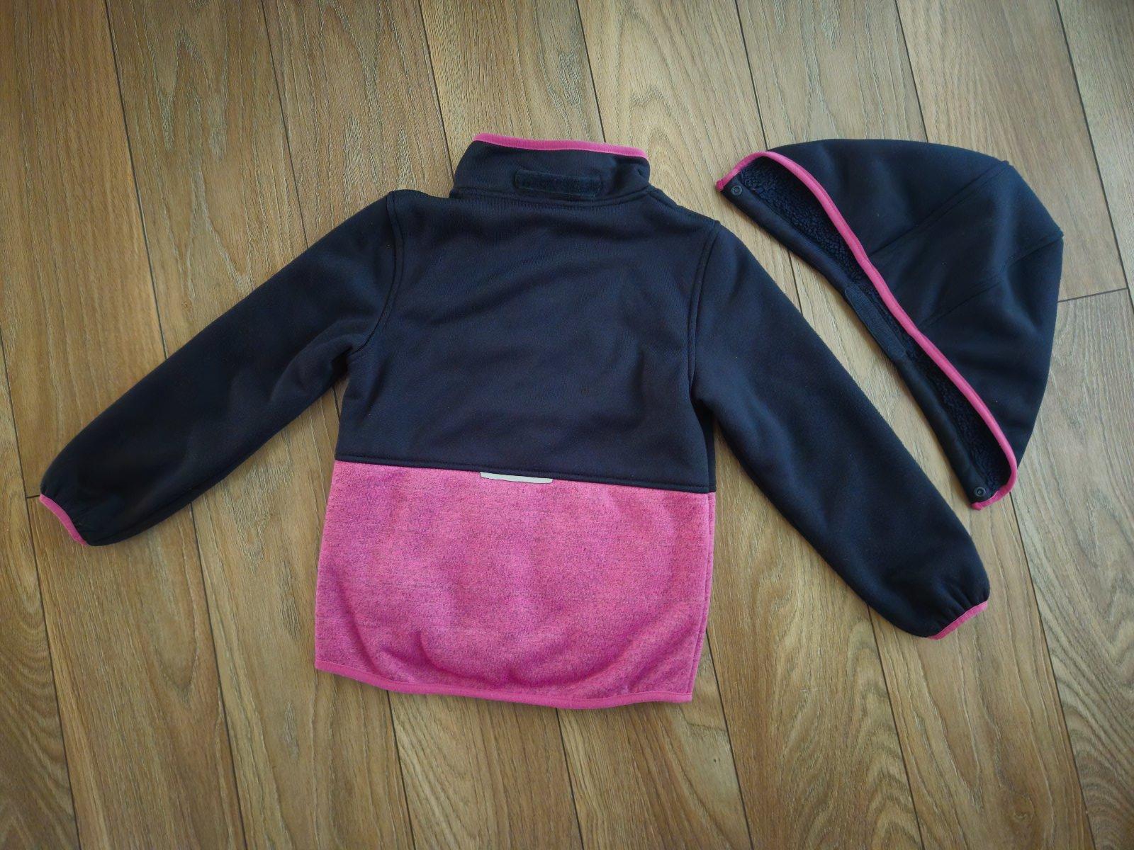 Velmi pekny noseny stav bez poskodeni. Farba je pekna tmavomodra, nie je vyblednuta. Kapucna sa da odpojit. Bundicka je ako vyteplena mikina, nie je vodeodolna.