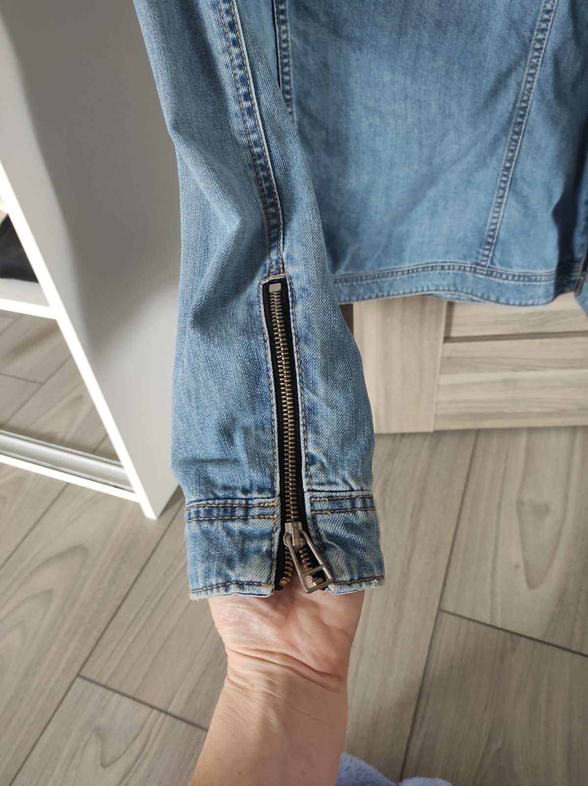 Denimova bomber bunda Reserved Veľkosť 140, 152, 158 Pružkovaný stojačik, zapínanie na zips a cvoky, dva vrecká, pásikavé lemovanie, ozdobné stehovanie Originálny kúsok pre slečny, ktoré majú štýl ...