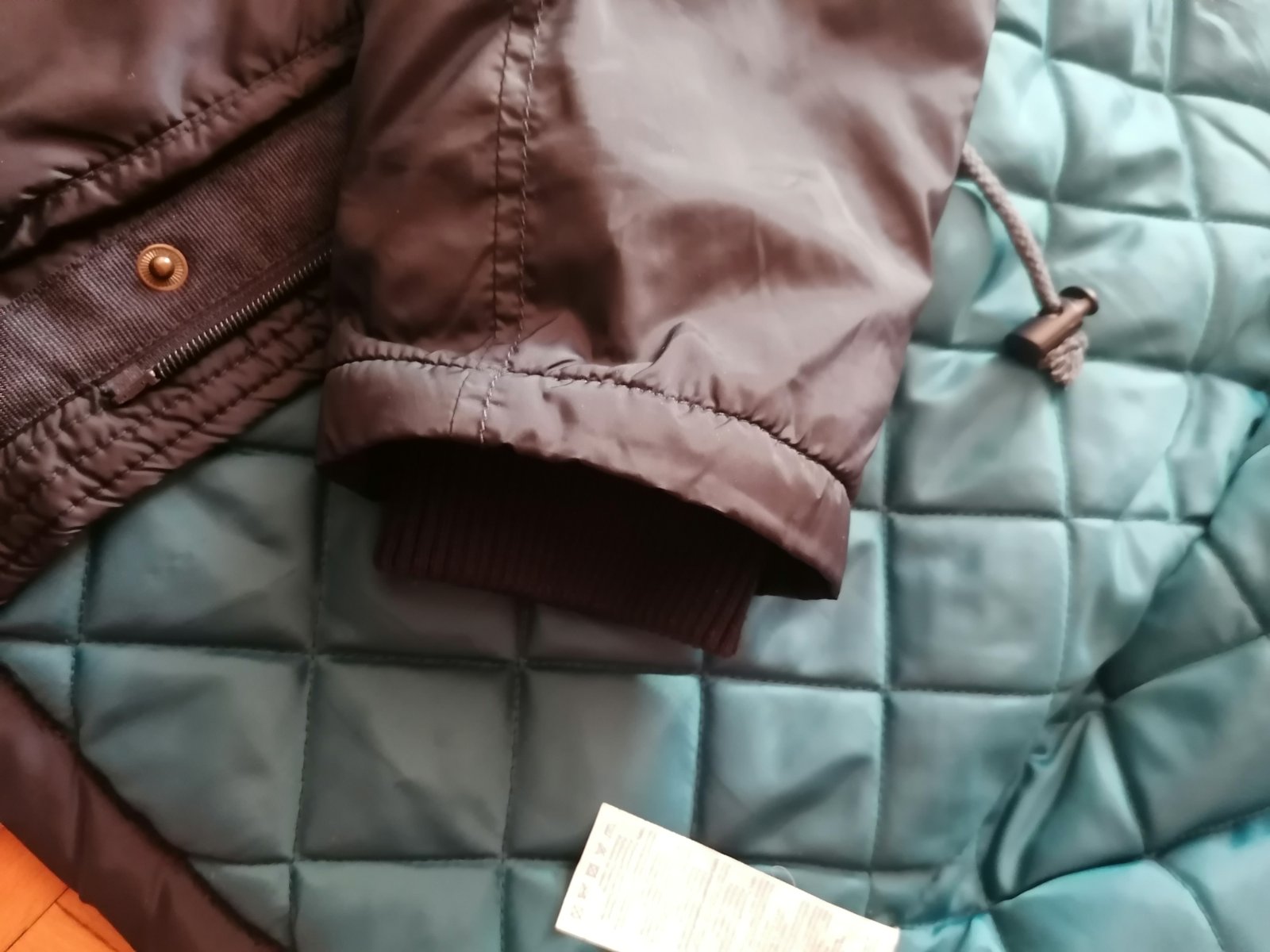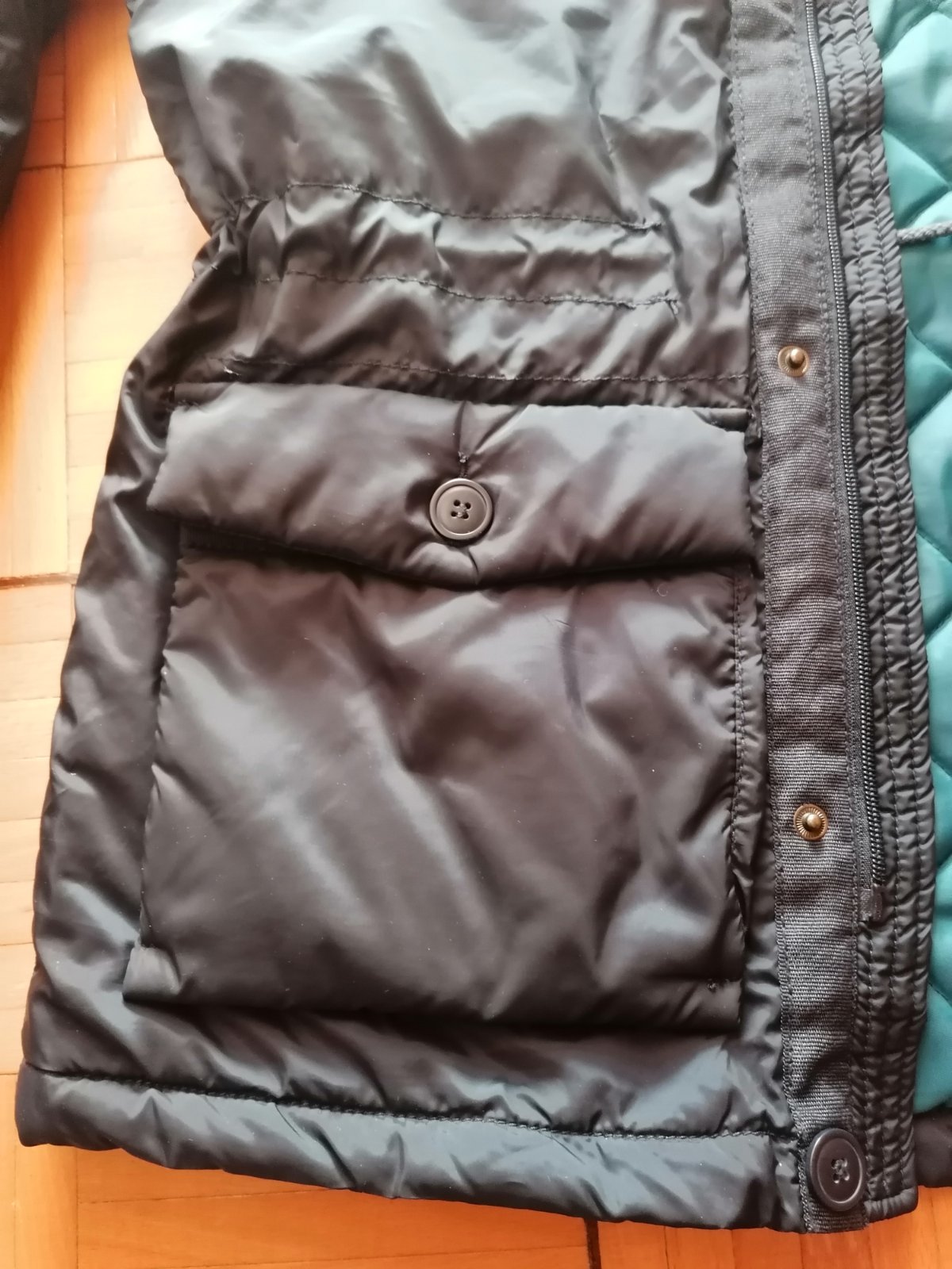 Pánska tmavomodrá vetrovka asi dvakrát oblečená, ako nová. Vpredu má našité 4 vrecká, vo vnútri jedno náprsné. Zapínanie je na zips aj na cvoky. V páse sa dá zvnútra stiahnuť. Golier zdobí kožušina, ktorá sa dá odopnúť. Rukávy sú ukončené úpletom. Šírka pod pazuchami 112 cm, dĺžka: 75 cm, dĺžka rukáva: 69 cm.