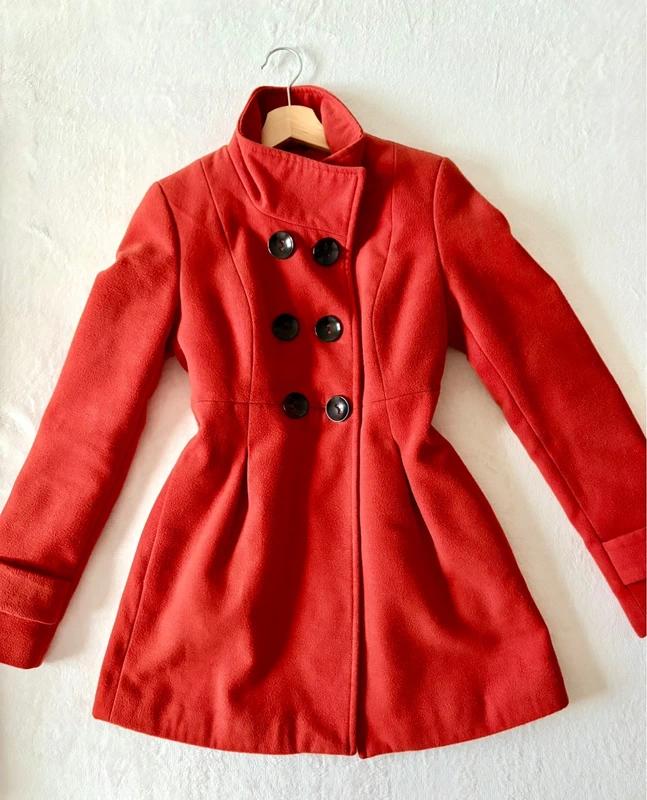 Štýlový dámsky kabát v sýtej oranžovej farbe, ktorý krásne zvýrazní postavu a dodá outfitu eleganciu. Kabát má priliehavý, mierne rozšírený strih, ktorý lichotí siluete, a dvojradové zapínanie s výraznými čiernymi gombíkmi, ktoré mu dodávajú nadčasový vzhľad.