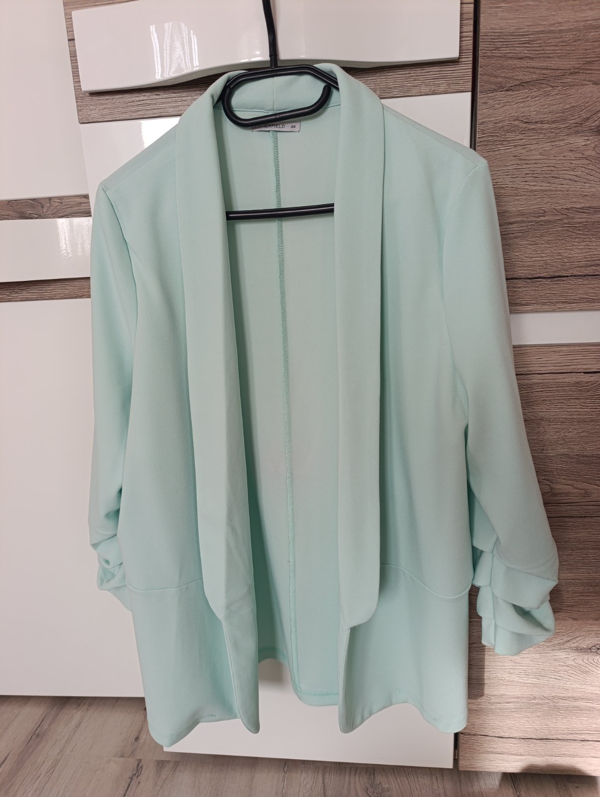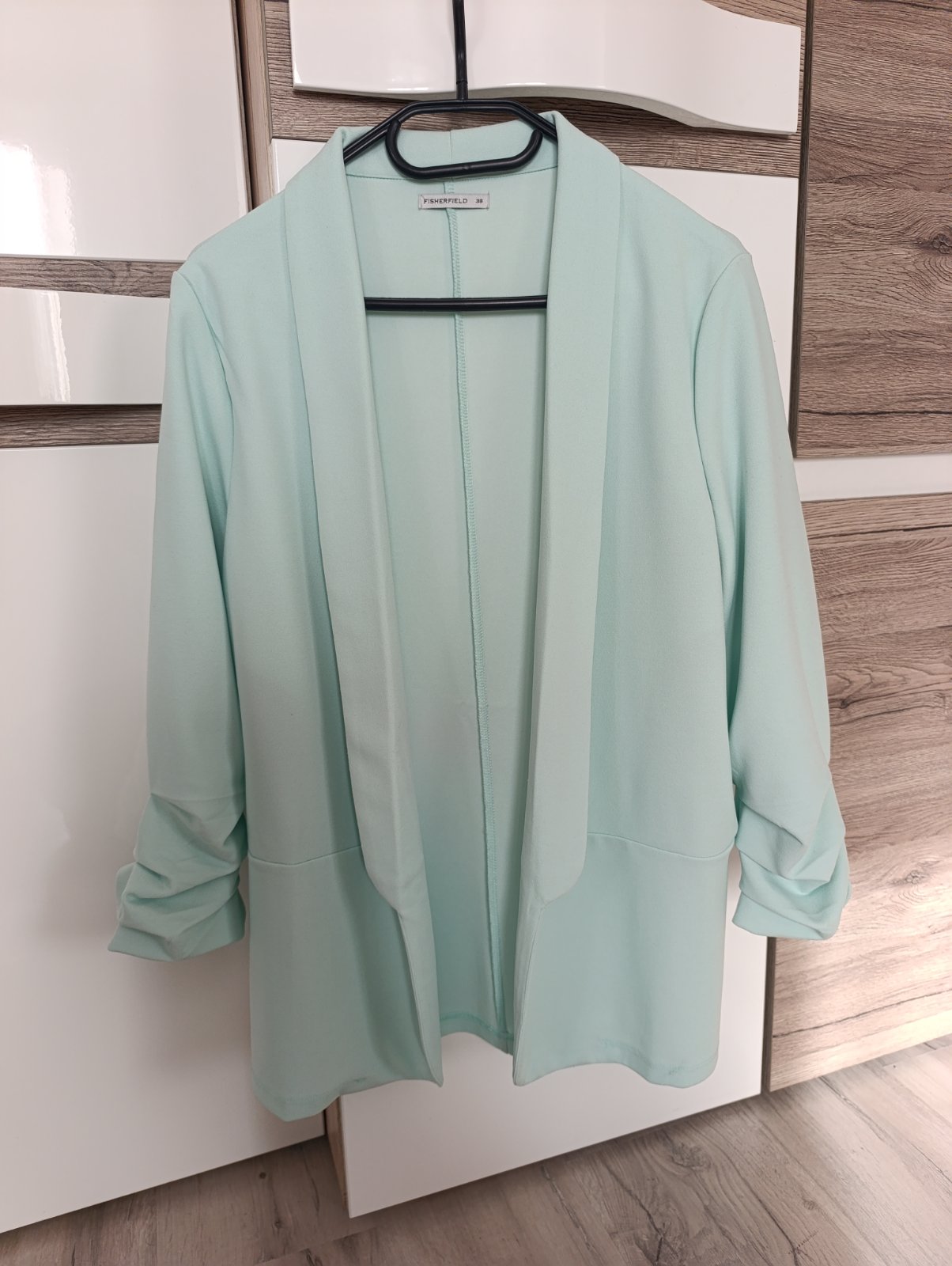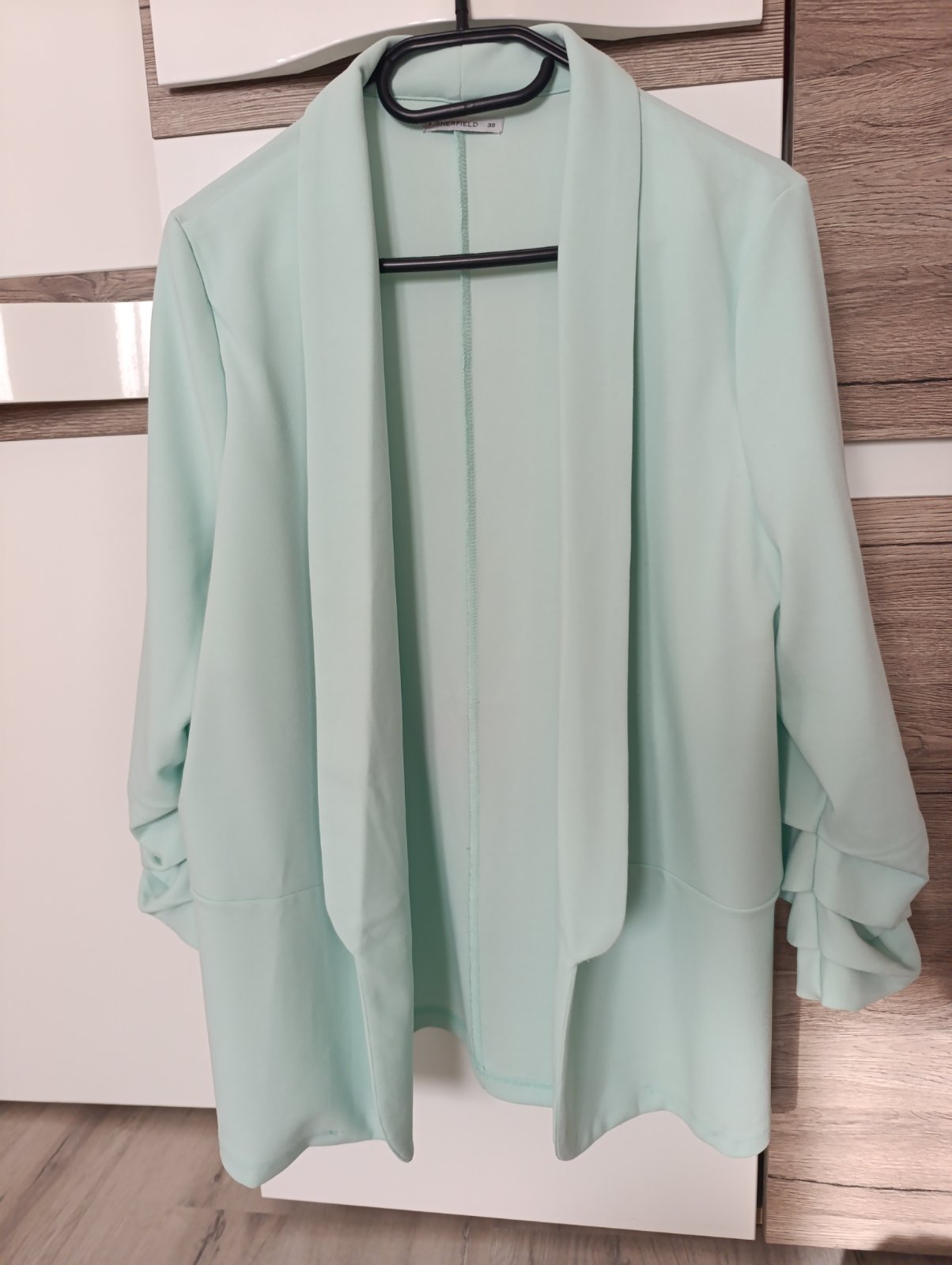SkladomPekné nové sako/blejzer bez zapínania s nazberkanými 3/4ťovými rukávmi. Krásna mentolová farba, ideálne na jar/leto, v ponuke aj blúzka. Pri výmene 8€