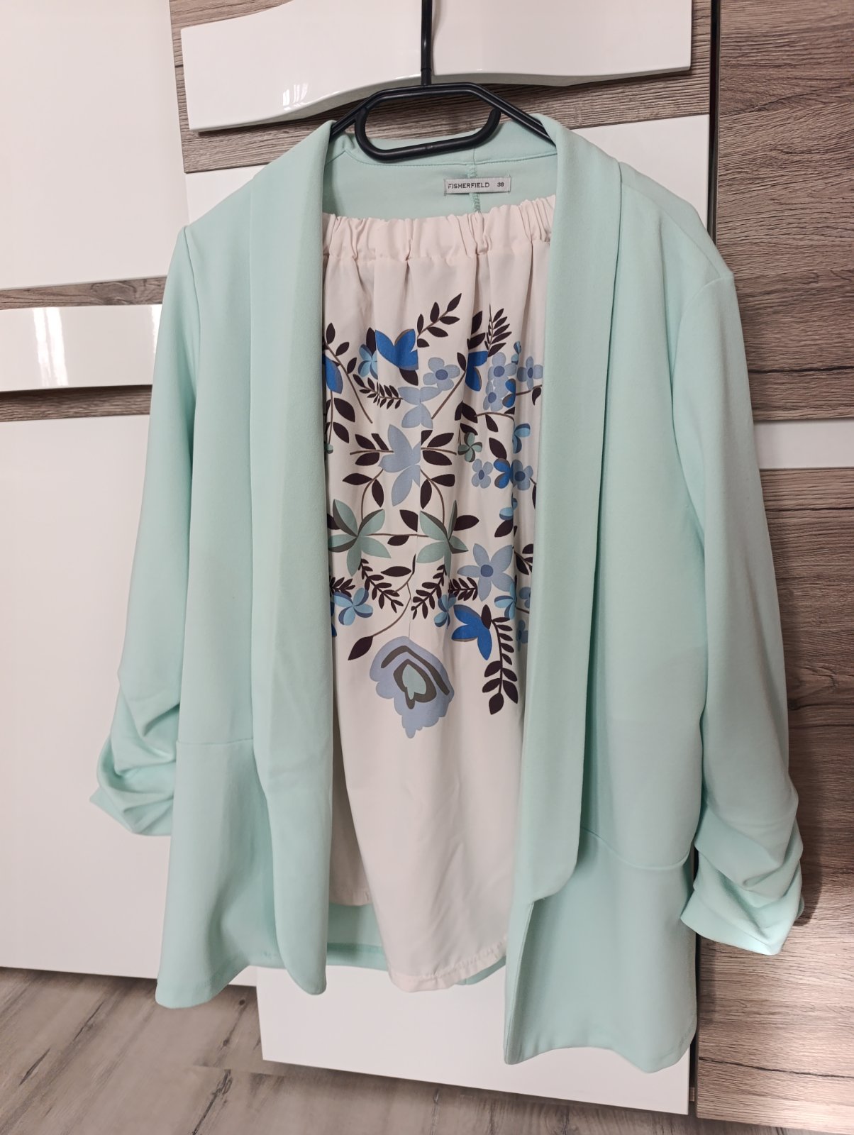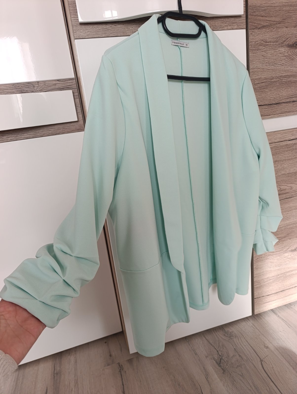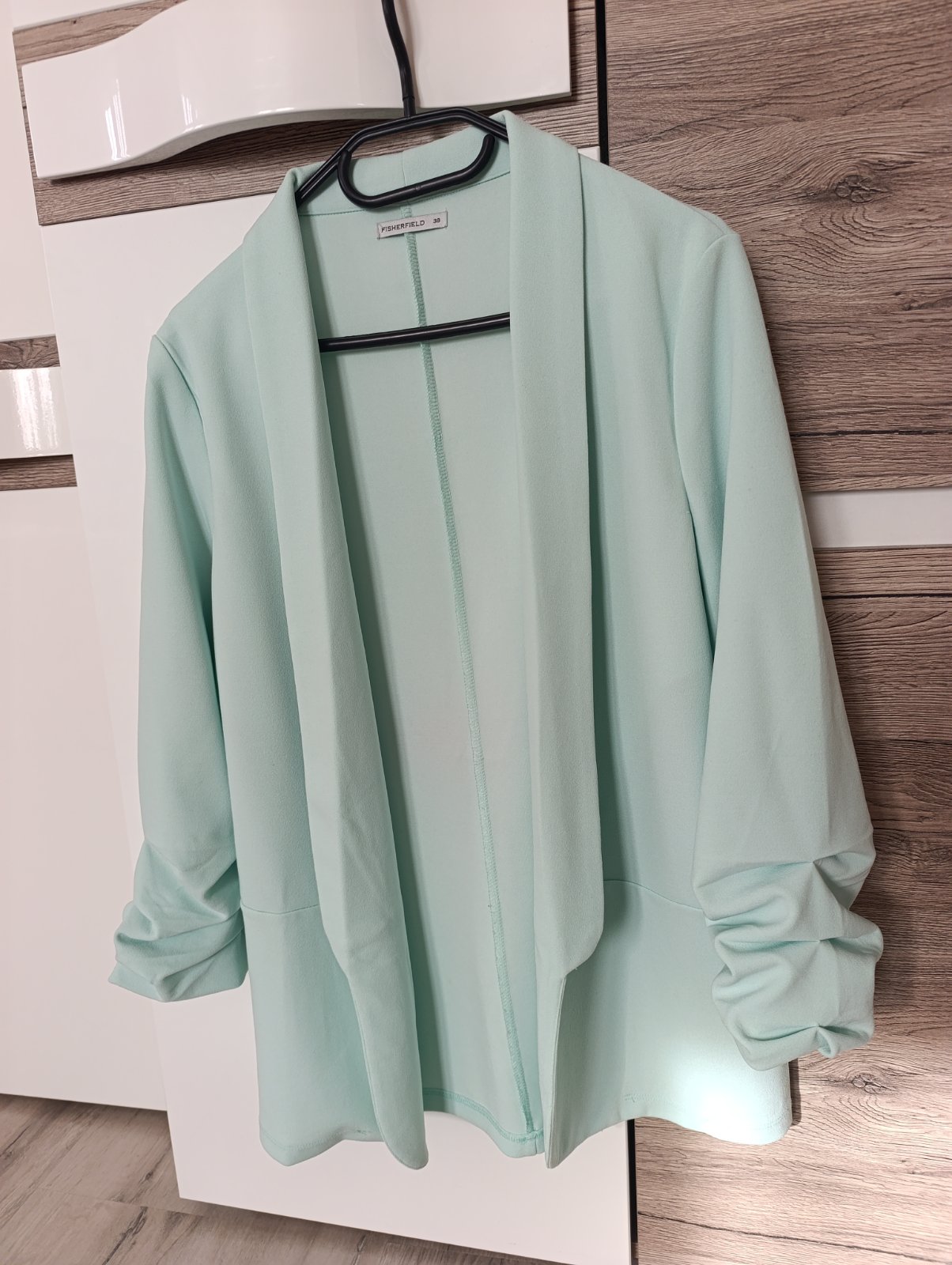 SkladomPekné nové sako/blejzer bez zapínania s nazberkanými 3/4ťovými rukávmi. Krásna mentolová farba, ideálne na jar/leto, v ponuke aj blúzka. Pri výmene 8€