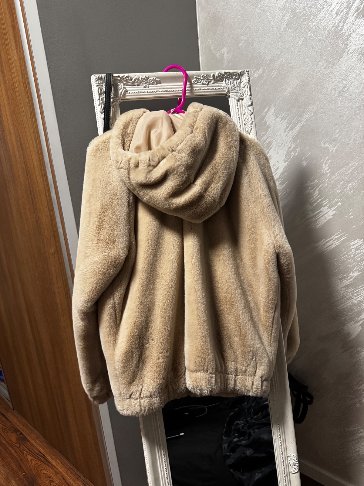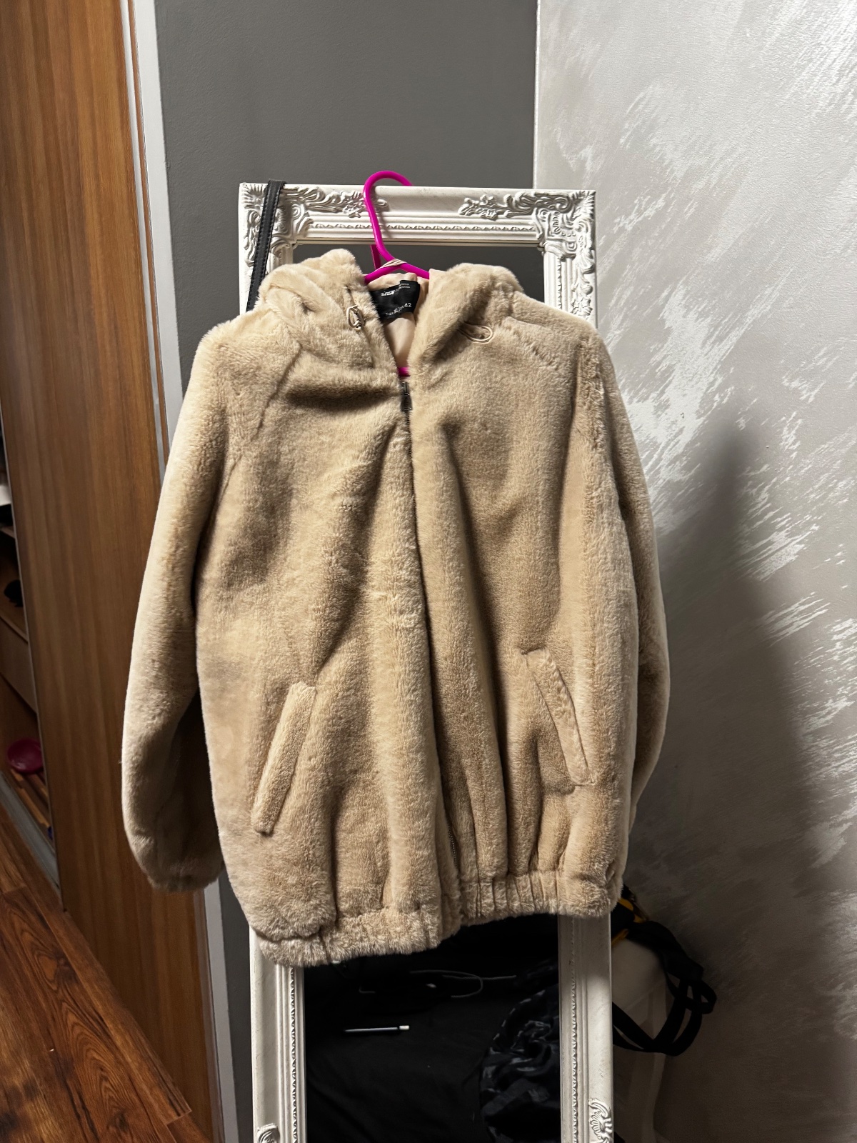 Krémová bunda Damenmode velk. 42/44. Dlžka 63 cm, šírka 2 x 55 cm, kapucňa sa dá odzipsovať, je celá podšitá, rukáv 62 cm + 11 cm rameno.
