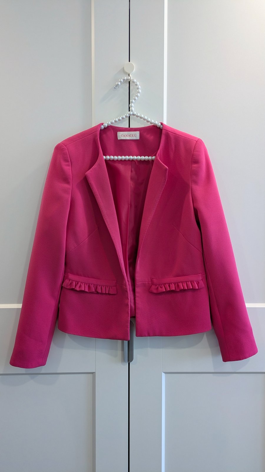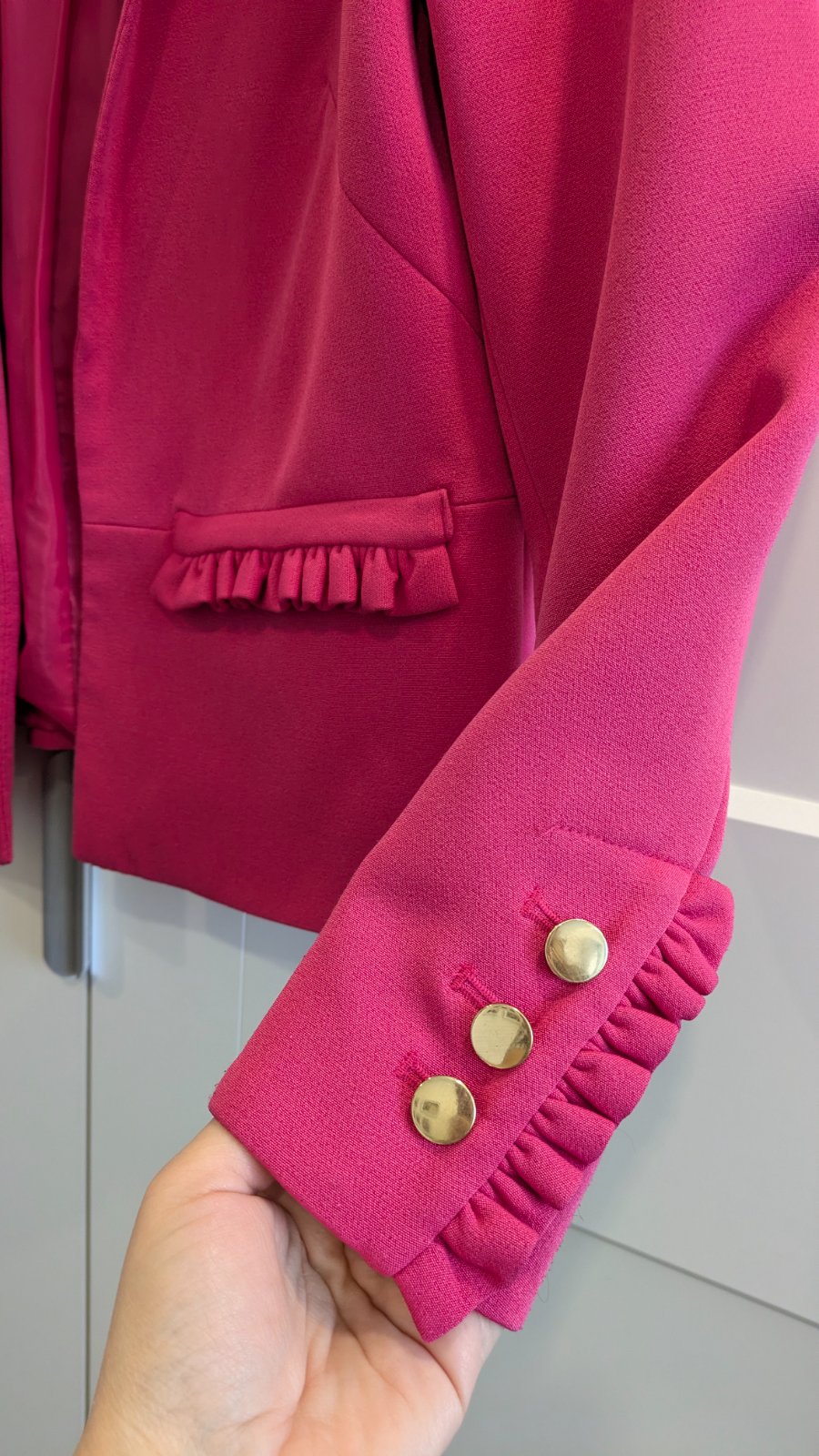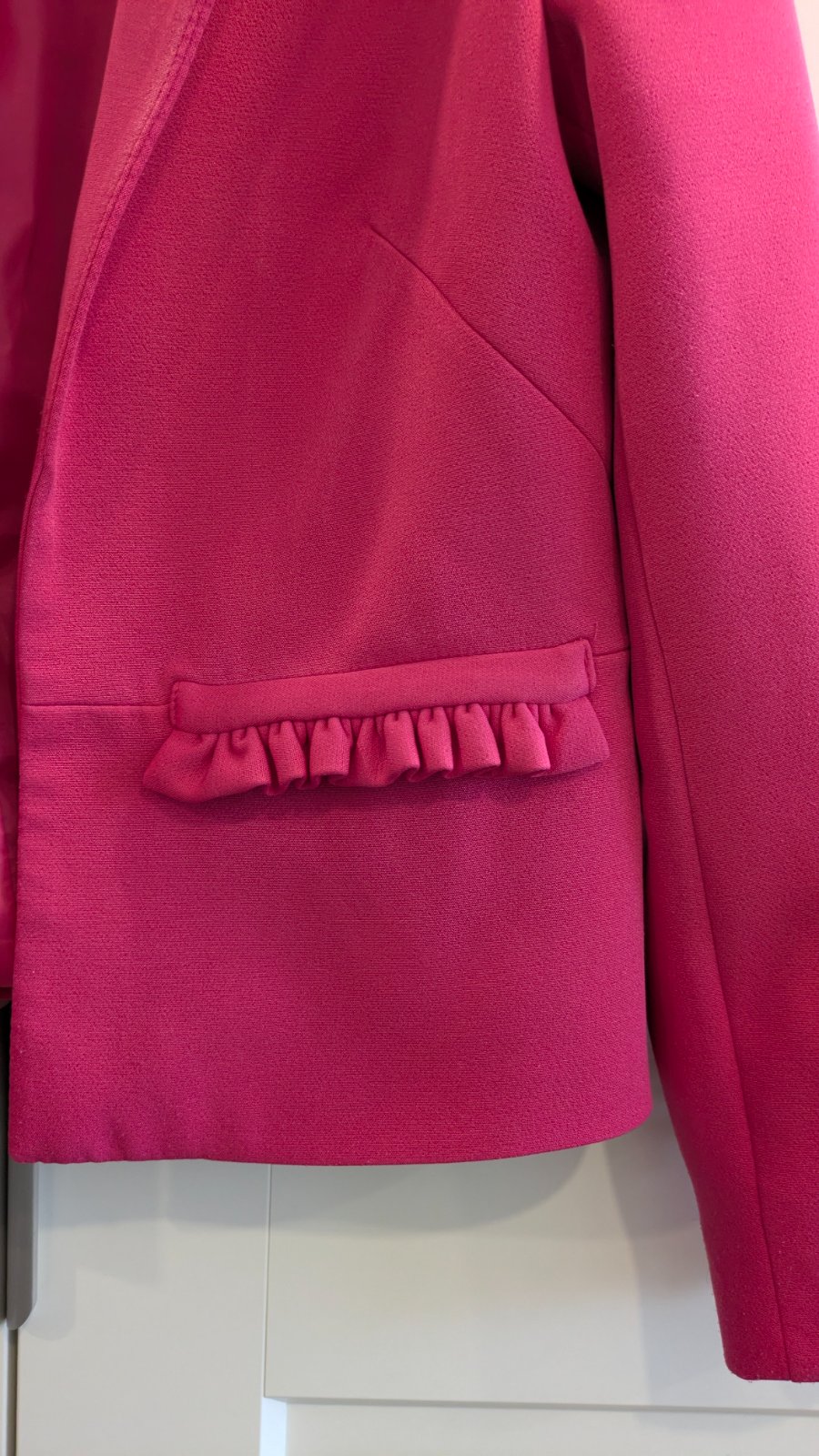 Nádherné sýto ružové sako značky Camaieu s jemným riasením na vreckách a rukávoch, ktoré oživí každý outfit. Pekný ženský strih, pôsobí moderne a elegantne.