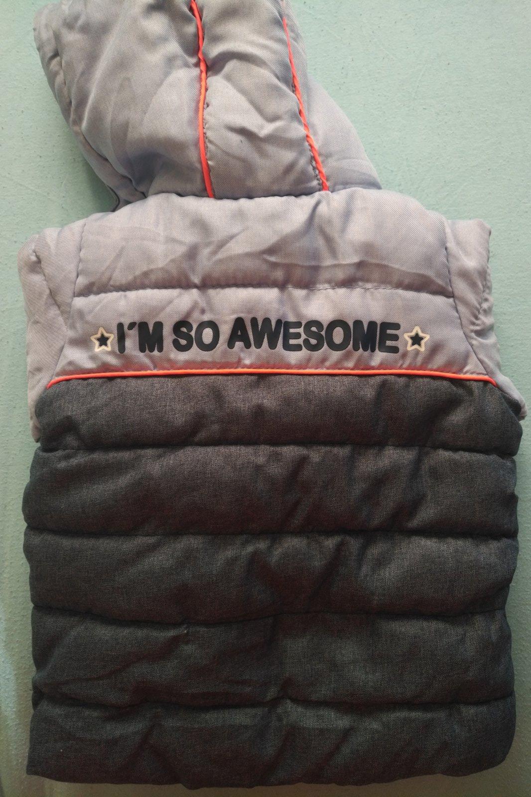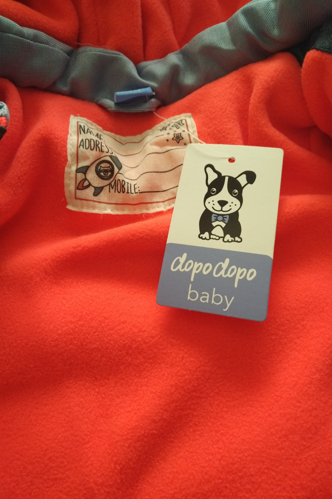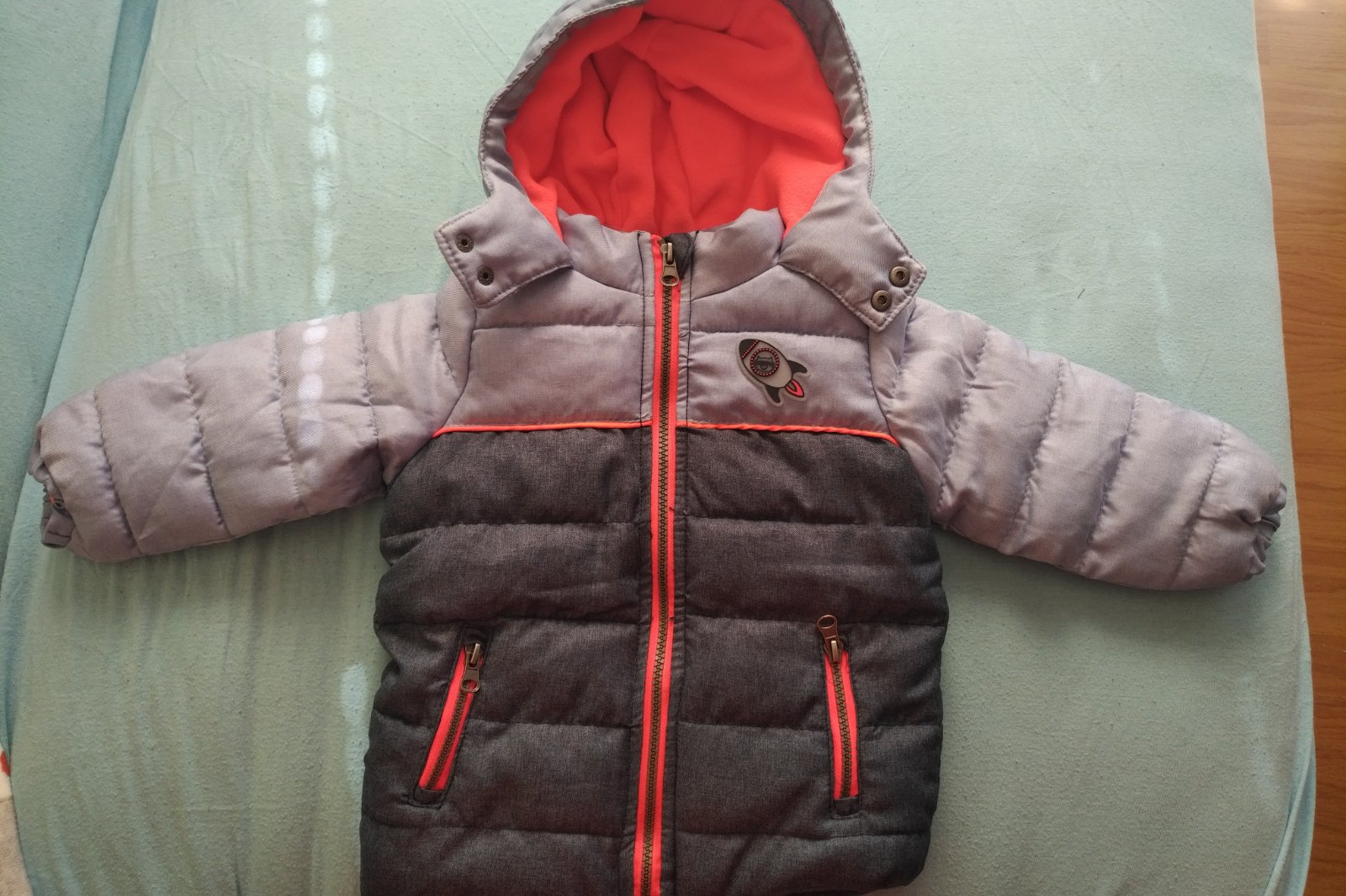 Teplá vetrovka na zimu s NEodopínateľnou kapucňou a 2 vreckami na zips. Vnútro je teplý flis jasnej oranžovej farby. Farby sú ako na poslednej foto (vo vnútri mi mobil nechcel zachytiť reálne odtiene) - horná polovica je svetlomodrá a dolná je tmavomodrá.