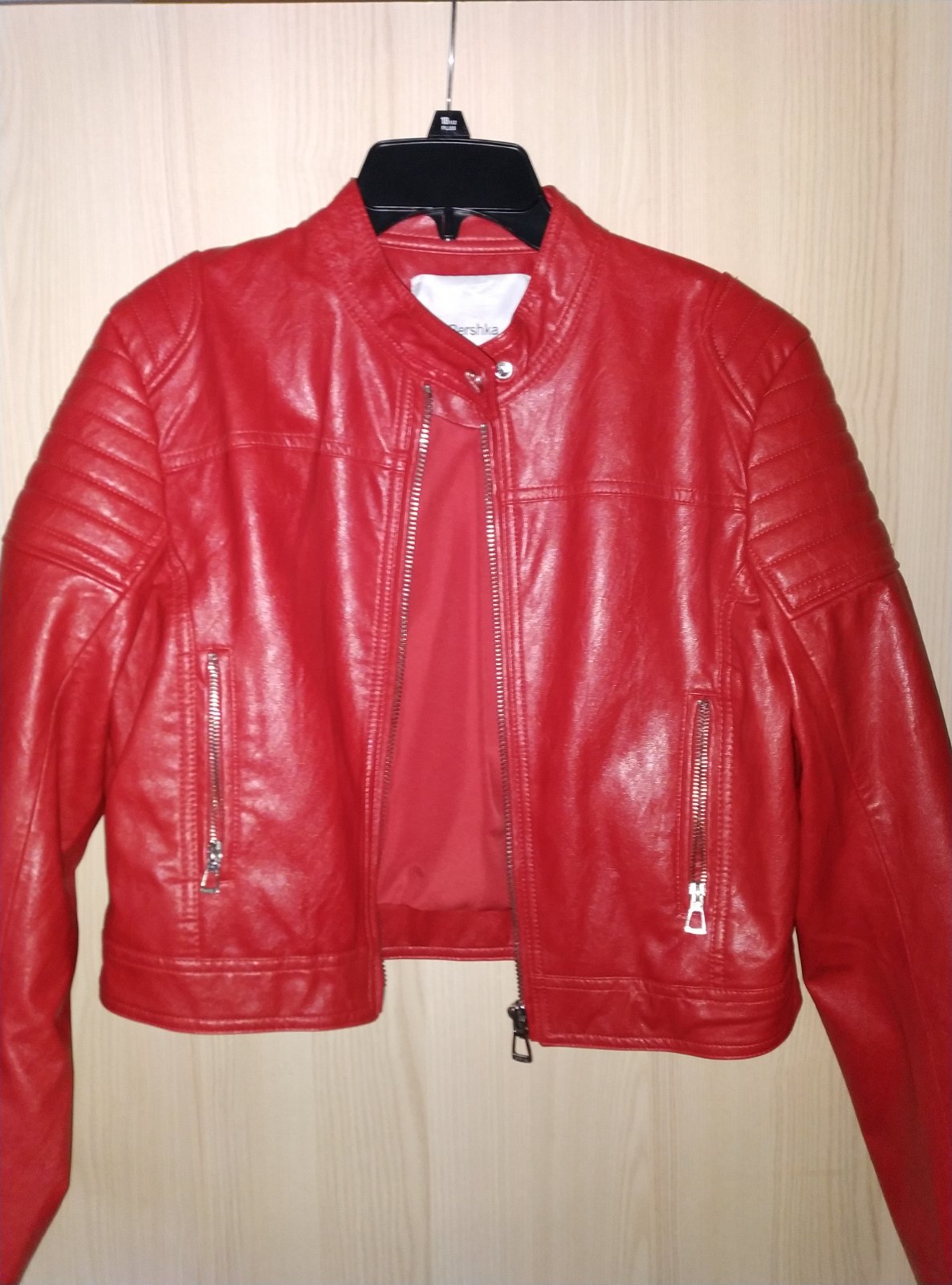 Velmi pekná červená farba,nie ako na obrázku,nedá sa mi odfotit. Je tmavočervená. Ako nová,kúpila som malí velkosť. Kožušinka je na gombíky-odnímatelná.