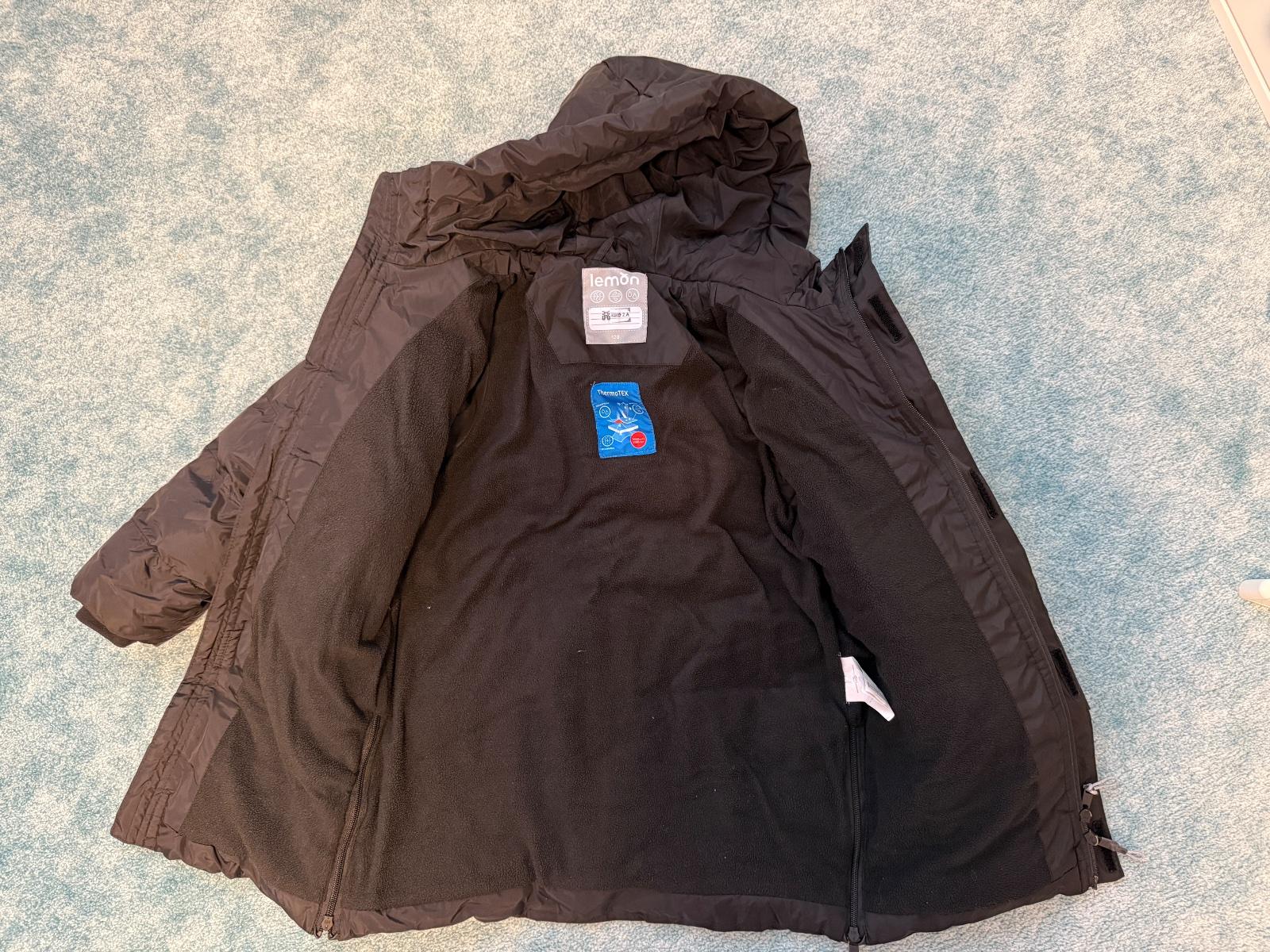 veľmi teply zimny kabat s kapucnou. 2 bočné vrecka na zips, zapínanie na zips. na rukáve je nápis odpadnuty. vid.foto. dlzka chrbta od krku 56 cm, dĺžka rukáva od ramena 51 cm