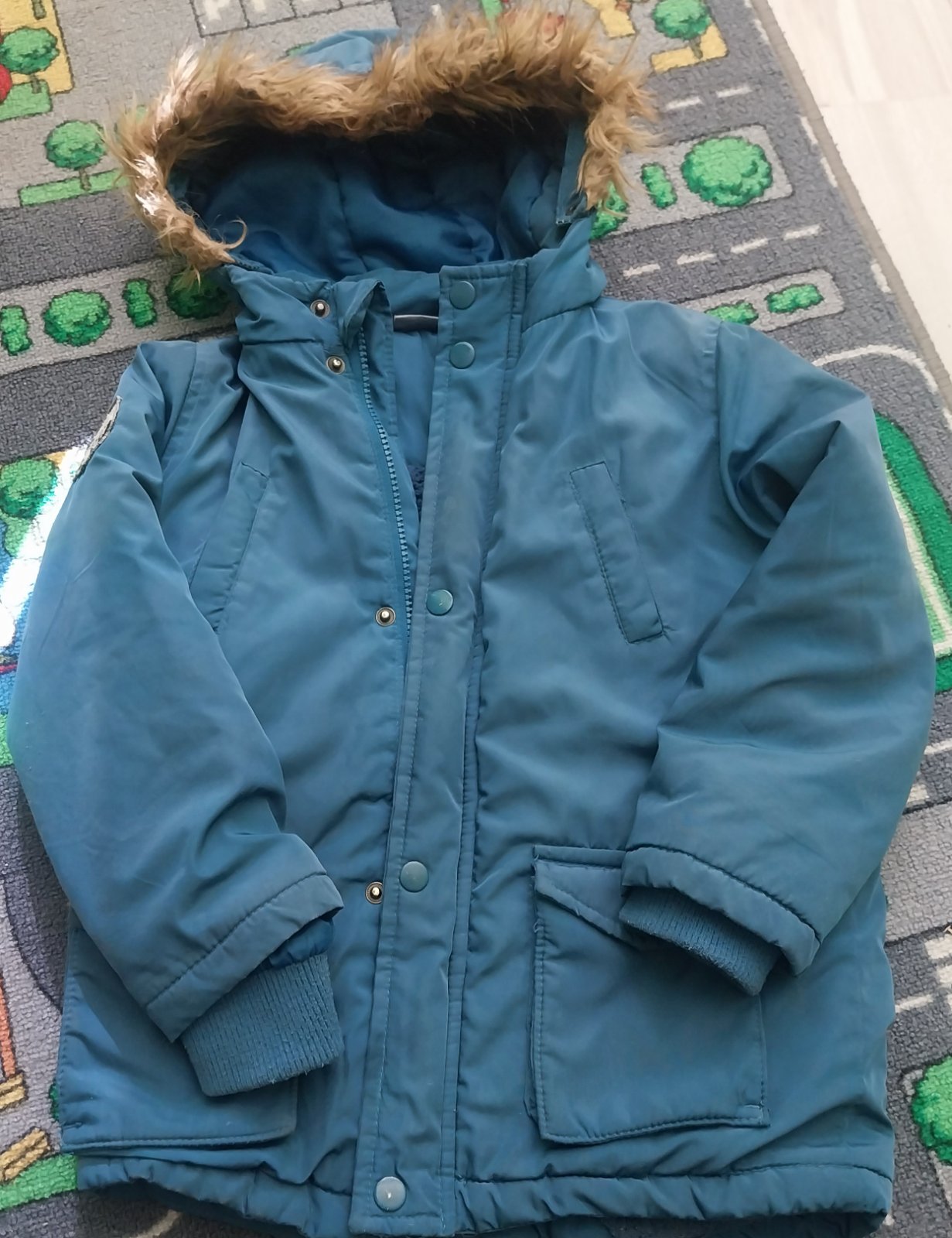 Tmavomodrá zimná bunda, zateplená kožušinkou, veľkosť 116, značka Lupilu. Rozmery sú na fotkách, kapucňa je napevno. Nosená jednu zimu, vidieť nosenie, nepoškodená. Máme viacero detských vecí, môže...