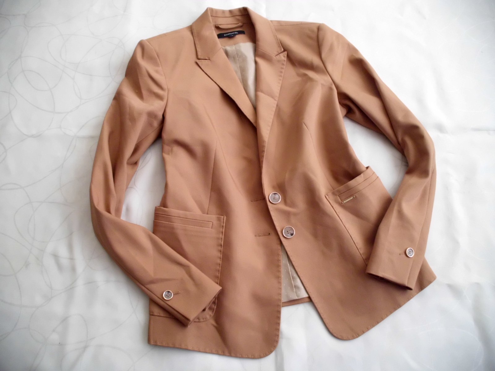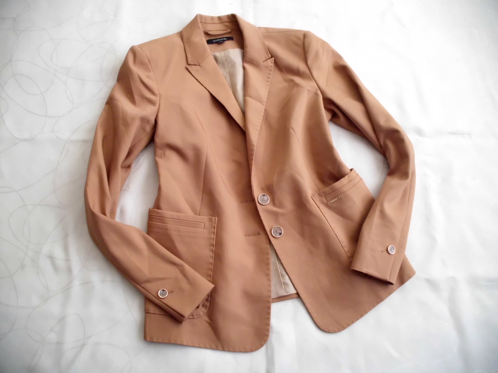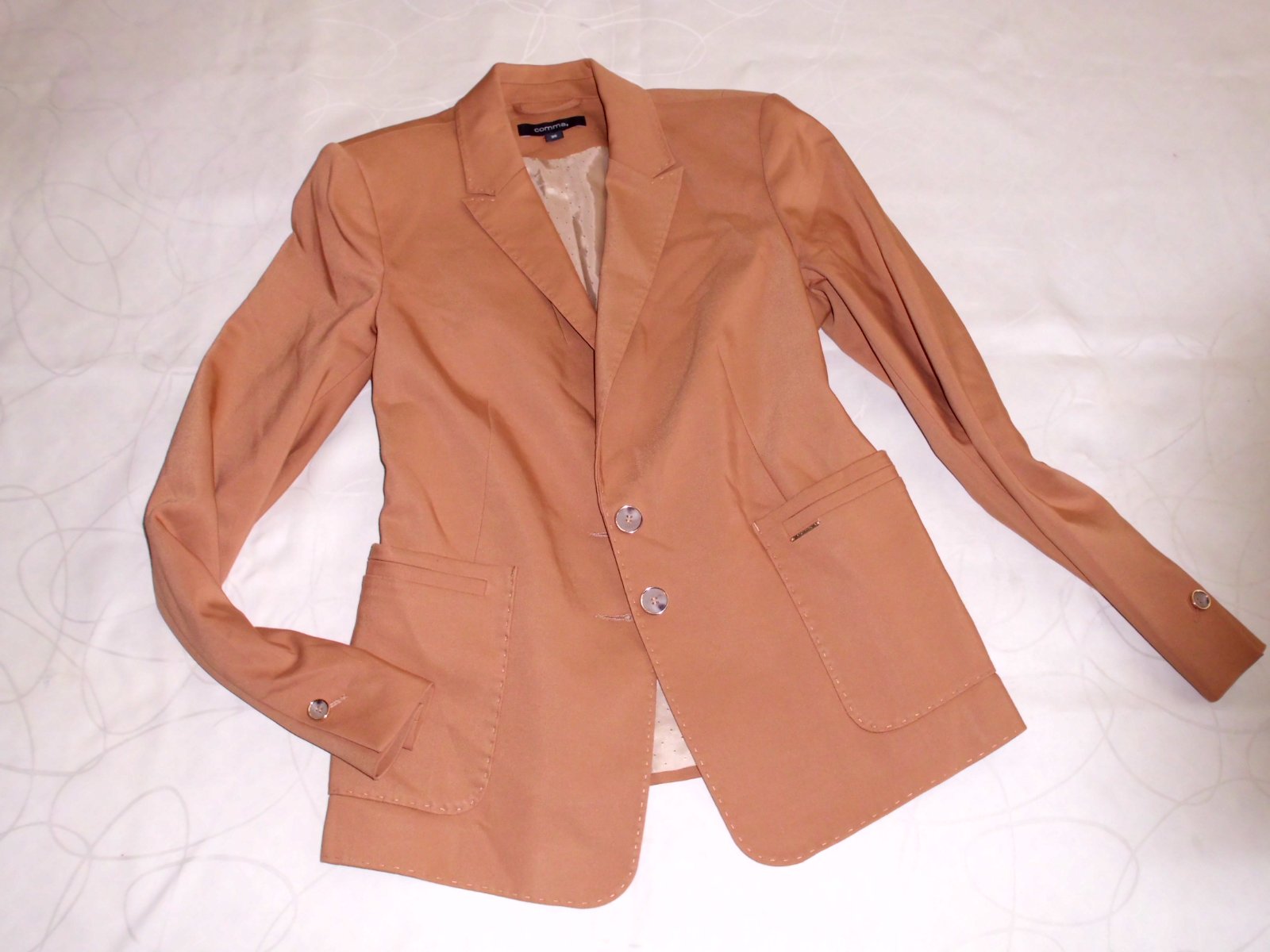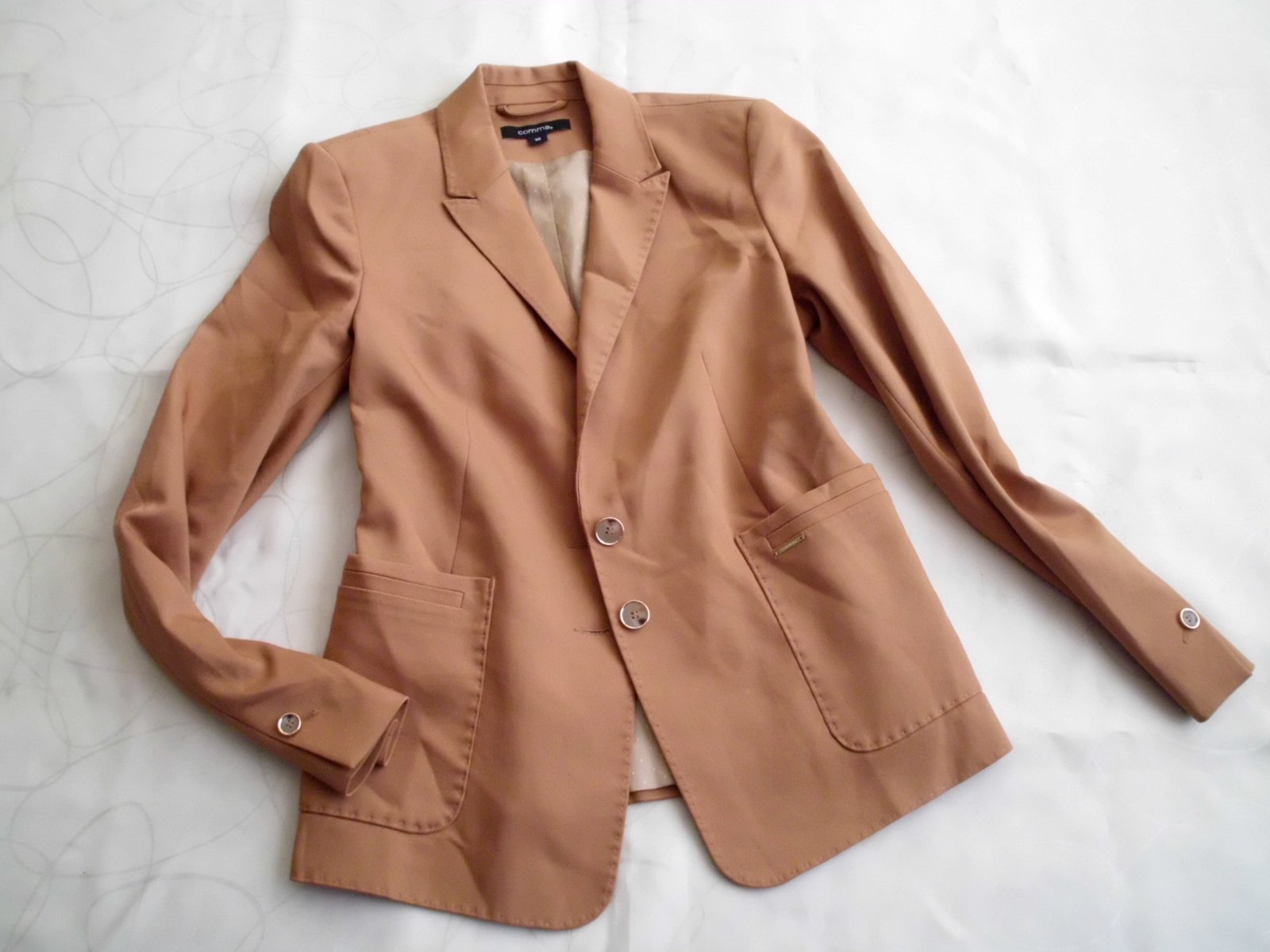 Predám dámske kvalitné sako Comma vel. S , dĺžka 57 cm, šírka 45 cm, rukáv 60 cm, celé podšité podšívkou pekne vypracované štepovanie , príjemný materiál zloženie na foto s elastan, 2 vonkajšie vrecká , pekná bledohnedá ťavia farba , 2x krát oblečené, 100% stav