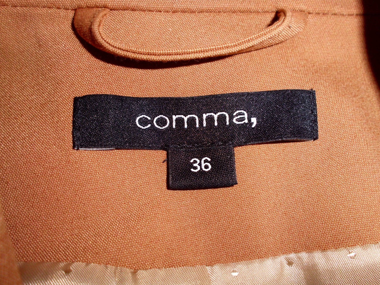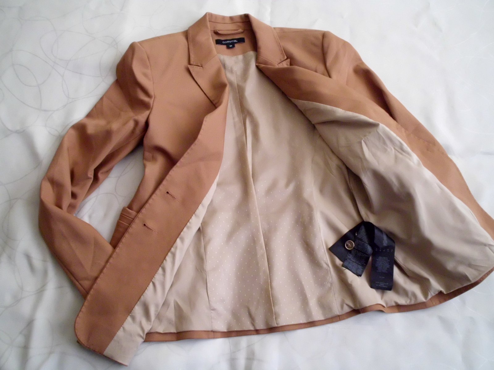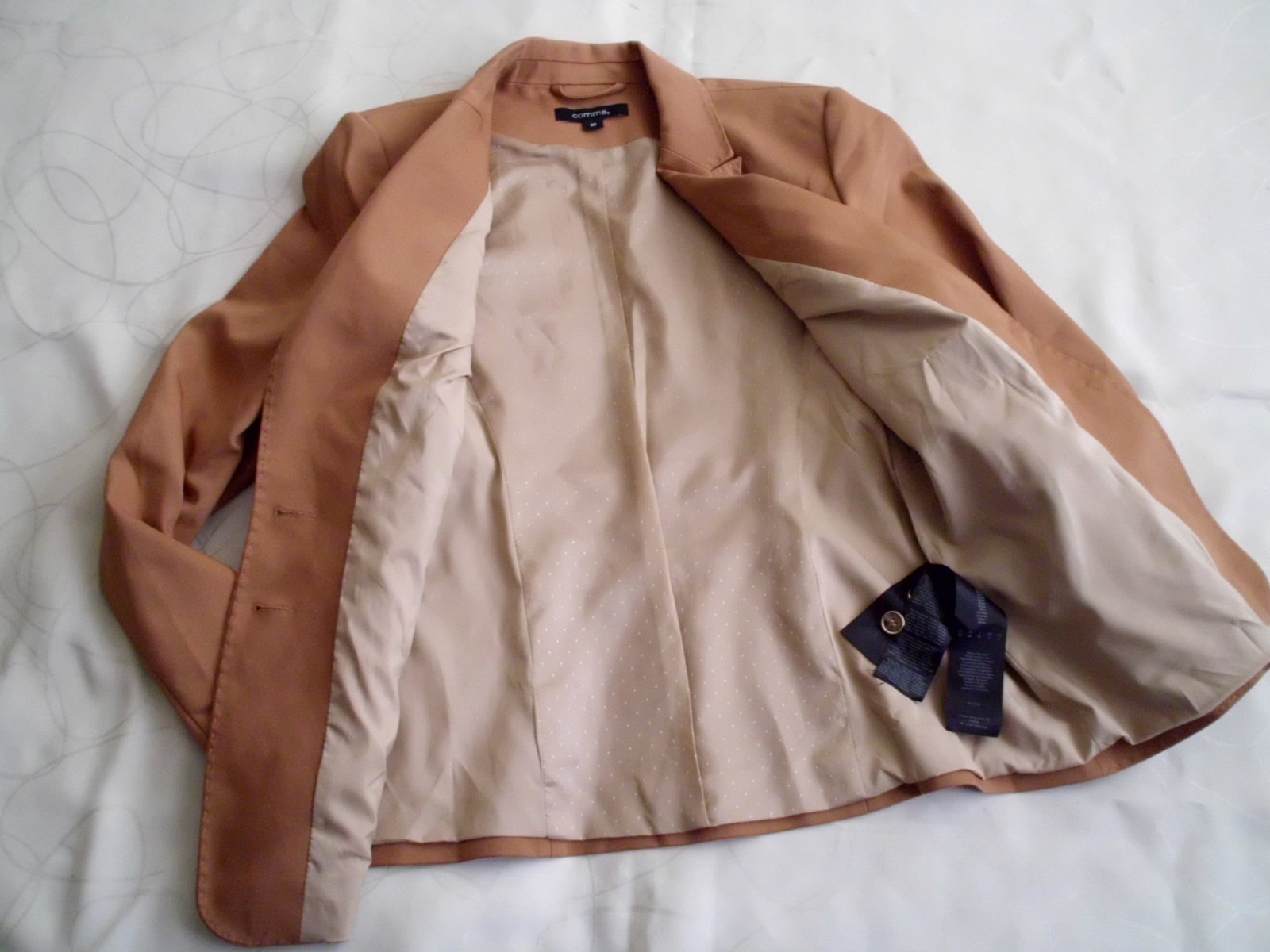 Predám dámske kvalitné sako Comma vel. S , dĺžka 57 cm, šírka 45 cm, rukáv 60 cm, celé podšité podšívkou pekne vypracované štepovanie , príjemný materiál zloženie na foto s elastan, 2 vonkajšie vrecká , pekná bledohnedá ťavia farba , 2x krát oblečené, 100% stav