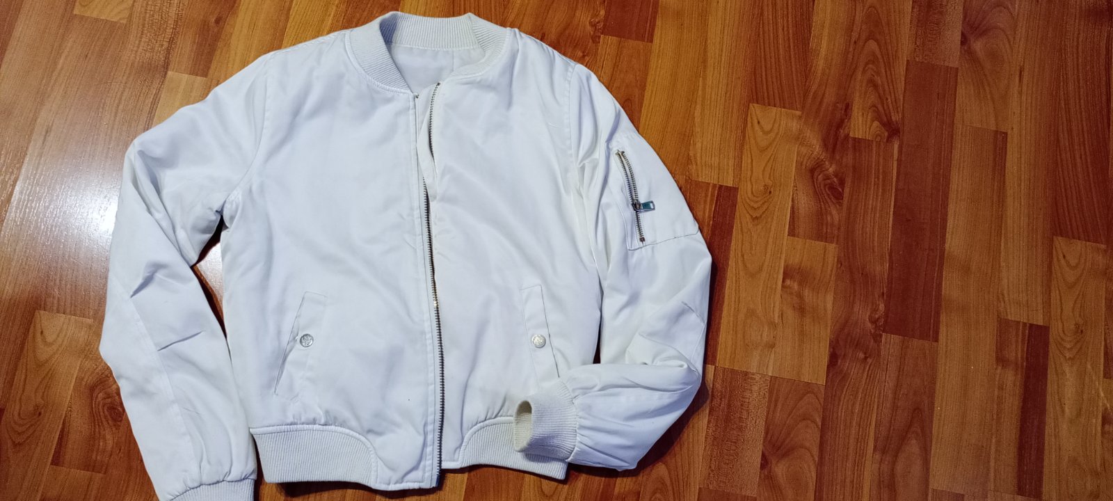Biela bunda Maduc dum velk. M. Dlžka 61 cm, šírka 2 x 50 cm, rukáv 72 cm od krku. Je podšitá, vpredu dolu dve vrecká a hore na zips dve vrecká.