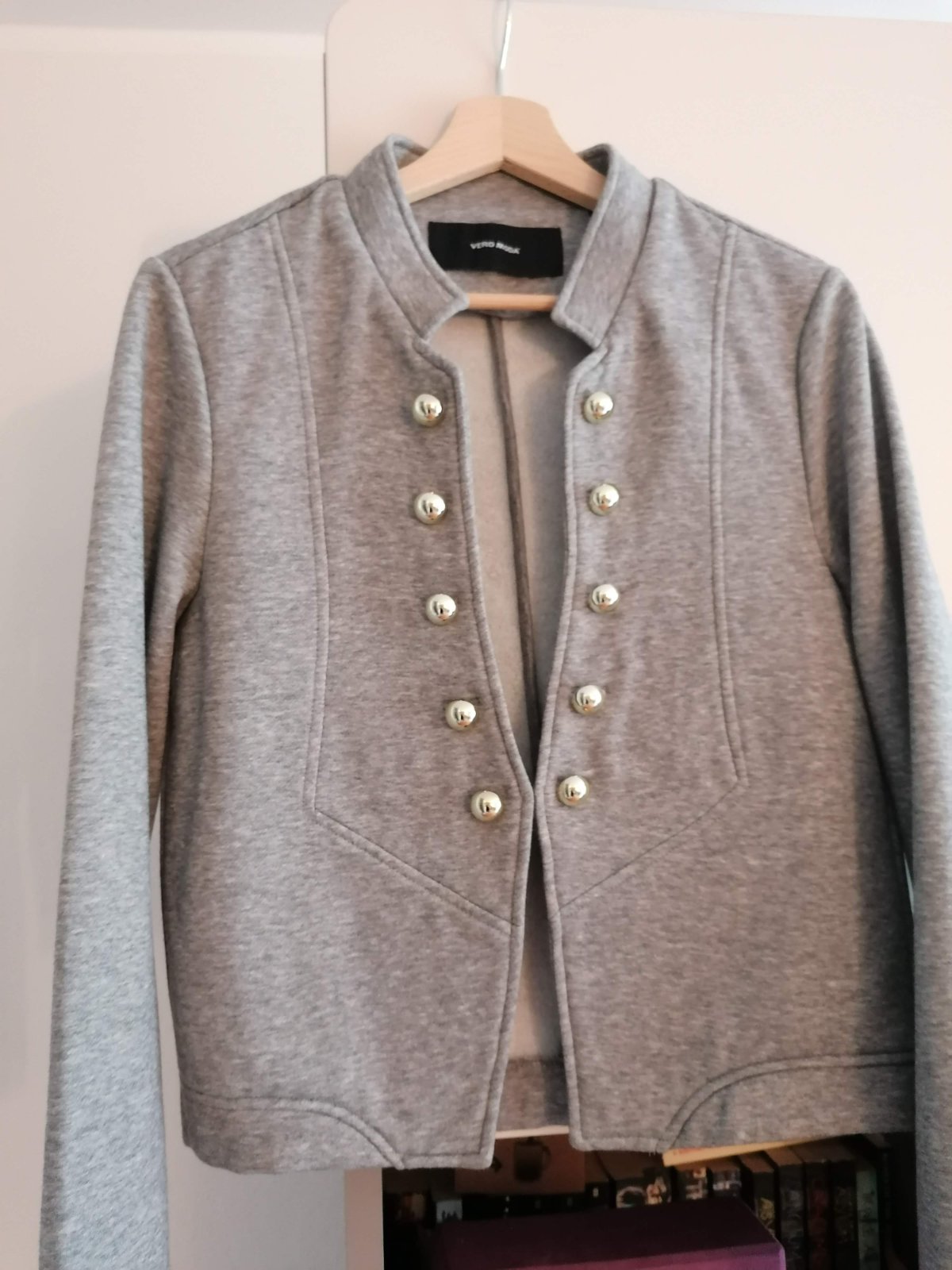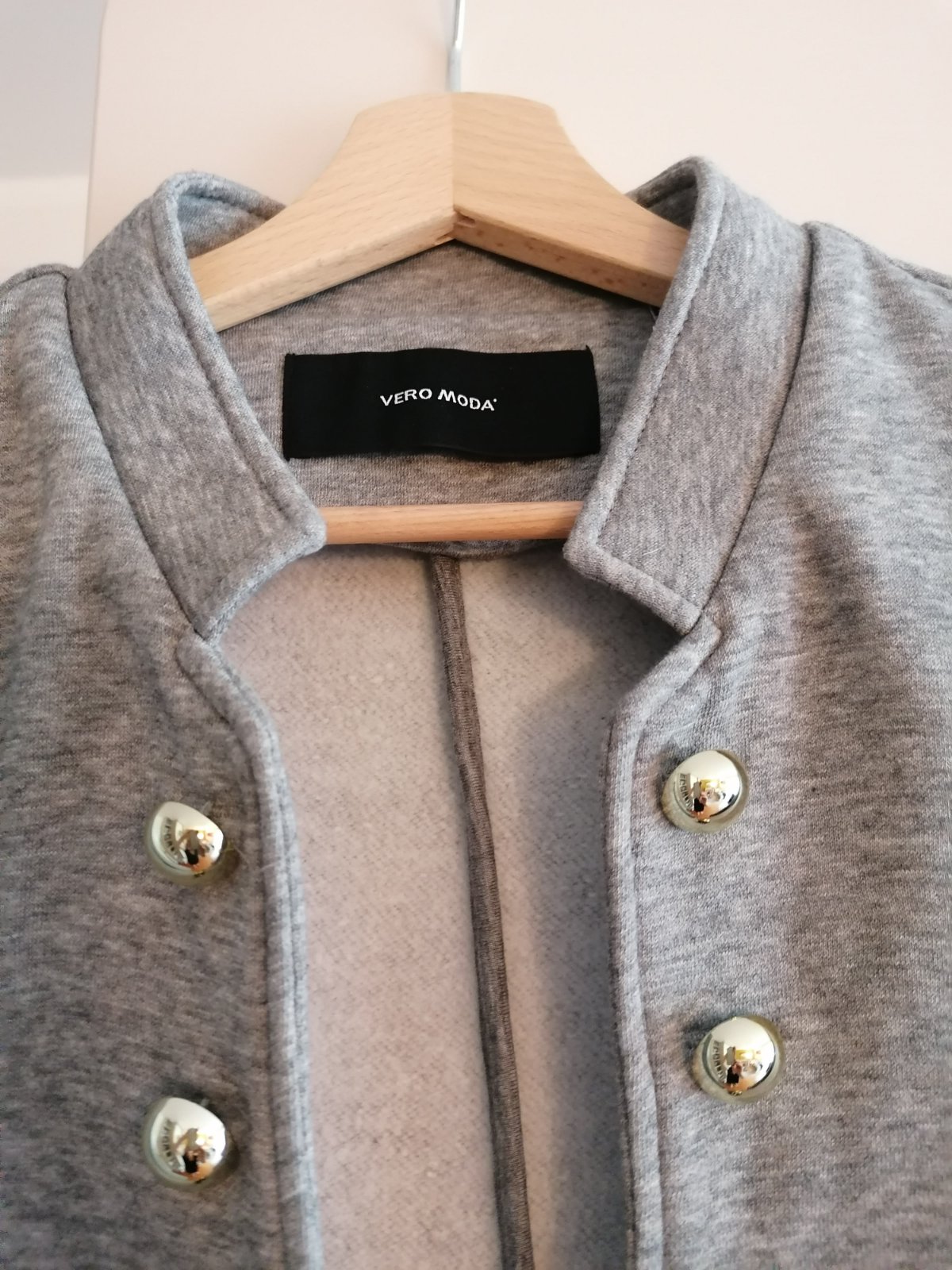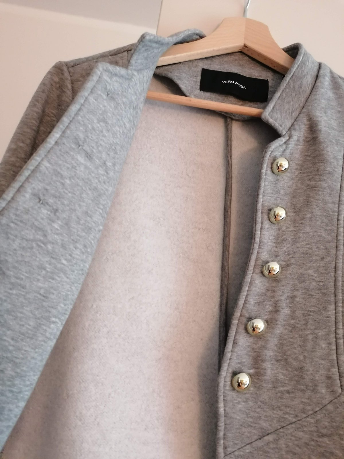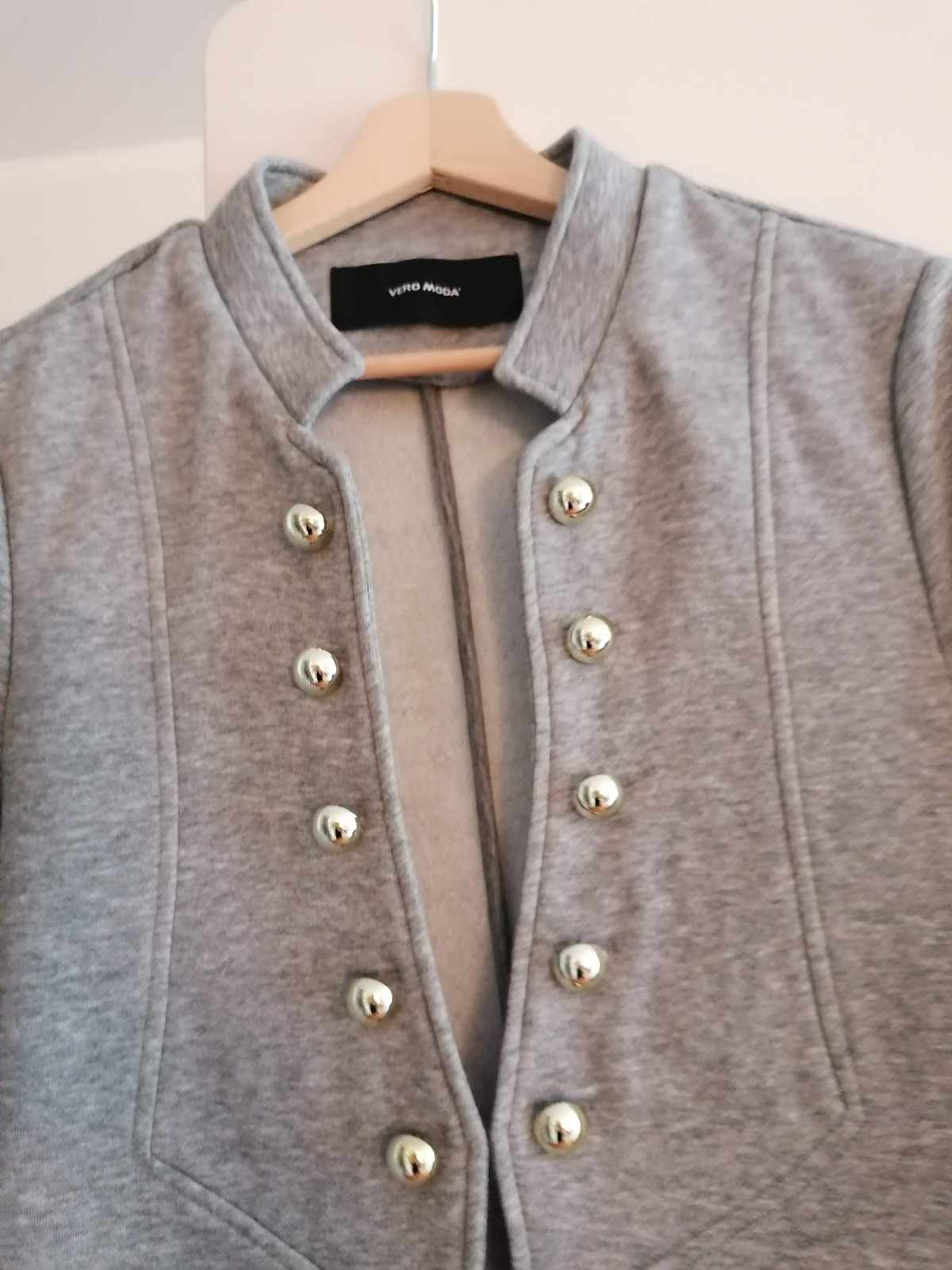 Značkové elegantné sako Vero Moda, jemne zateplené, veľmi príjemný materiál, 65% polyester + 35% bavlna, svetlošedá farba, ozdobné zlaté gombíky + 1 náhradný gombík, krásne sedí na postave, úplne nové, nenosené. Veľkosť 40/L, sedí skôr na veľkosť M, dĺžka 54 cm, pod pazuchami 49 cm, rukáv 62 cm, pôvodná cena 45 eur. Pozri ďalšie ponuky, viac kusov zľava 5-25%. Po zaplatení ceny a poštovného na účet posielam aj poštou.