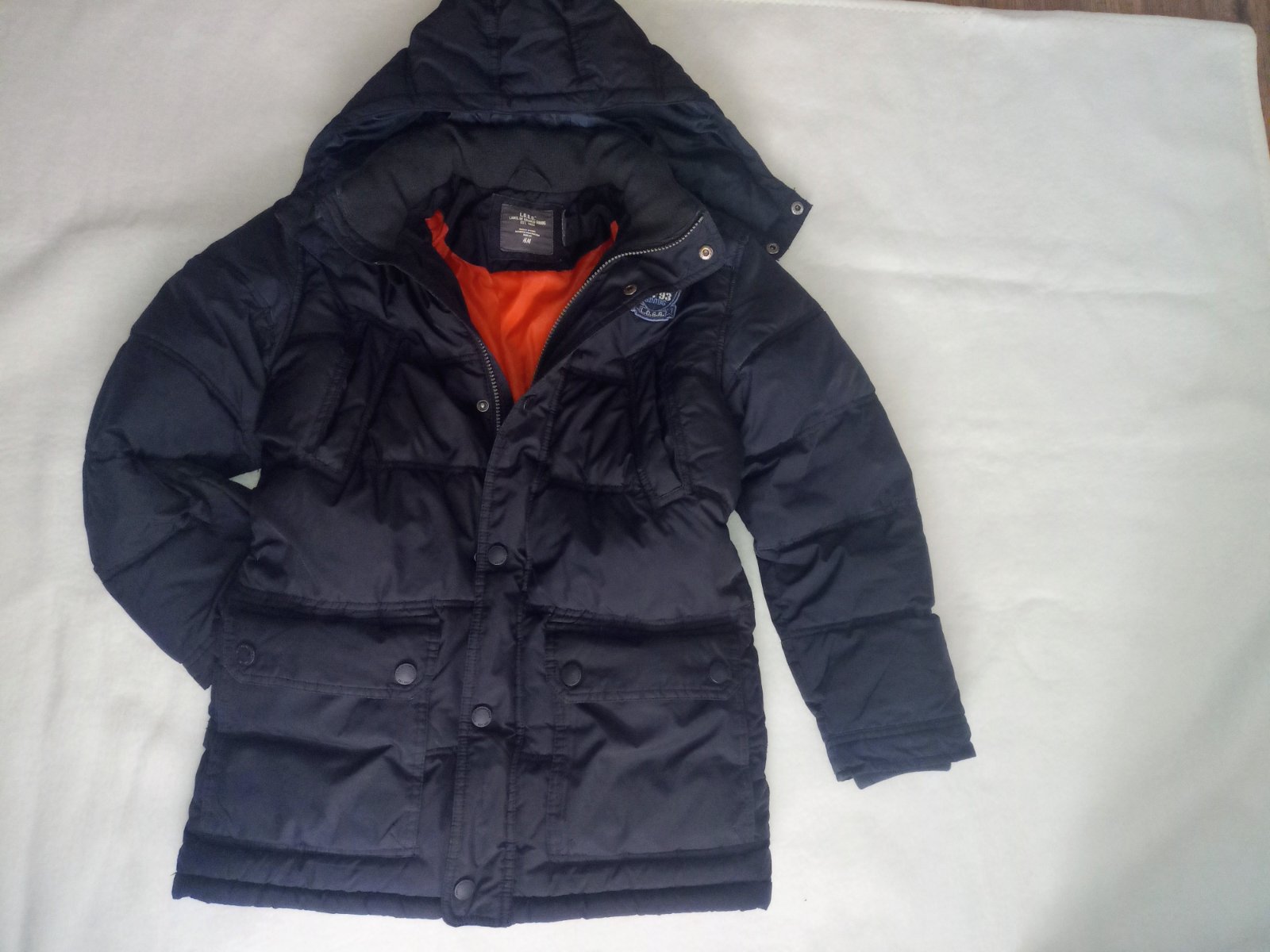 Prečítaná bunda prechodná ale aj na teplú zimu. Bez poskodeni. Rozmery na fotkach. Na fotke ma syn 10,5r. Zn.H&M. Cena 9e.