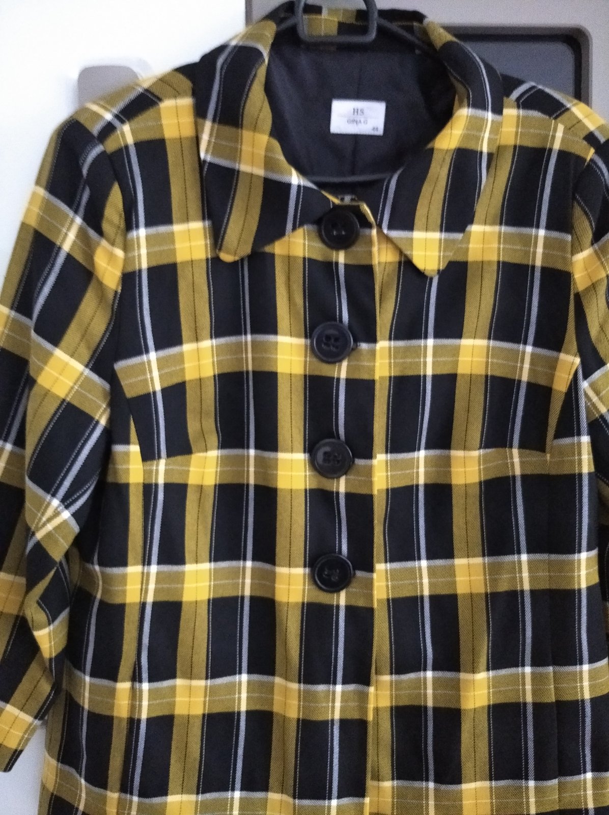 Nosený kabát. Mne je už veľký. Je smerom k pásu rozširovaný. Ja som ho nosila ako tehotná. Nič mu nie je. Dĺžka kabáta 71 cm, pod pazuchami 54 cm.