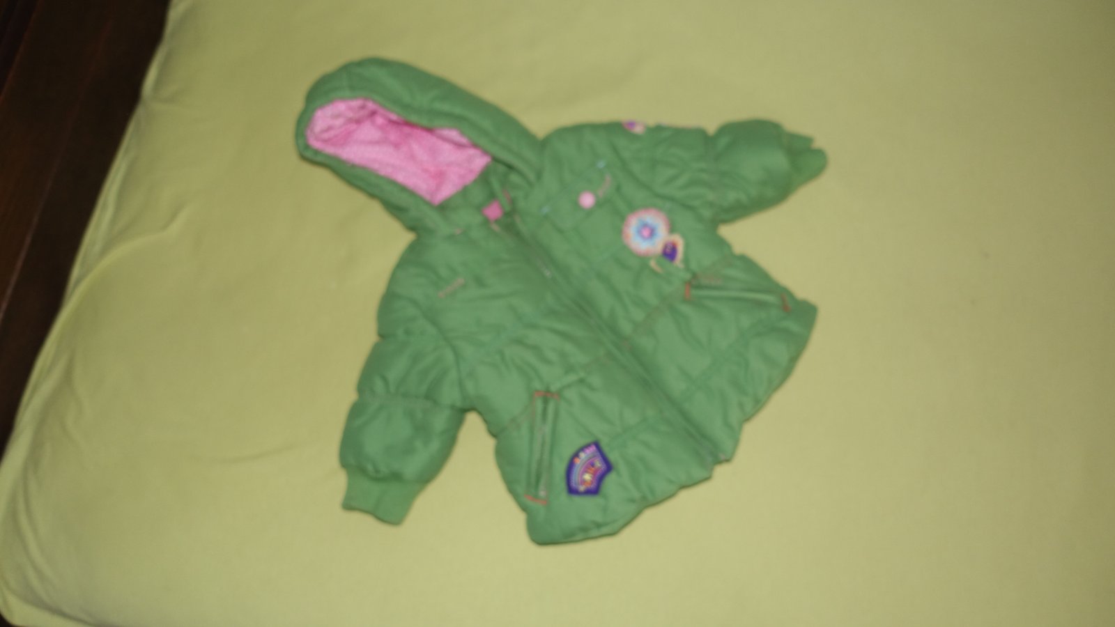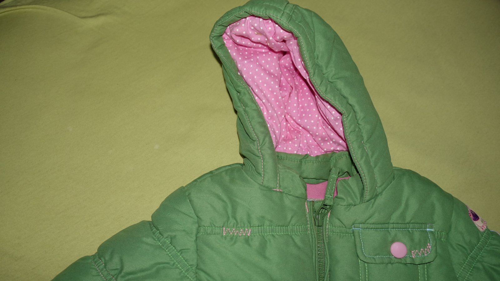 Nadherna zelena bundicka z vtacikovej kolekcie vo velmi dobrom stave. Zelena je nadherna- ako zelene jablko. Je podsita flisom a hruba- na zimu.