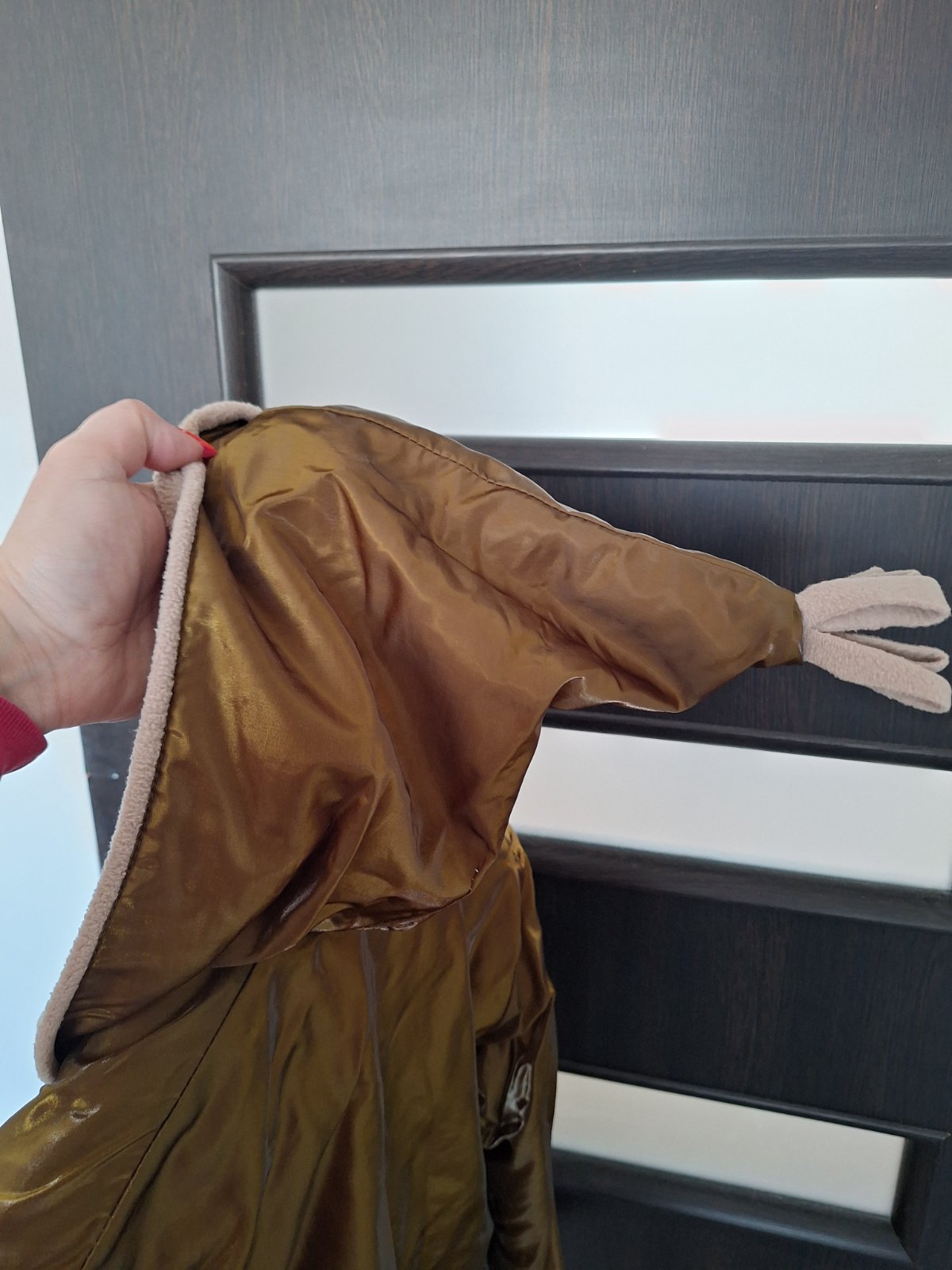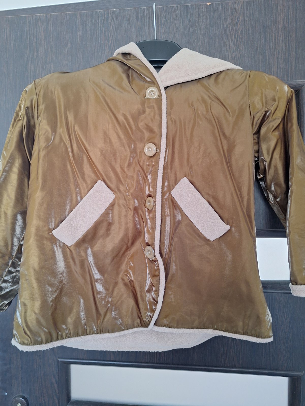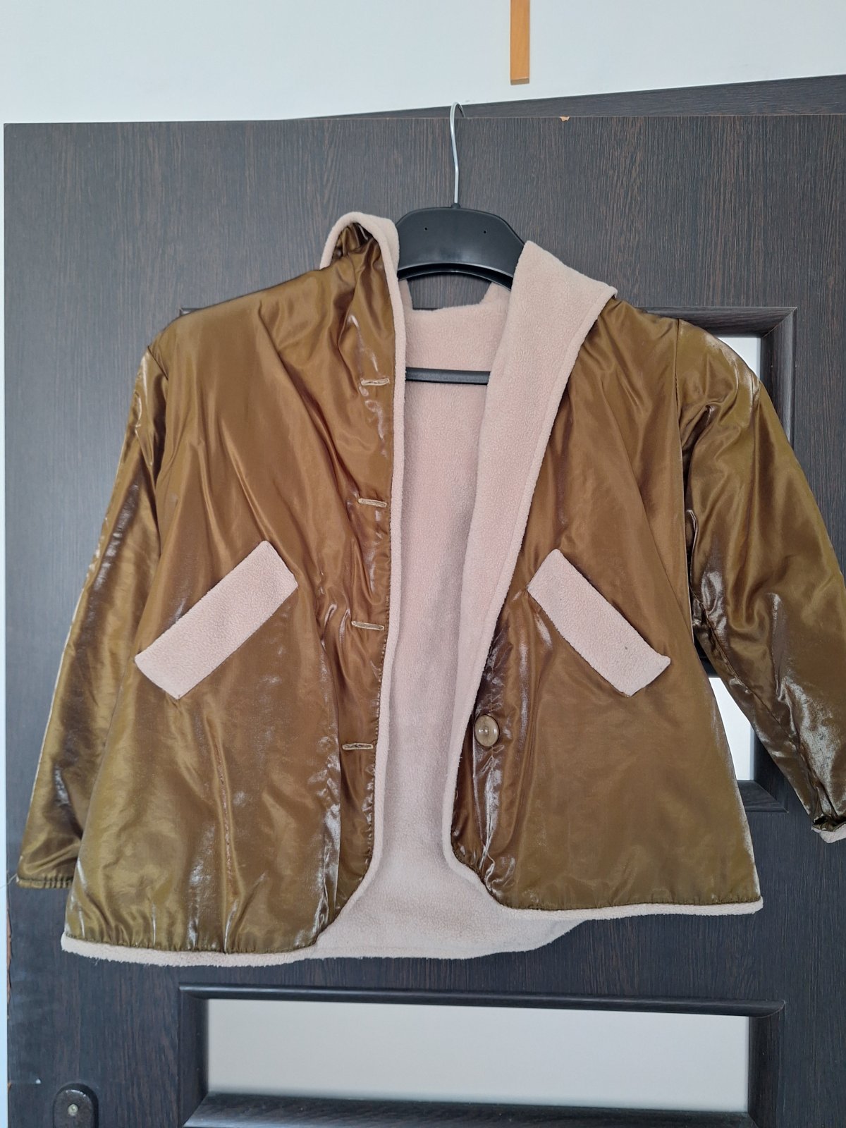 Nosené kabátik, či na miernu zimu alebo prechod vo vnútri je zatepleny povrch je akoby koženky, veľmi elegantný, v.odhadom 122, pod pazuchami 45cm q dĺžka od ramena 50cm, cena 9€ plus poštovné