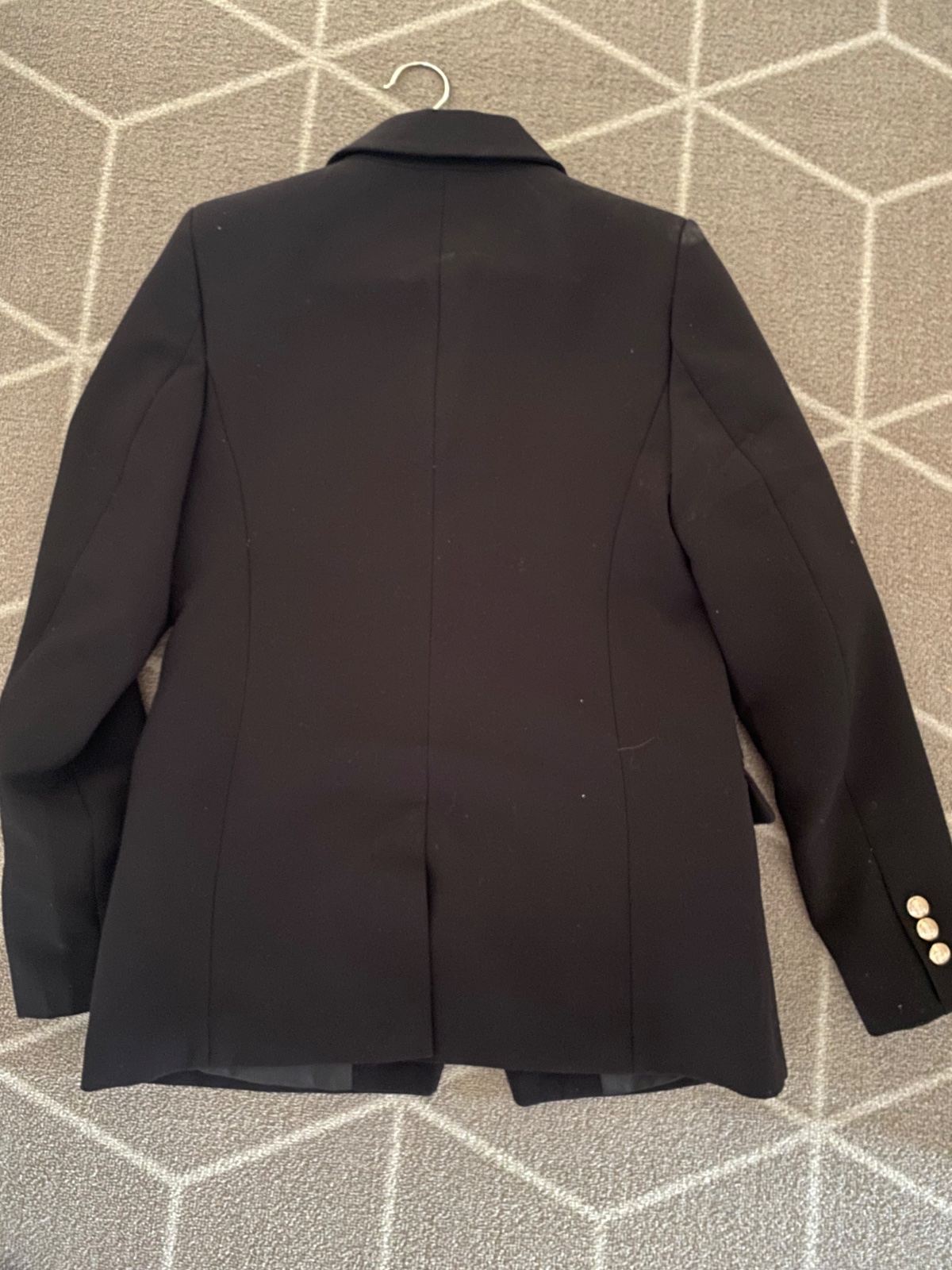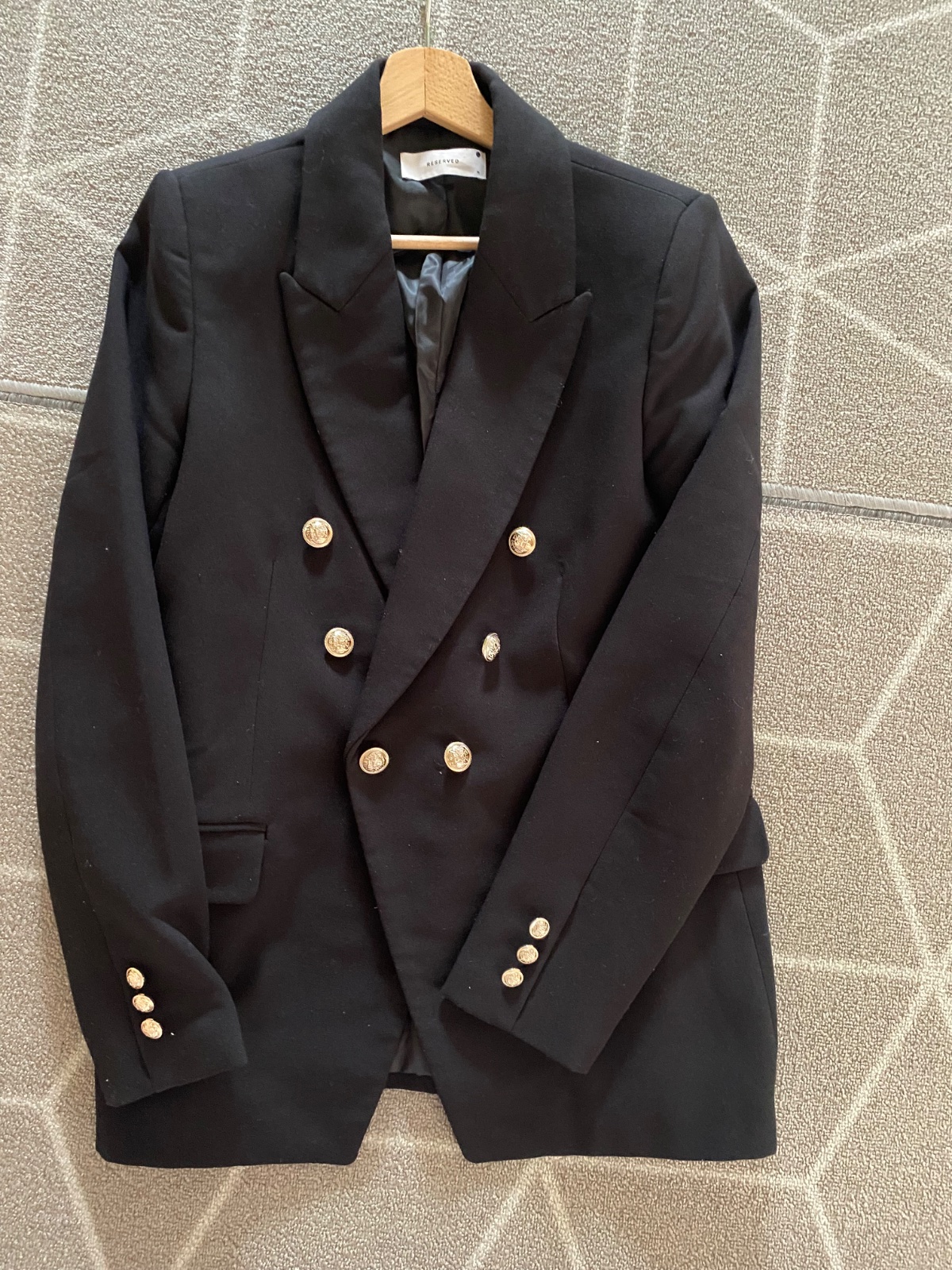 Sytocierne sako Reserved M , so zlatými gombikami , aj na rukávoch . Zapínanie na 1 gombik zvonka a 1 neviditeľný zvnútra . Pekne pasuje na postavu . Nosene 1 sezónu . Zvnútra natrhnuta podsivka v mieste pazuchy, inak všetko na výbornú .