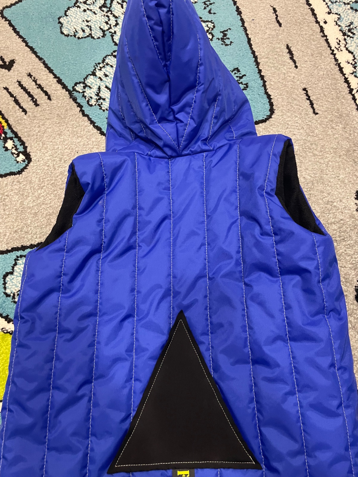 Farba: stredne modrá+čierna. Rozmery: Od krku po dolný kraj 45cm. Polovica obvodu hrudníka 38cm. Bez poškonia, málo nosená.