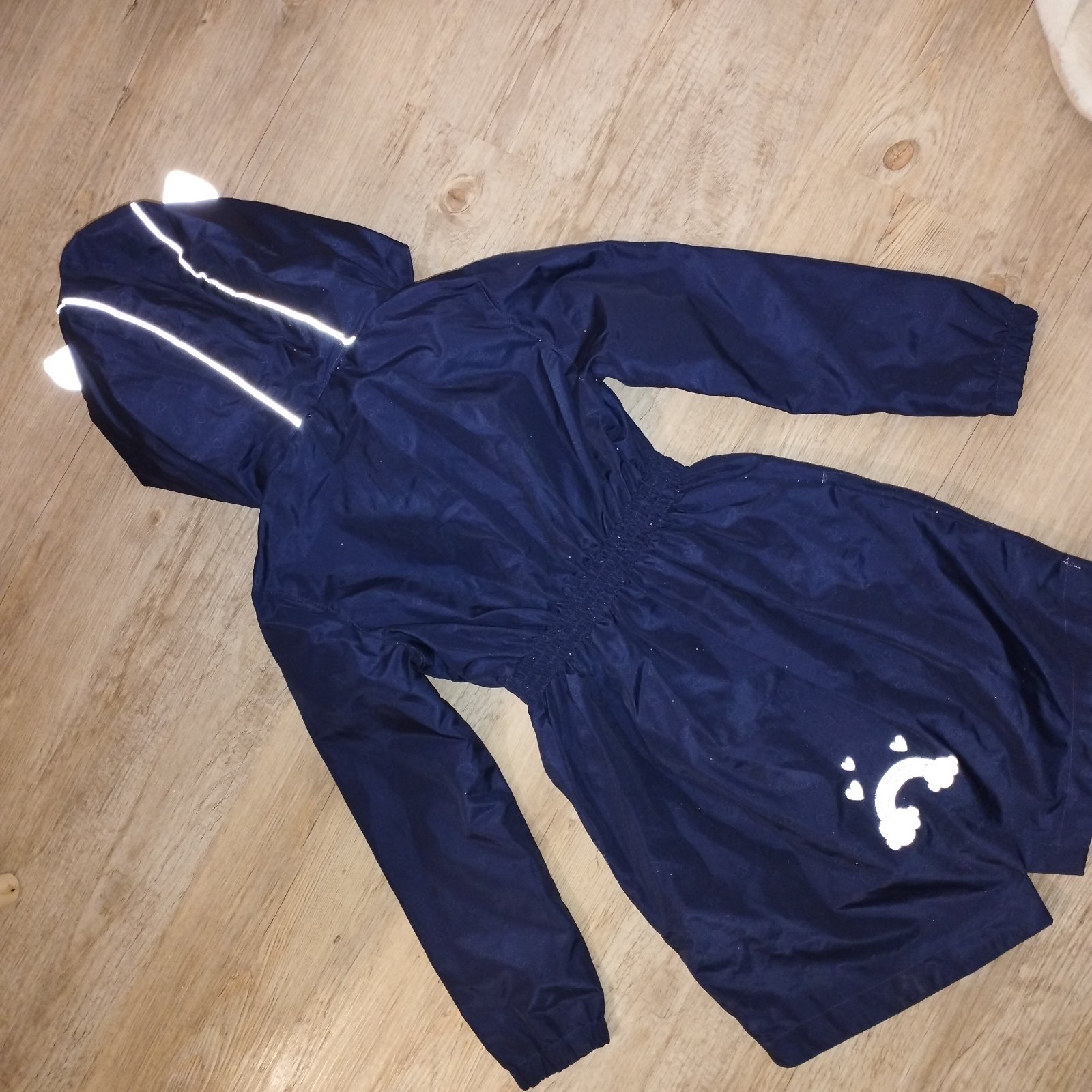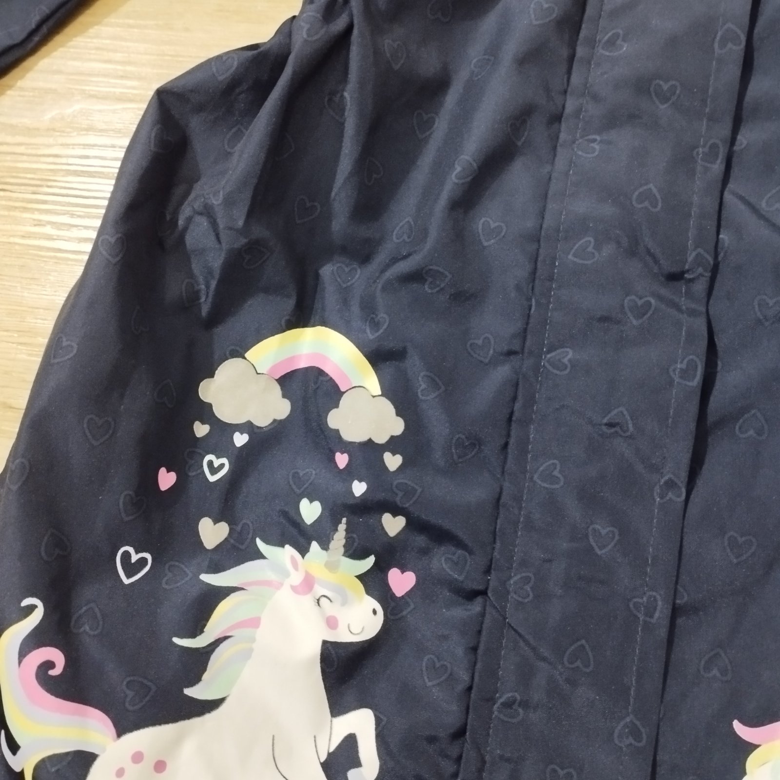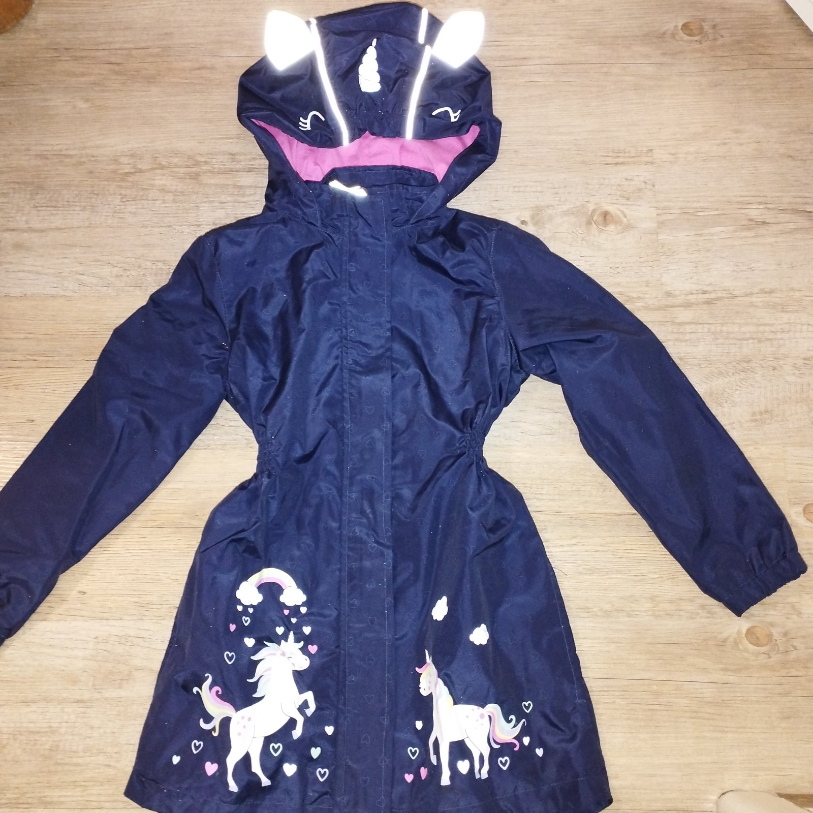 Krásna tmavomodrá tenká bundička - kabátik jednorožec s reflexnými prvkami, veľkosť 116 oblečená len párkrát