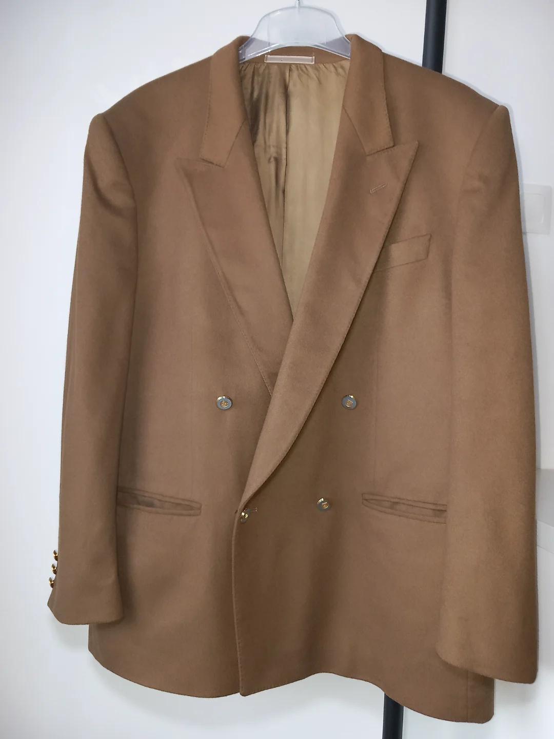 Vlnené dvojradové sako v camel farbe (tmavá béžová až svetlohnedá). Sako je pánske, ale skvele sa hodí aj do šatníka dámam ako oversize kúsok.