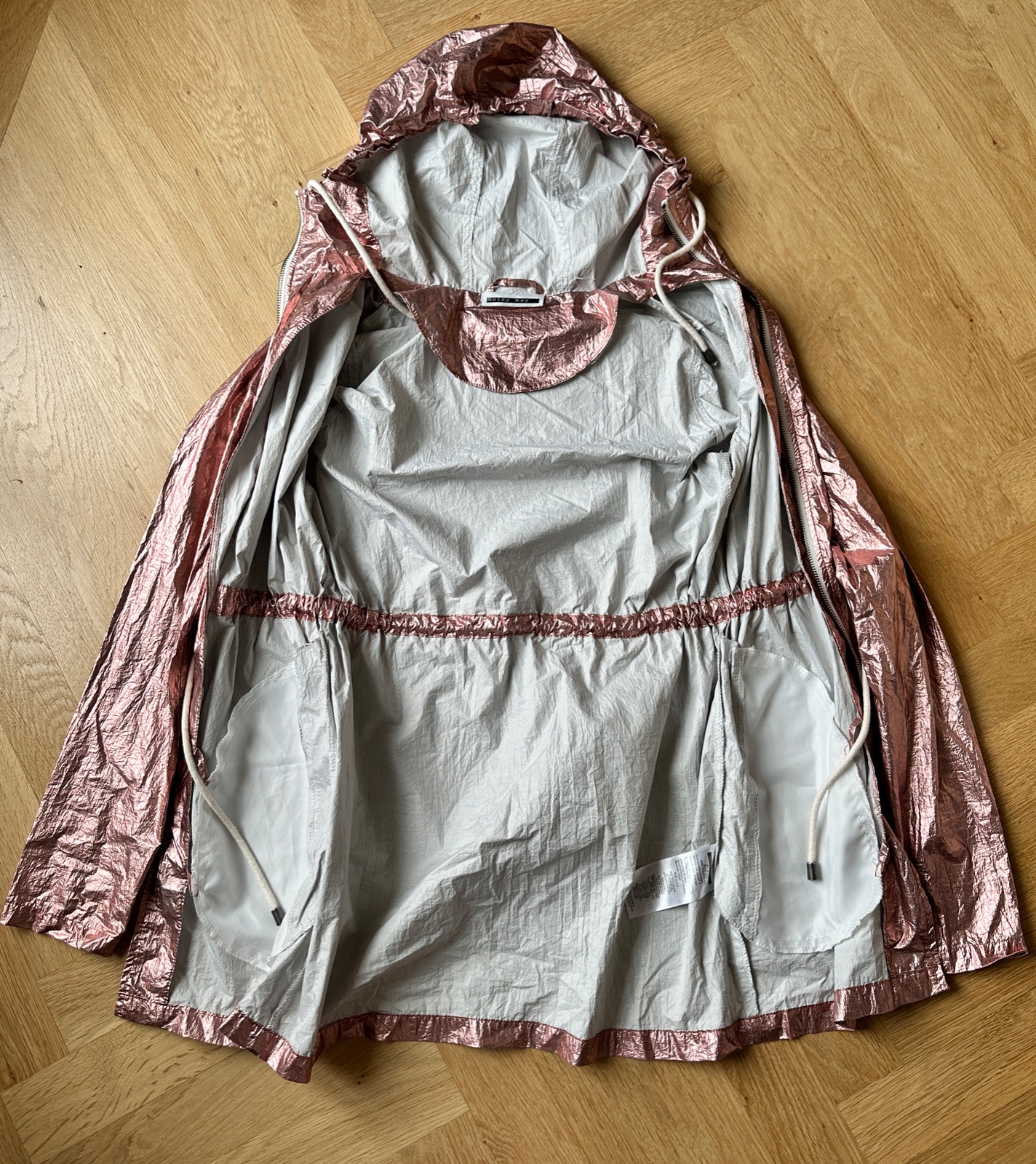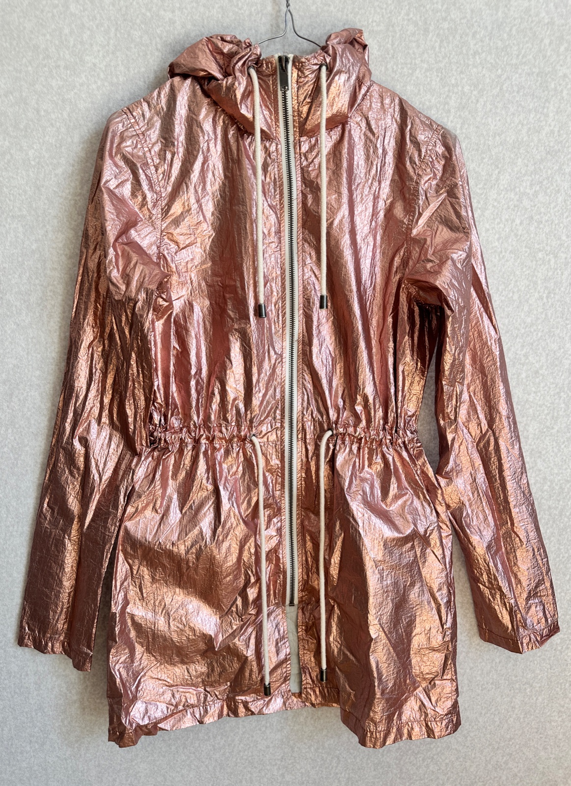 Ľahká prechodná bunda v metalickej ružovej. Kapucňa, uško na zavesenie, bočné vnútorné vrecká.