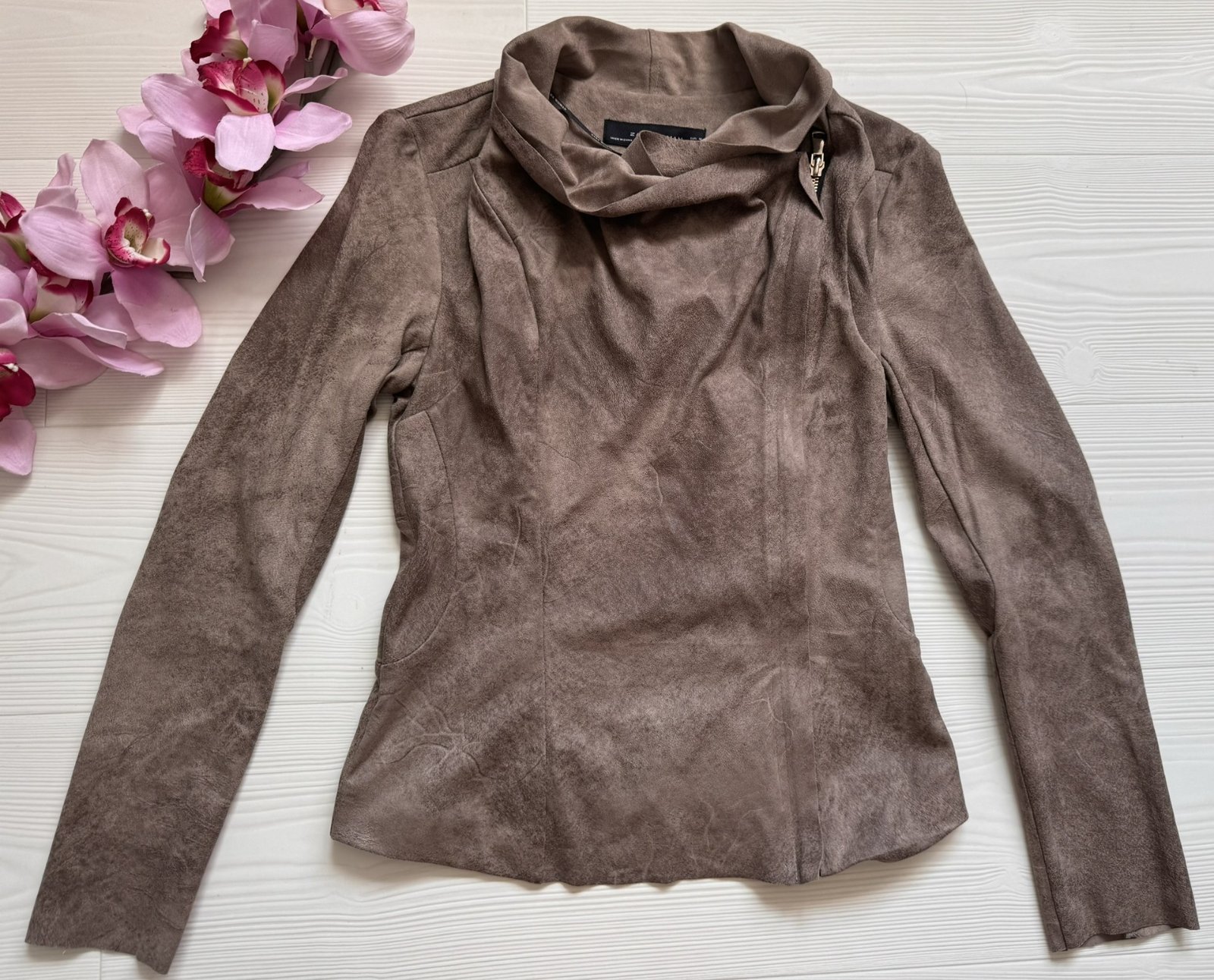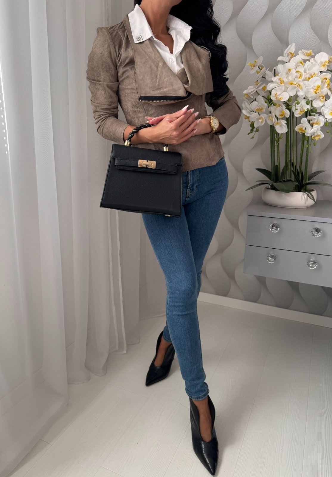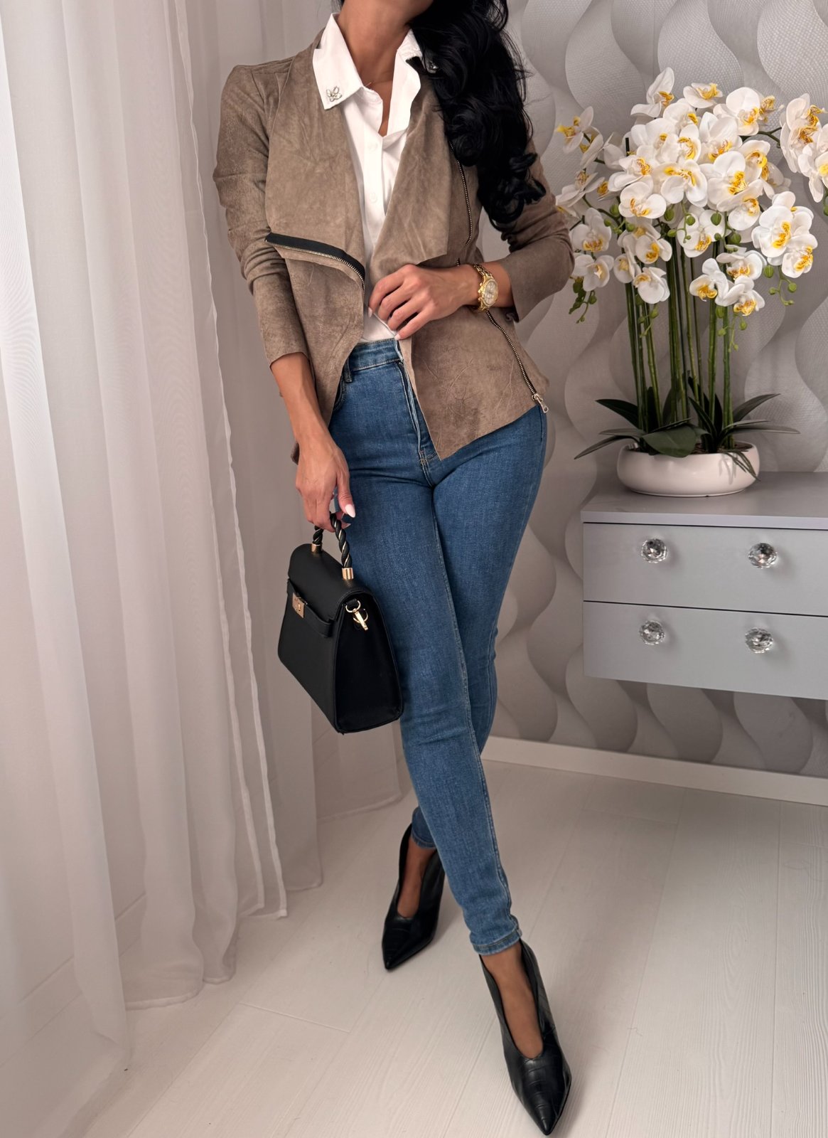 Prechodná semišová bunda na viacero spôsobov nosenia.