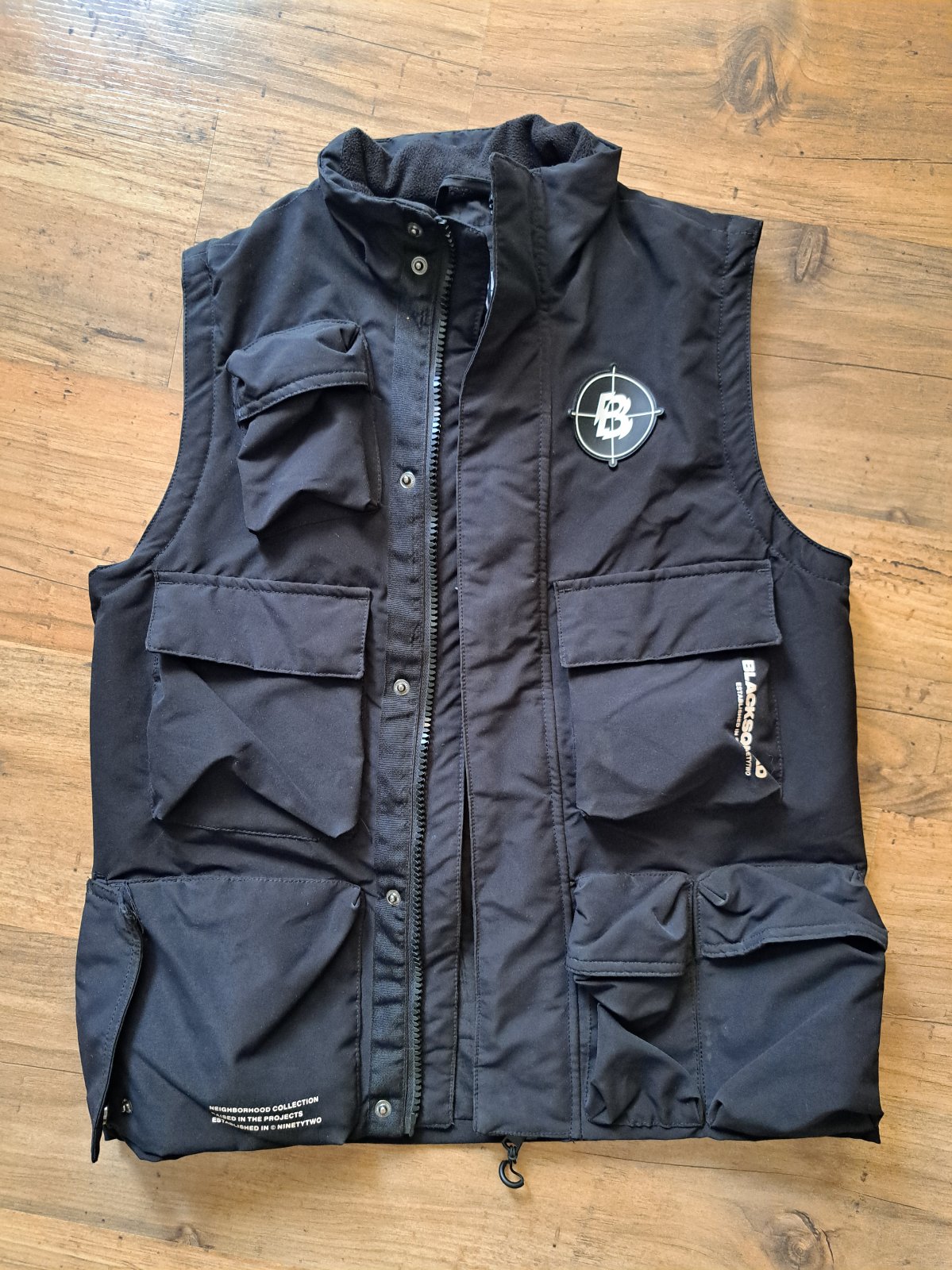 Minimálne nosená, super stav, dve náprsné vrecká na zips, dve bočné vrecká na zips. Dĺžka od pleca 55, šírka cez hruď 47cm. Váha 400g.