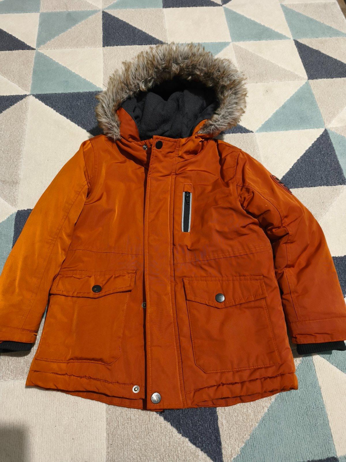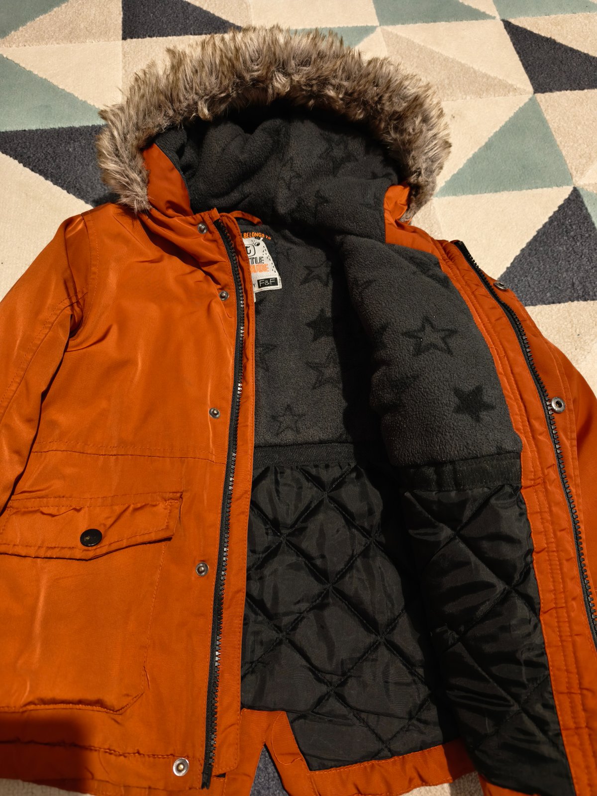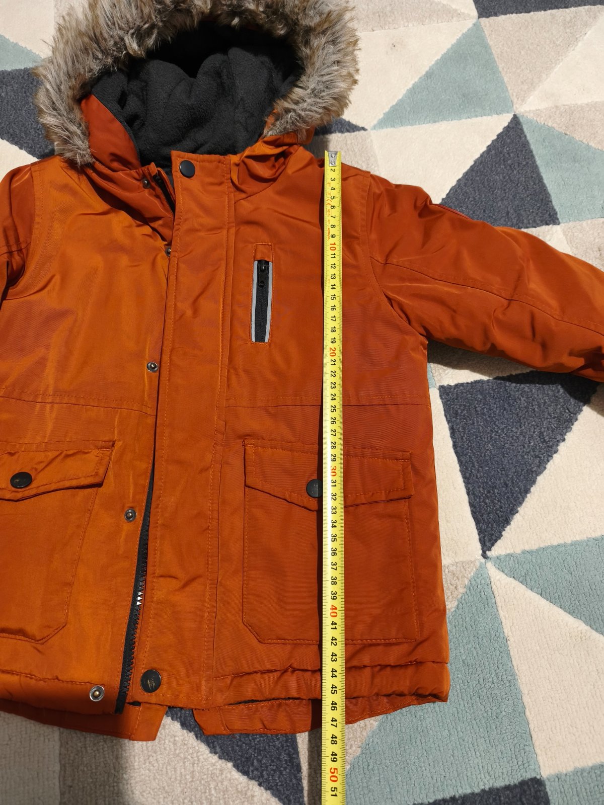 Teplý kabát s kožušinou nepremokavý Reserved Nízky stojacik, zapínanie na zips, hladká podšívka a nepremokavá látka Krásna farba Jantárová Veľkosť 116 PC 49,99€ R4/116 R6/116