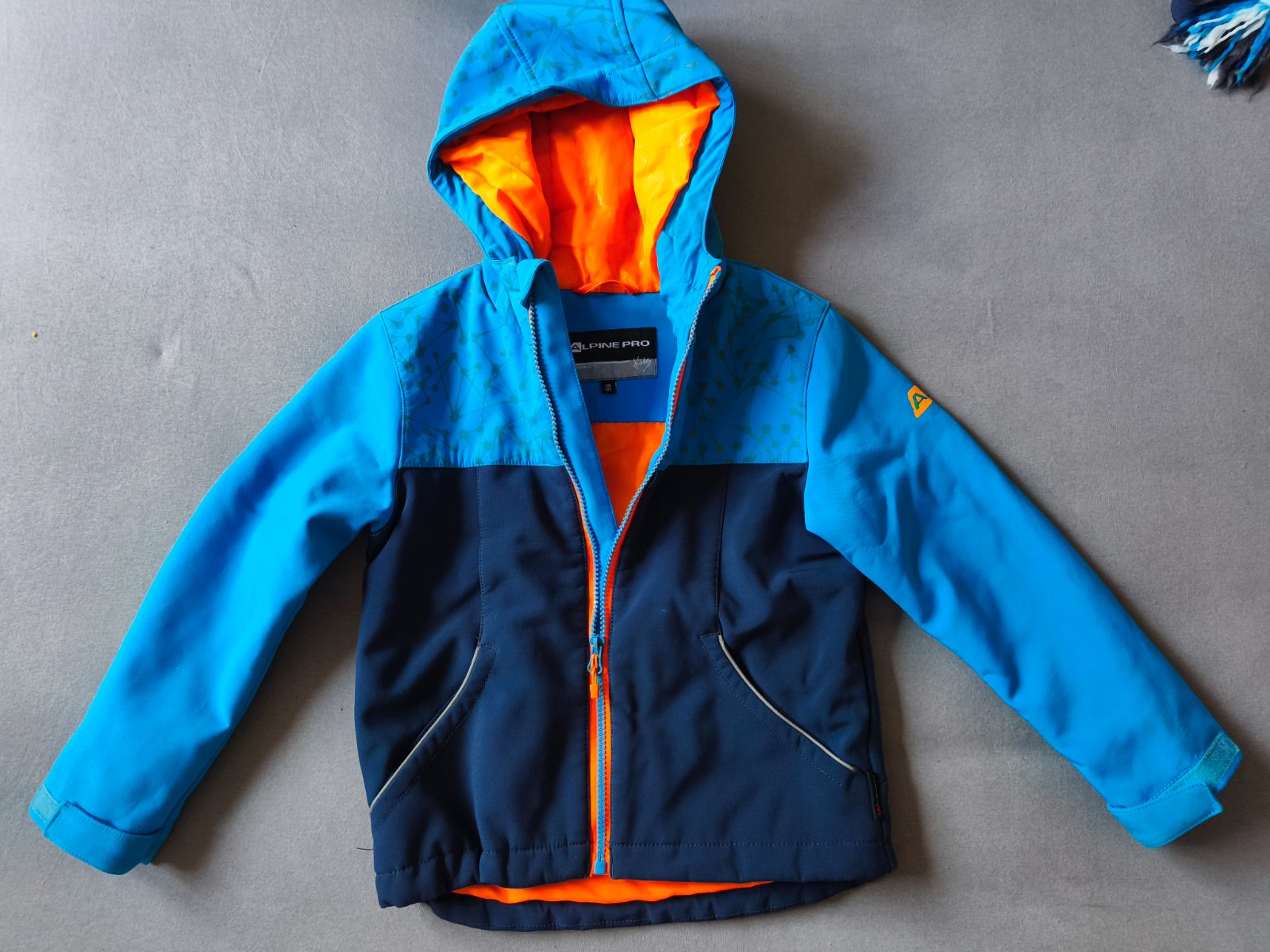 Písané číslo 128 ale menšia. Dĺžka 50 cm, šírka pod pazuchami 42 cm, rukáv od kapucne cca 53 cm. Podšitá látkou, kapucňa sa dá schovať do goliera. Pár svetlých fľakov, zohľadnené v cene
