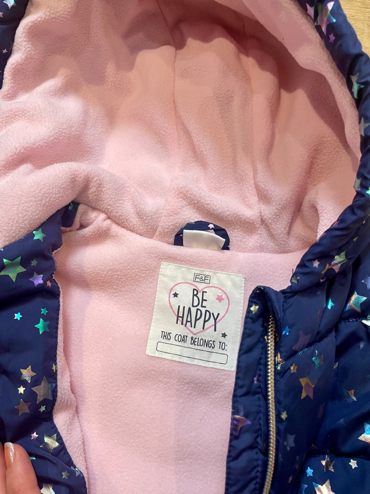 Teplá prešívaná bunda s kapucňou a dúhovými srdiečkami. Párkrát vzatá, bez poškodení. Na vnútornom štítku je napísané meno. Rozmery: - celková dĺžka: 37cm, - hrudník: cca 33cm.